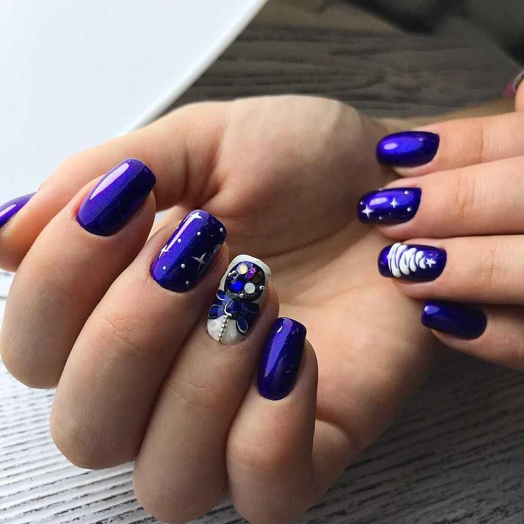 Начнем с трендового цвета последних лет, который по совместительству еще и отлично гармонирует с Водяным тигром. Все оттенки синего и голубого будут уместны, причем можно сделать как однотонный маникюр, так и комбинировать синий с другими оттенками.