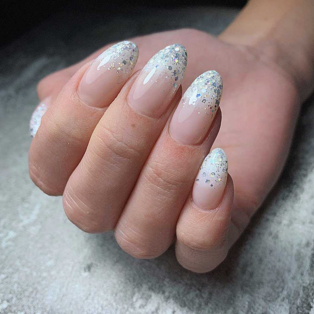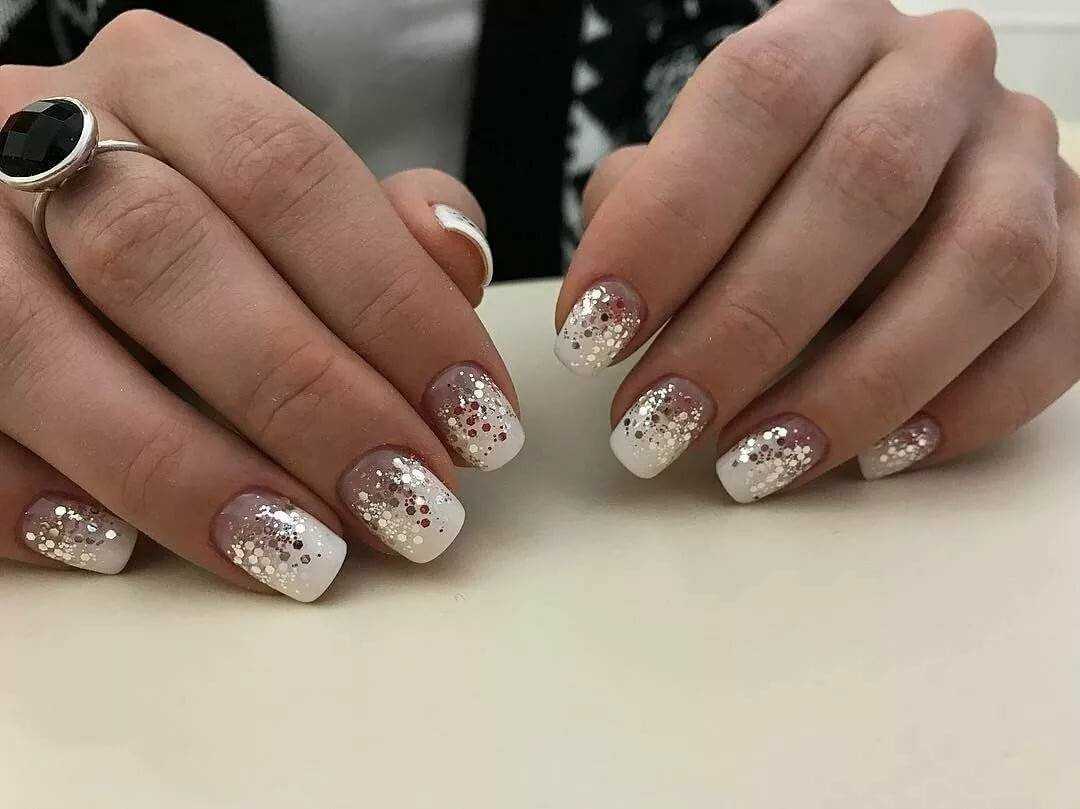 Классический вариант — френч с блёстками или же втиркой, выполненной аккуратно на кончиках ногтевой пластины, будет как нельзя кстати.