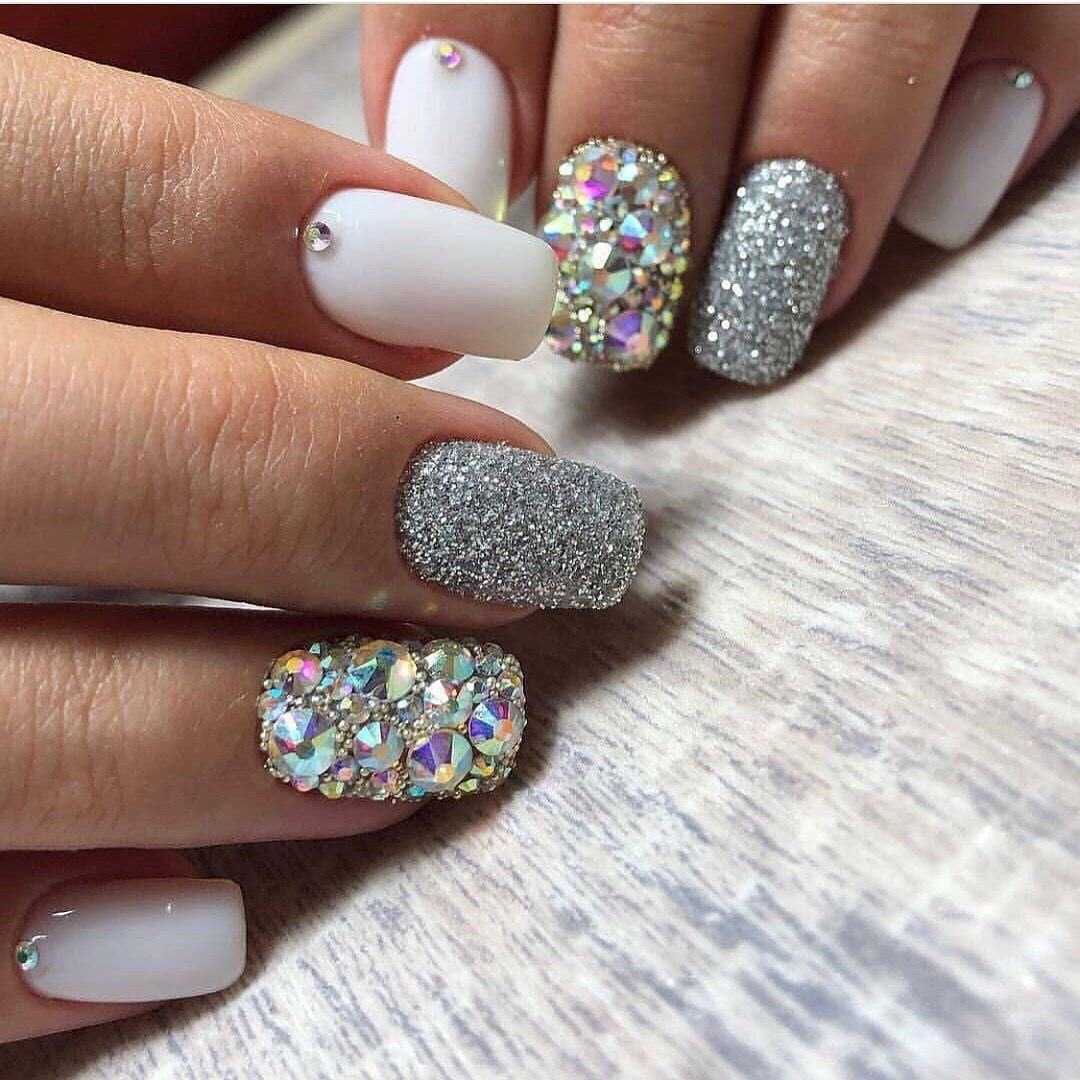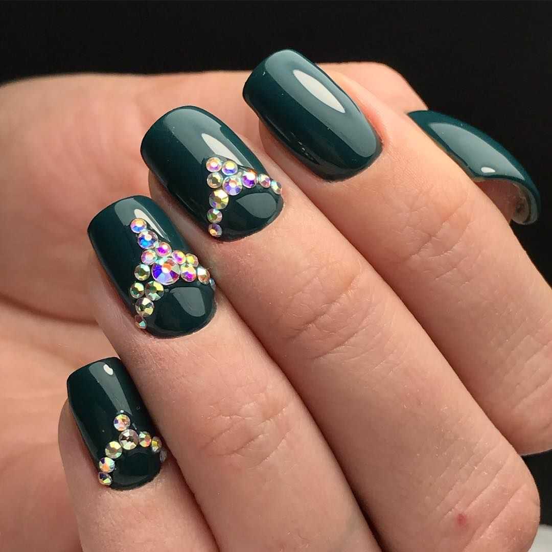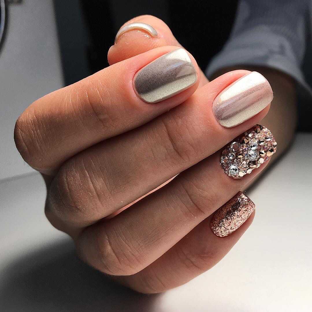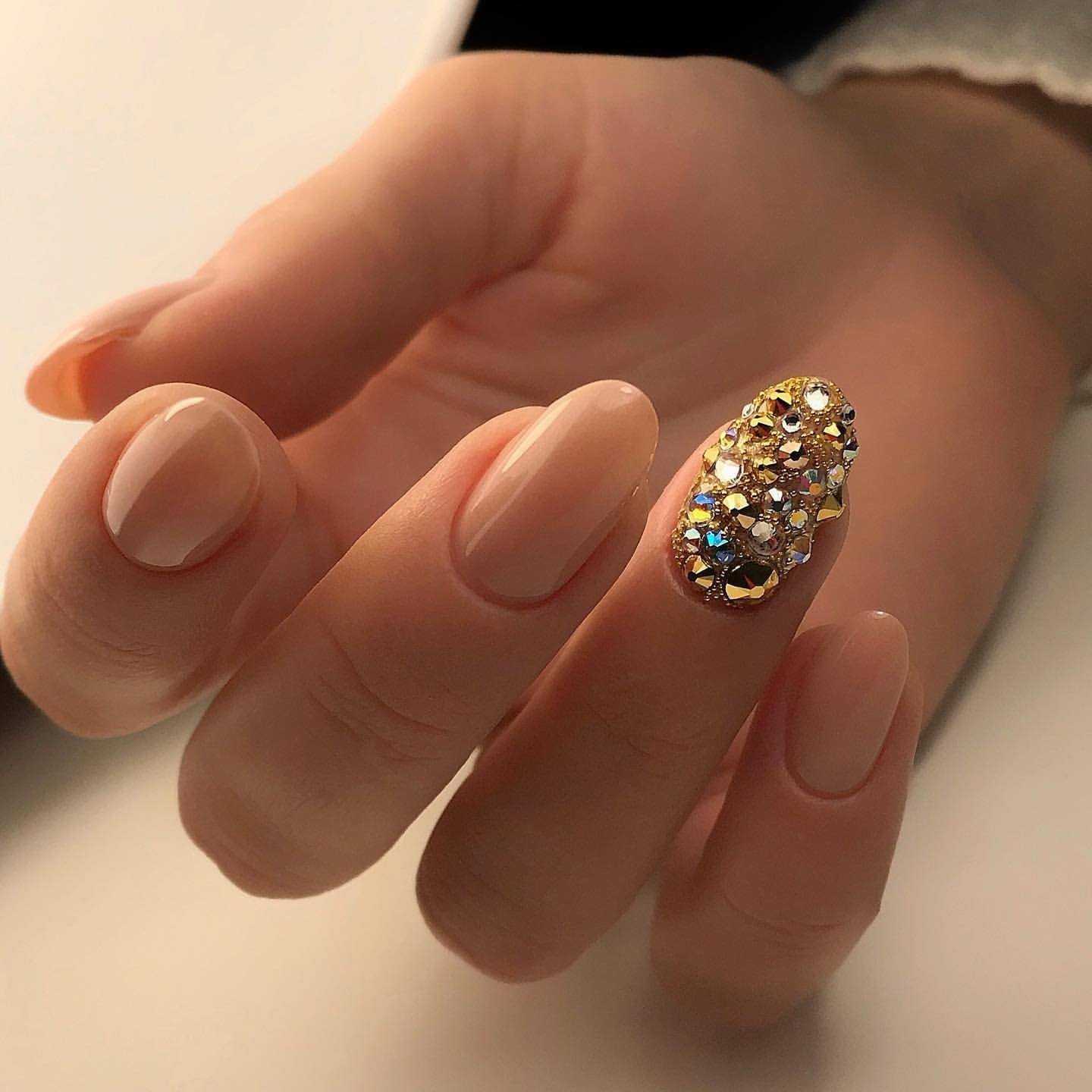 Хотите новогодний маникюр с блестками? Используйте стразы и крупные фольгированные блестки, и тогда торжество, знаменующее 2021 год, запомнится вам искрящимся. Несколько крупных страз вразнобой на ногтях — это интересно, а также вы можете сделать красивый маникюр на короткие ногти с рисунком из стразиков.