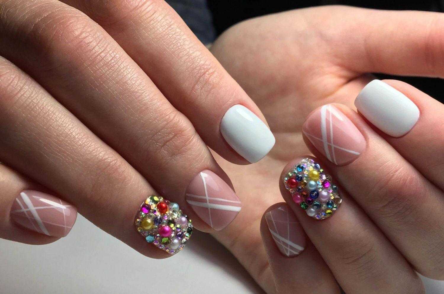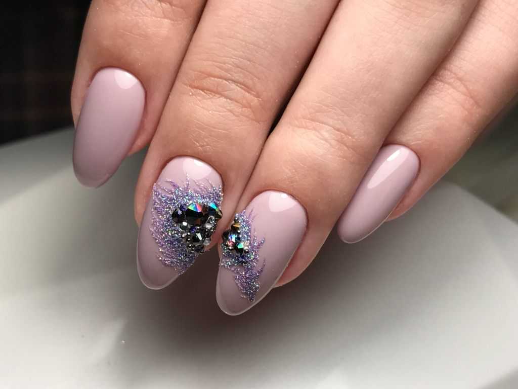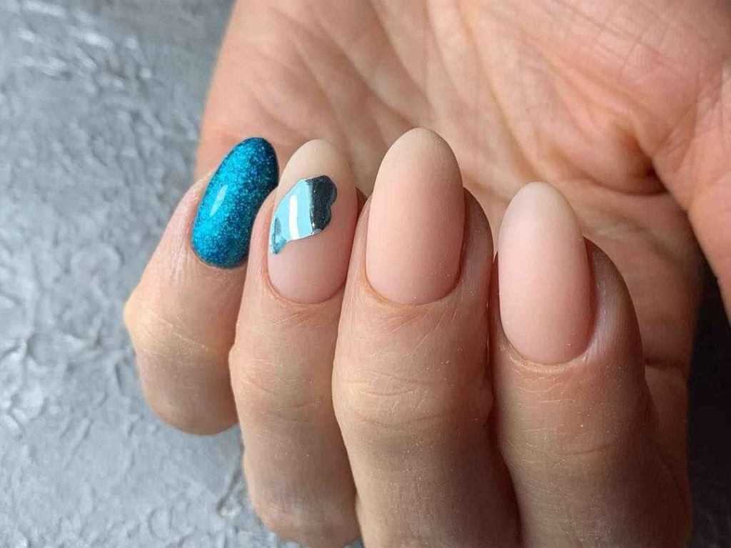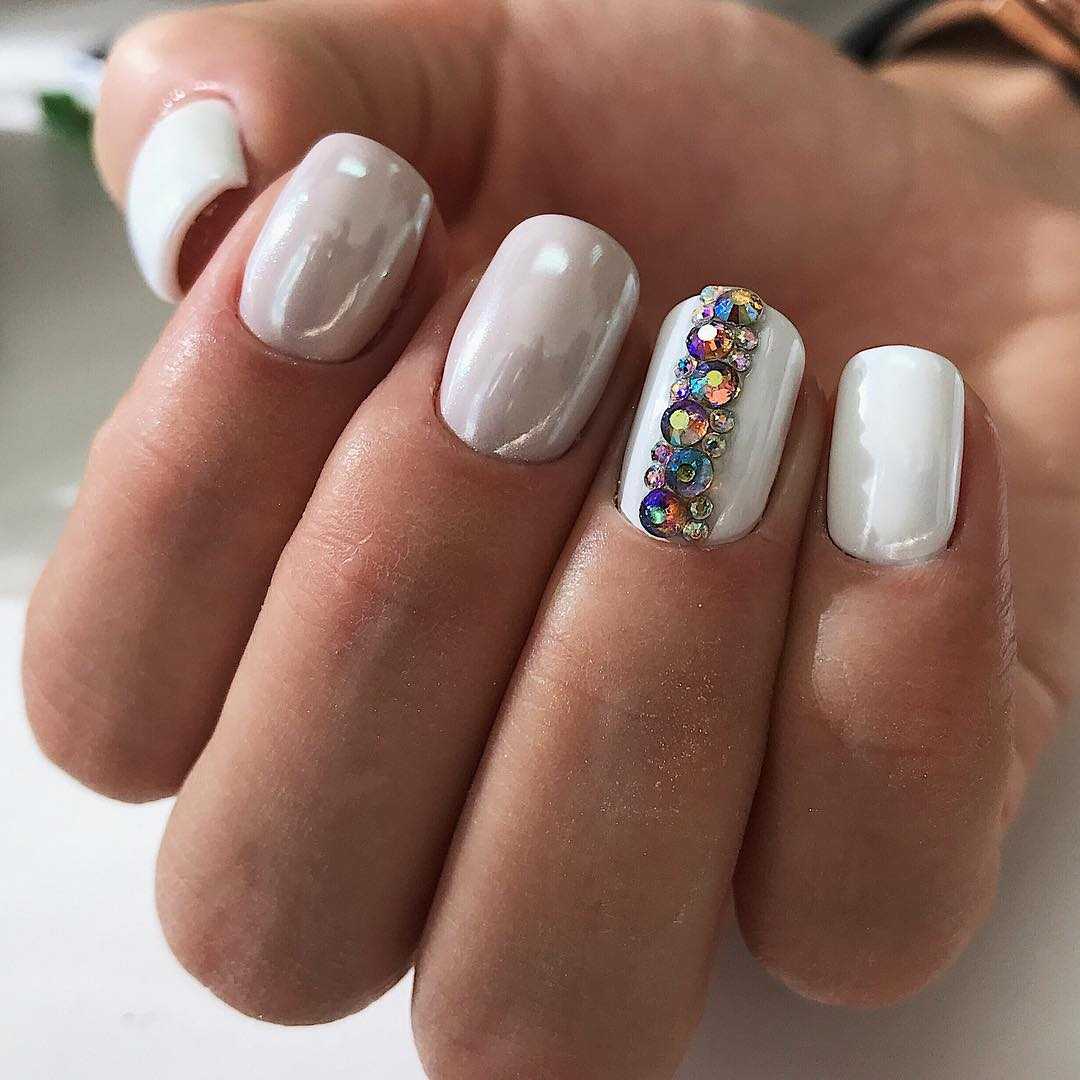 Хотите новогодний маникюр с блестками? Используйте стразы и крупные фольгированные блестки, и тогда торжество, знаменующее 2021 год, запомнится вам искрящимся. Несколько крупных страз вразнобой на ногтях — это интересно, а также вы можете сделать красивый маникюр на короткие ногти с рисунком из стразиков.