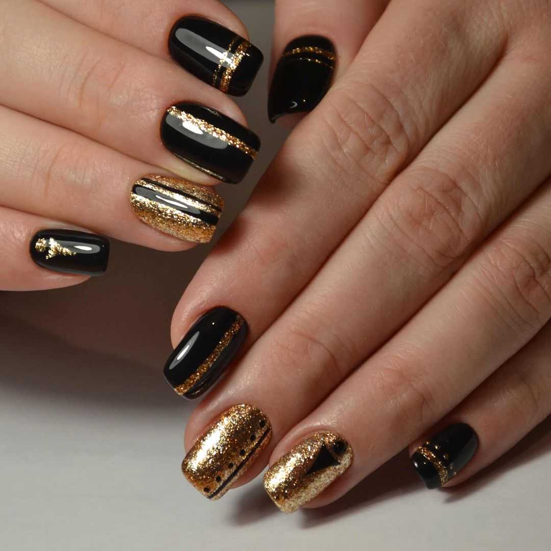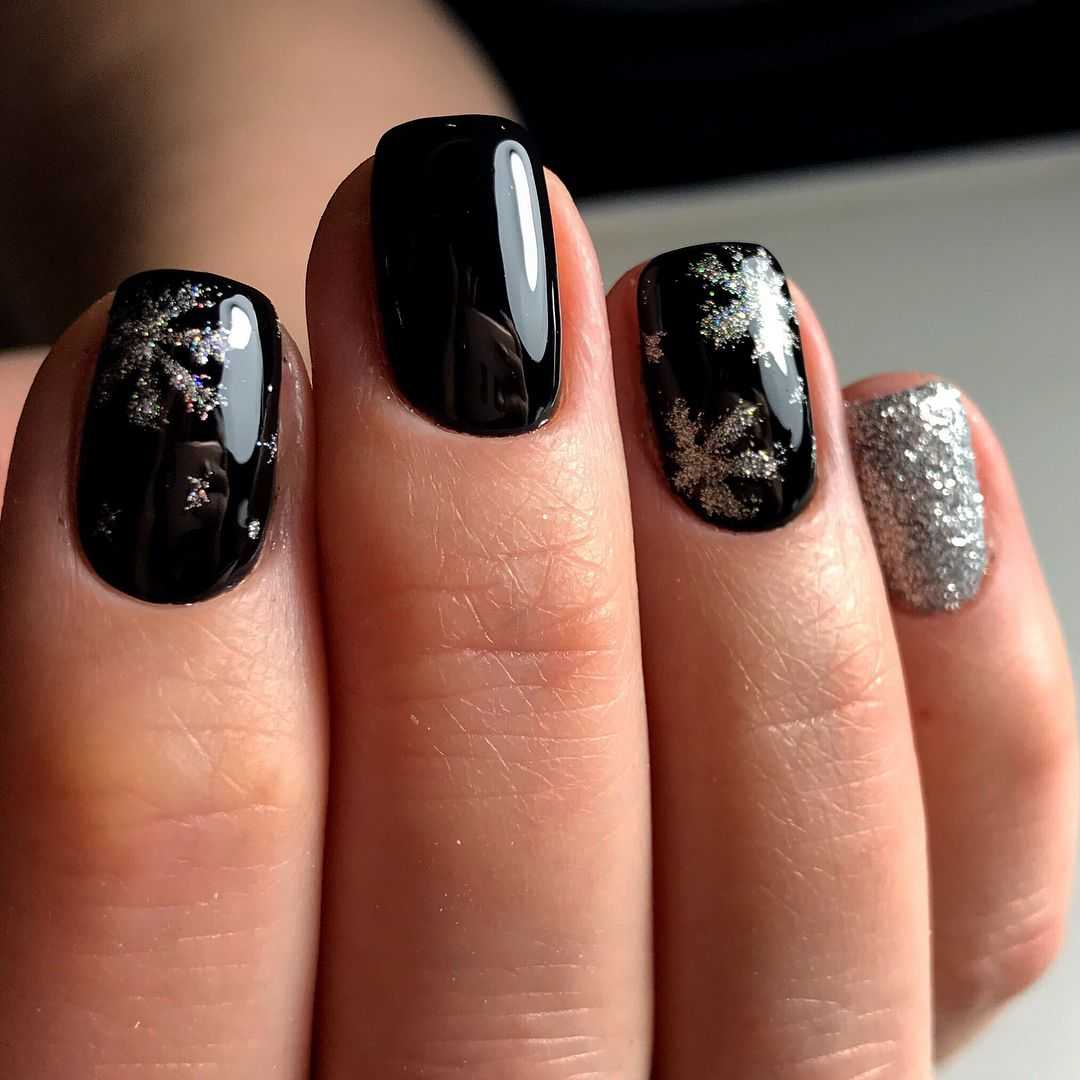 Черный глянцевый новогодний маникюр прекрасно смотрится с белым матовым дизайном. Также можно добавить блесток или серебристые снежинки. Однотонный черный матовый маникюр подходит на каждый день. Праздничный маникюр можно украсить объёмным вязаным дизайном, полосками с блестками и росписью. Интересные идеи новогоднего маникюра с вензелями на ногтях можно воплотить на любой длинне, например на миндальных ногтях или на квадратной форме.