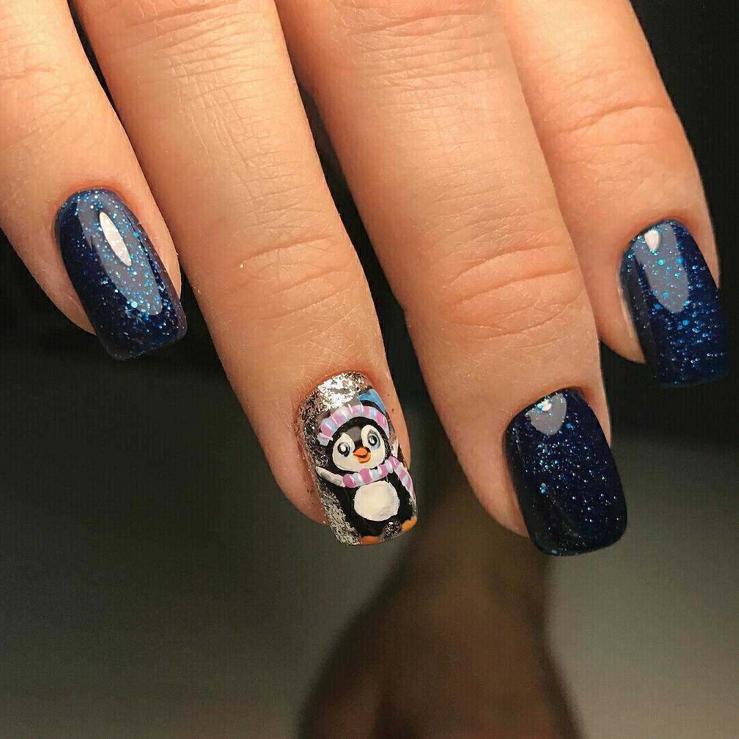 - ногти с пингвинами. Поддерживая тематику Северного Полюса, ноготки украсят еще одни арктические обитатели – пингвины;