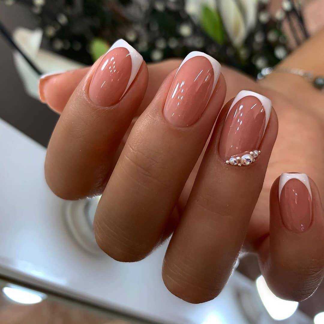 Бежевых и розовых оттенков очень много. Они делают образ нежным, воздушным. Особенно красиво нюд смотрится в матовом исполнении. Сам же дизайн французского маникюра может быть абсолютно любым, но об этом чуть позже. Кончик ногтя, в классическом варианте, окрашивают в белый цвет. Форма линии френча подбирается в соответствии с опилом ногтей.