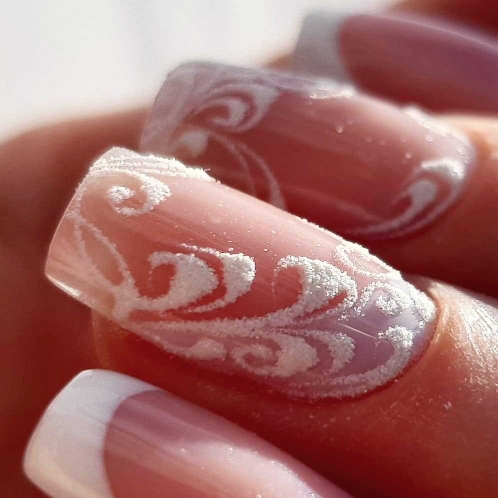 выполненные при помощи акриловой пудры. Она создает имитацию выпуклого узора,