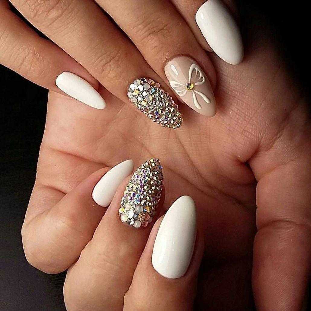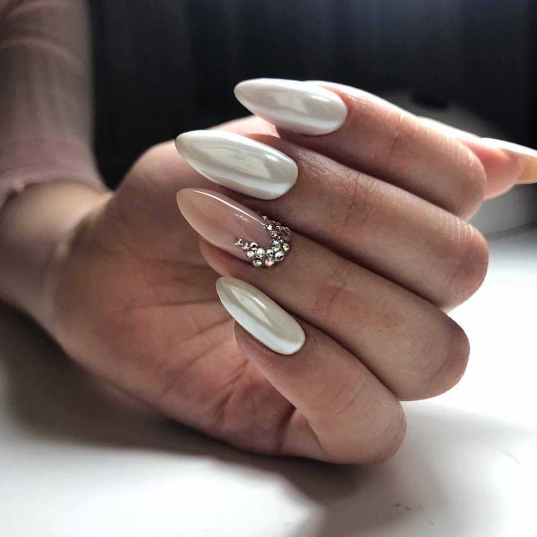 Следующий год — это год металлической крысы белого цвета, поэтому размышляя о том, каким должен быть маникюр на новый 2019 год важно помнить о наличии различных втирок, страз и покрытий с переливающимися оттенками.