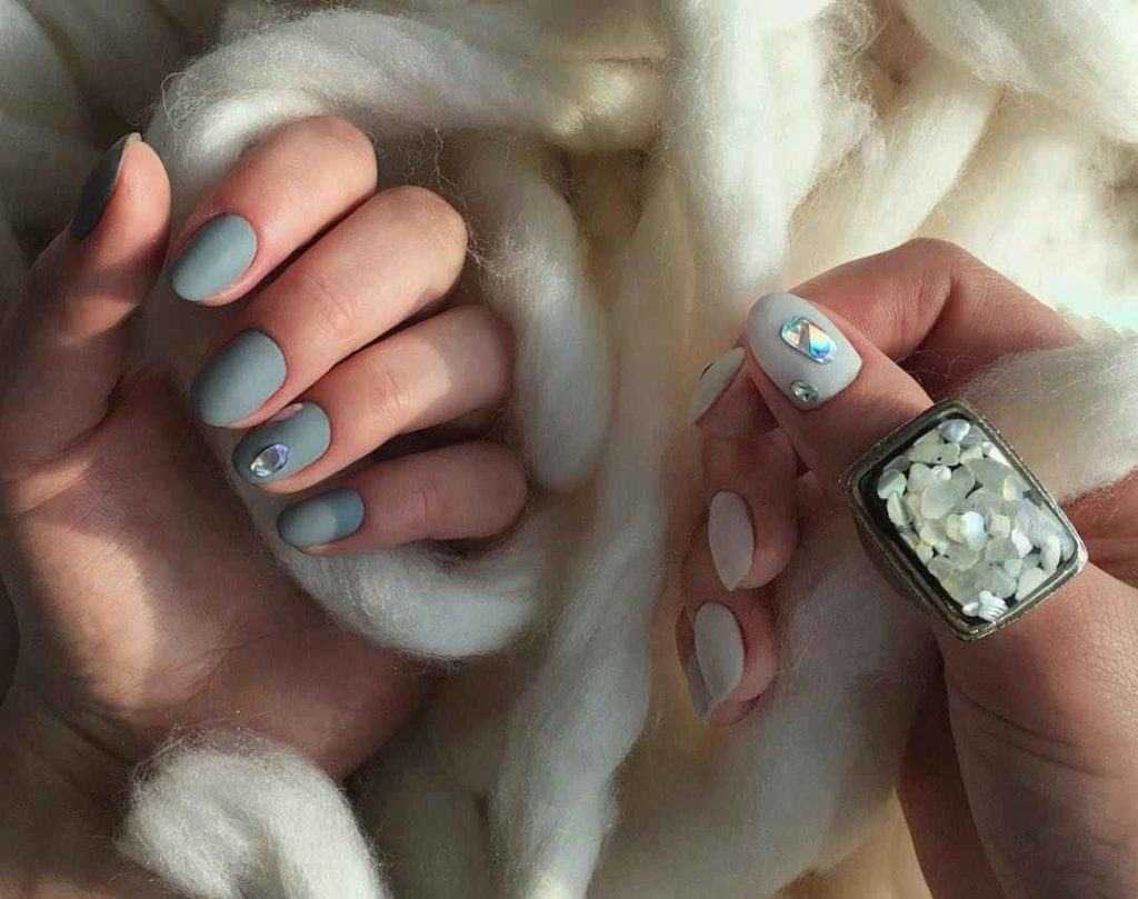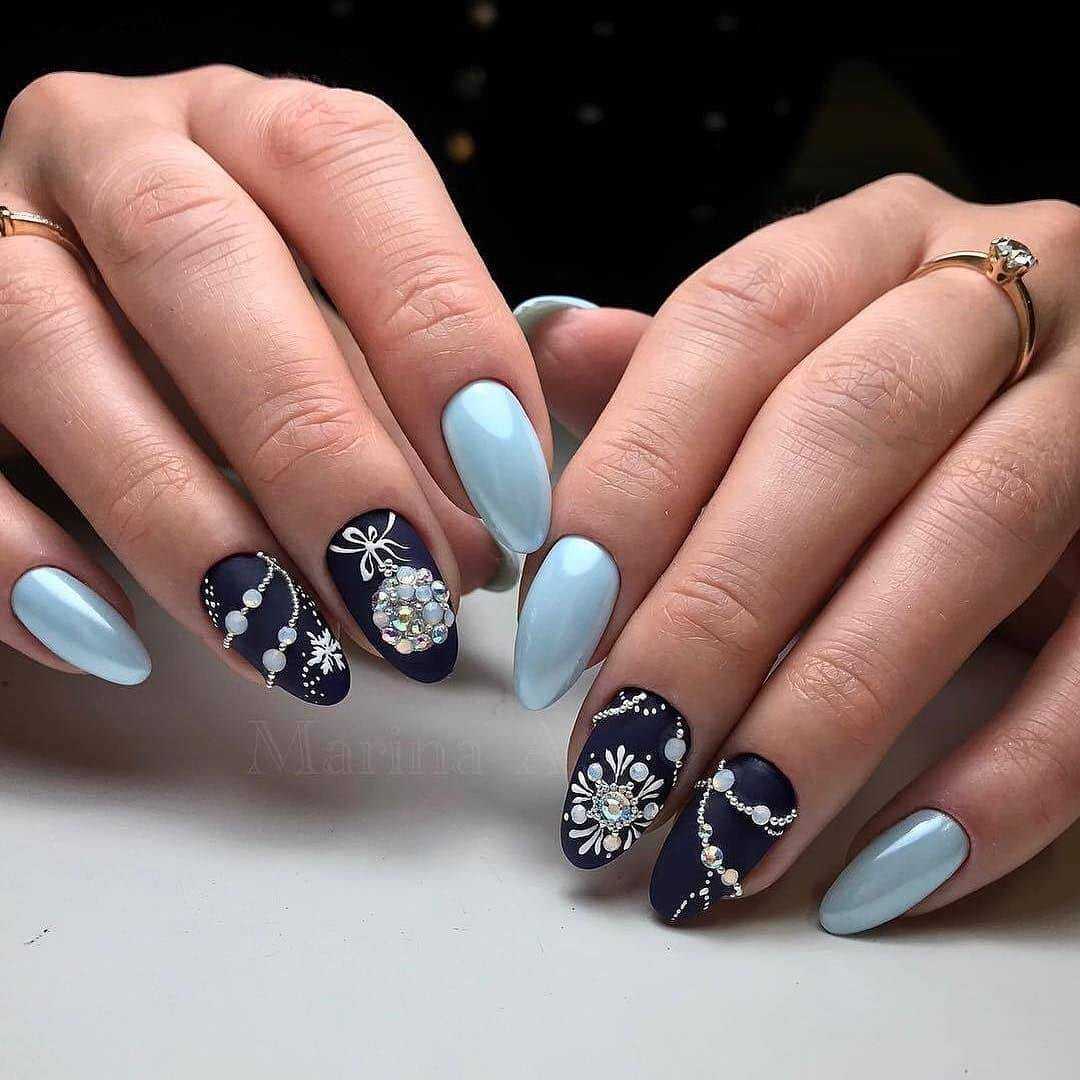 Практически универсальным синий маникюр делает матовый топ. Он приглушает яркость, а значит ногти будут сочетаться с любым новогодним нарядом.