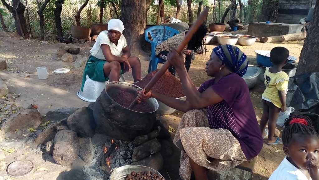 Ручной. Африканские женщины собирают орехи, а затем многие дни подряд очищают их от мякоти, затем жарят, дробят с помощью камня, потом ступы, затем смешивают с водой. Полученную смесь несколько раз кипятят, при этом сливая тёмный осадок, и снимая светлую пену. Светлая пена — это и есть масло.
