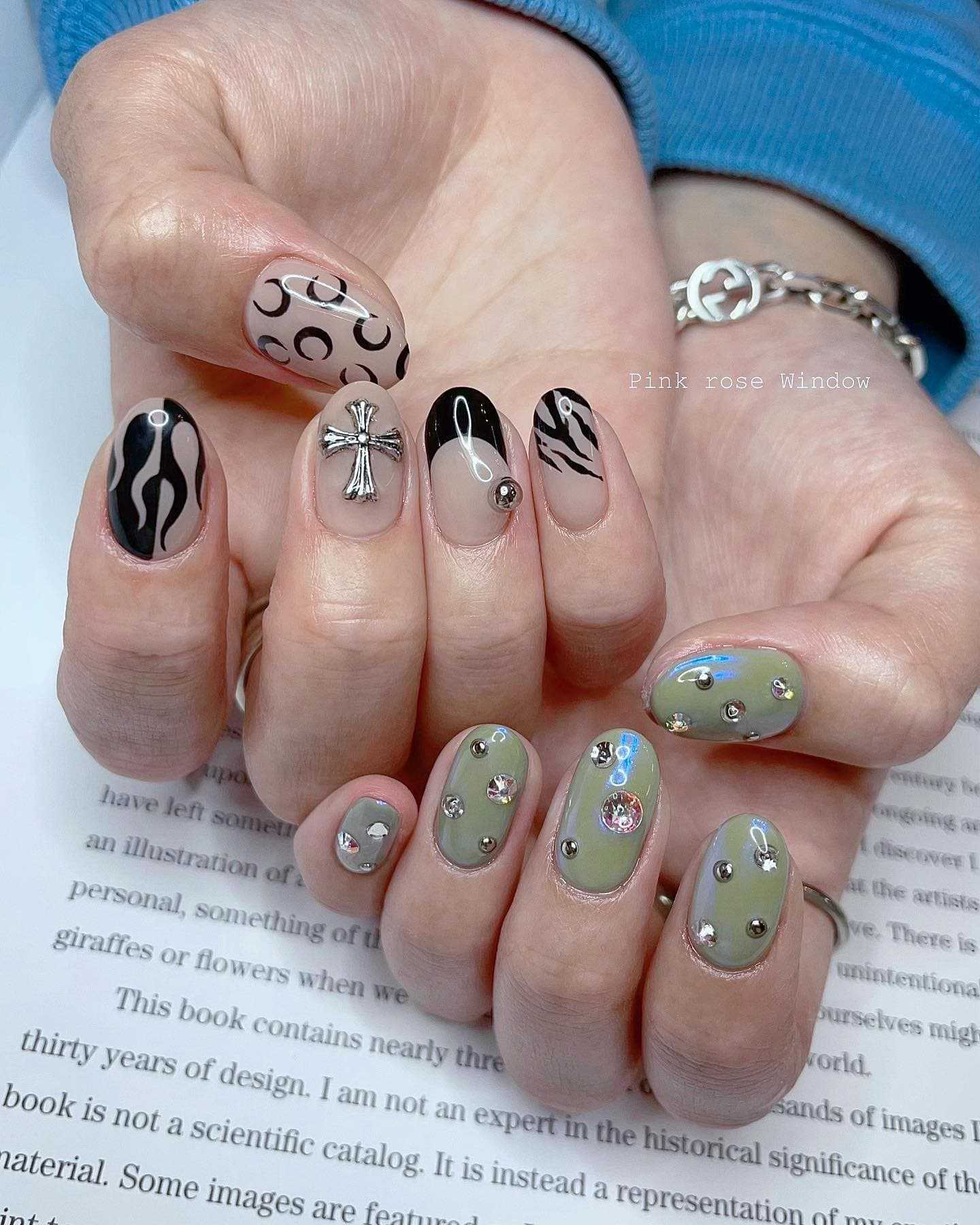 Хаки не самый актуальный так как не является базовым, поэтому нечасто используется в маникюре. Дополнительный цвет лучше смотрится в выделяющихся оттенках. Стразы на матовом топе или геометрия приемлемые варианты в маникюре на сегодняшний день.