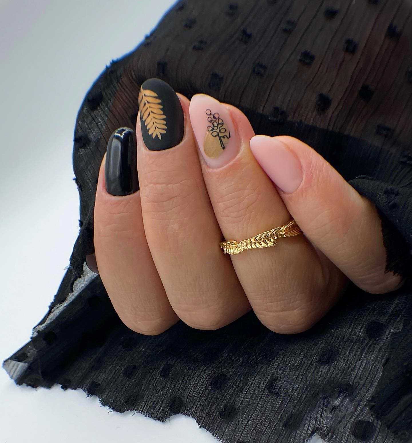 Черный цвет не менее актуален. Его можно использовать самостоятельно – для окрашивания ногтевых пластин, соседние с которыми заполняются темно-синим, или в градиенте, состоящим из этих же оттенков. Также хорошее сочетание – черные глянцевые и велюровые ногти. Чтобы сделать такой маникюр менее мрачным, можно добавить один белый матовый ноготок.