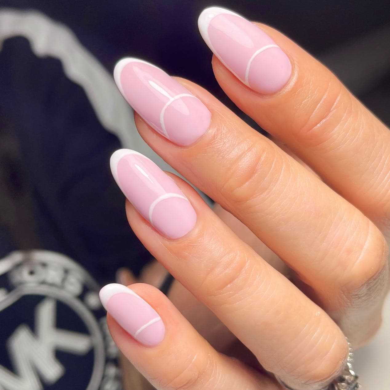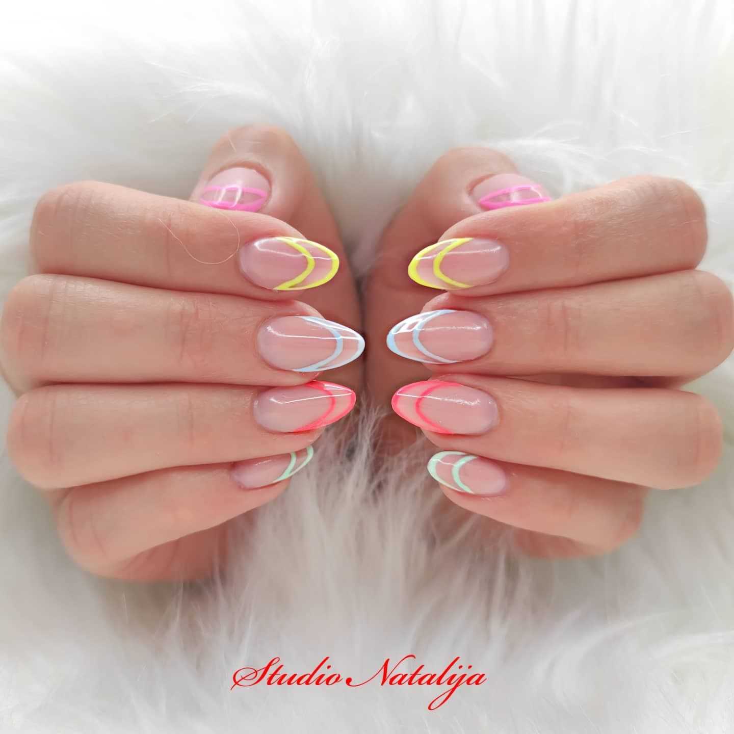 Так острый маникюр может быть исполнен в стиле френч, но с нетипичной градиентной, геометрической, яркой, скругленной полоской.