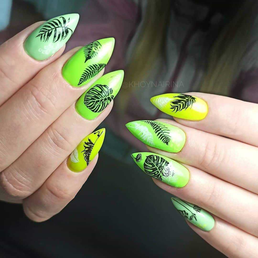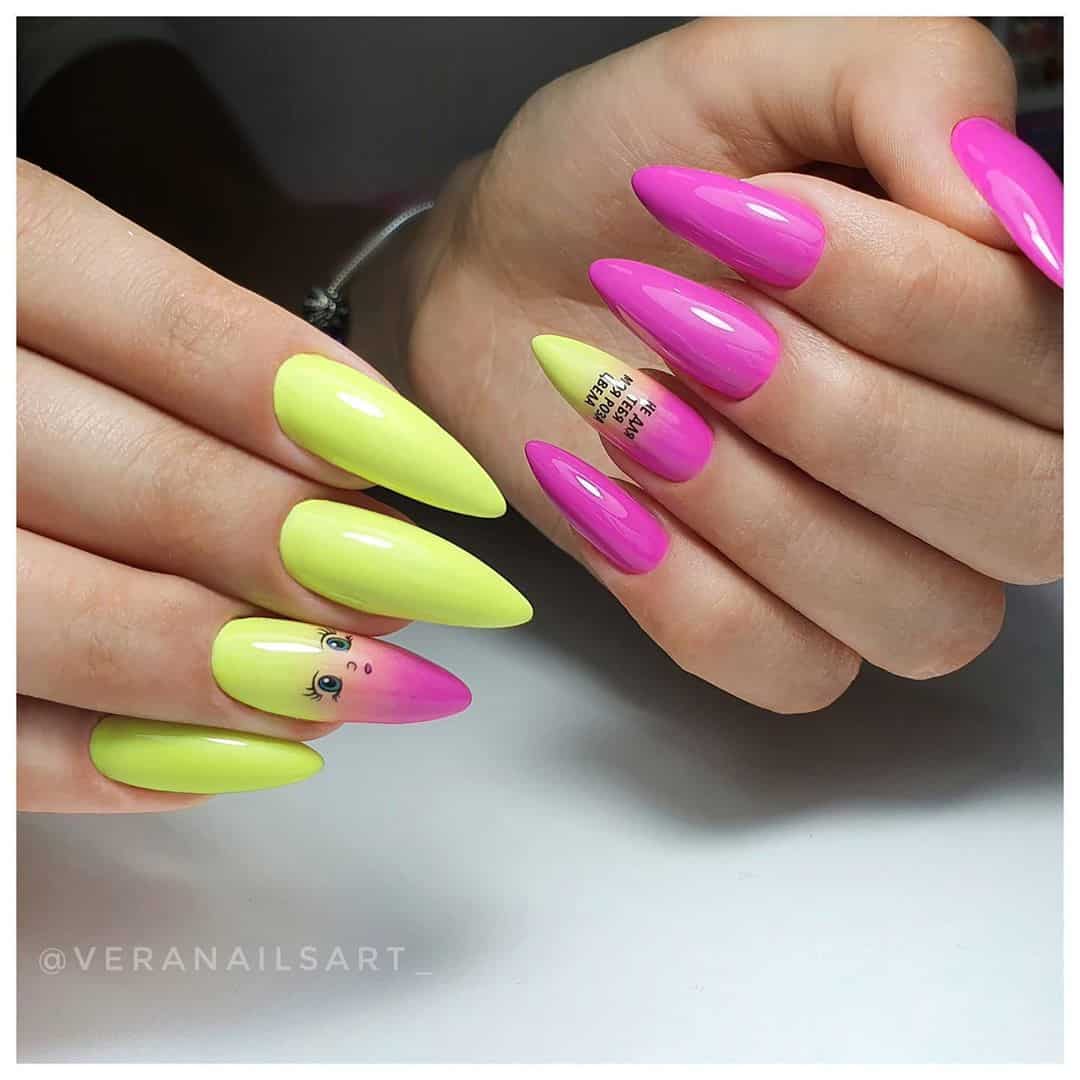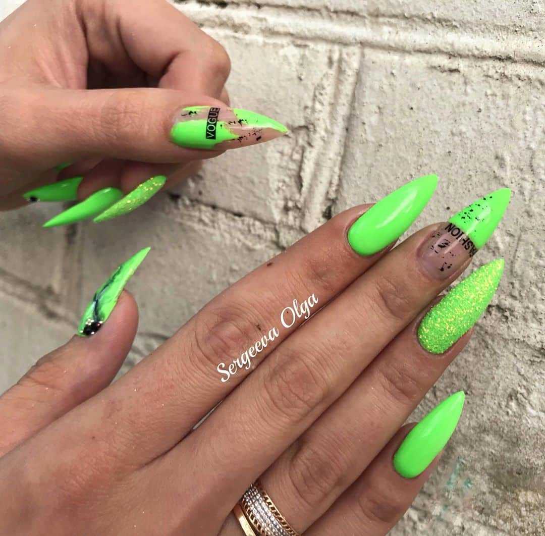Не бойтесь экспериментировать и попробовать яркий гель лак на острые ногти, например, зеленый, бирюзовый, розовый, цвет фуксии, голубой, фиолетовый, выполнив маникюр в стиле «negative space» либо «color block», что смотрится ярко и стильно.