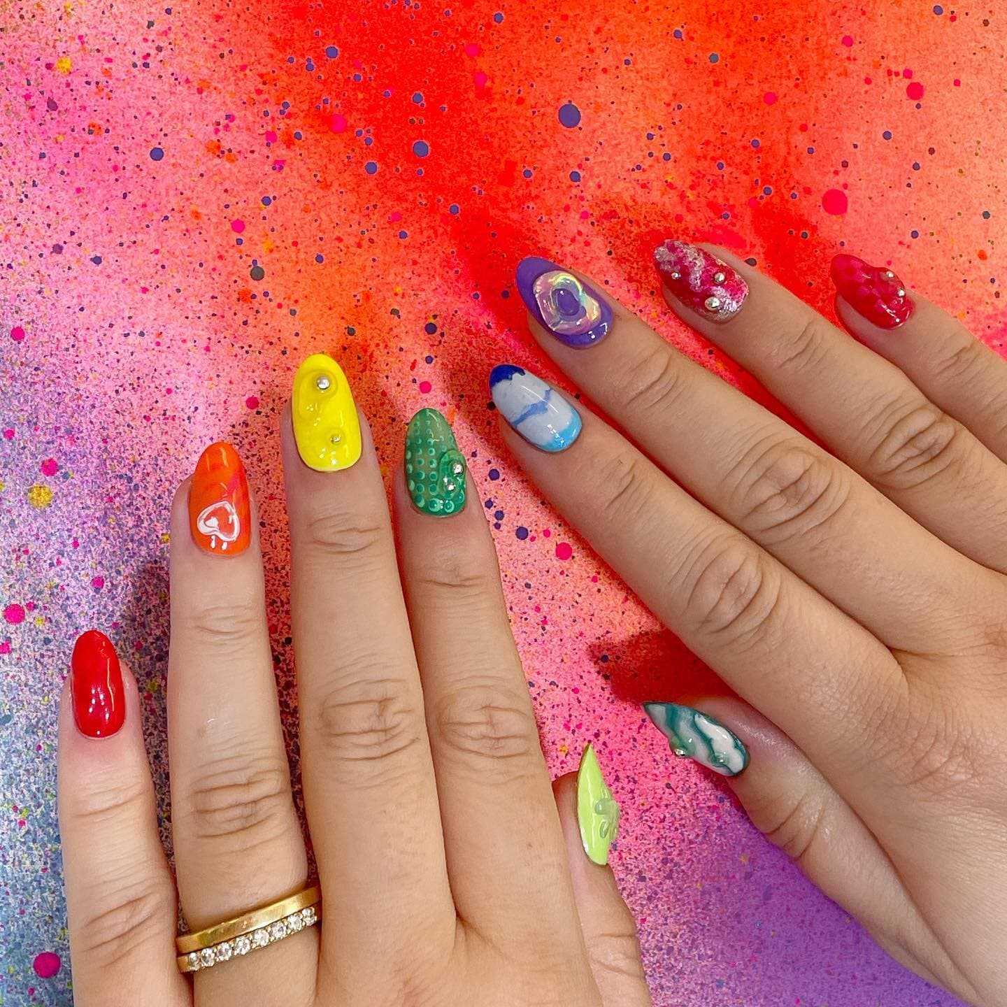 В последнее время стала популярна техника, по которой цвет ногтей на одной руке кардинально отличается по цвету на другой. При этом уместно и необычно смотрится, когда эти цвета переплетаются в градиенте на нескольких пальчиках. Не забудьте нанести рисунки или прикрепить наклейки, покрыв их сверху закрепителем.