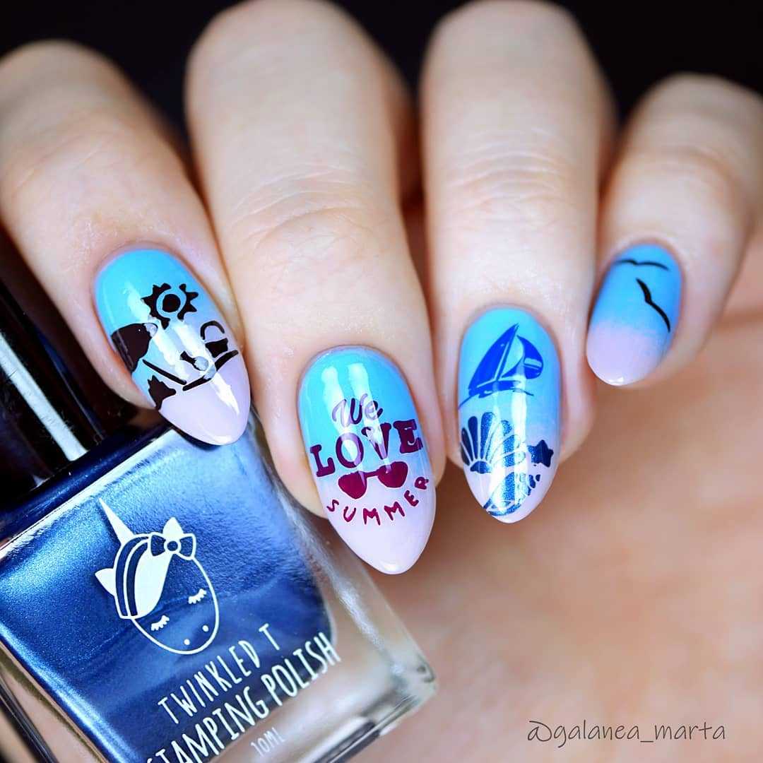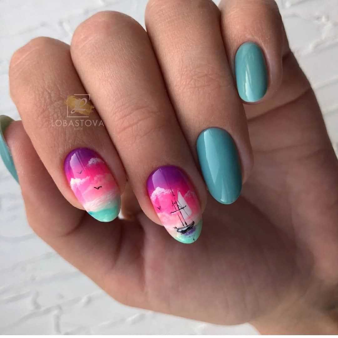 Часто используется в путешествиях. Морской цвет самодостаточный, но для придания единства, иногда выбирают светлые и розовые лаки.