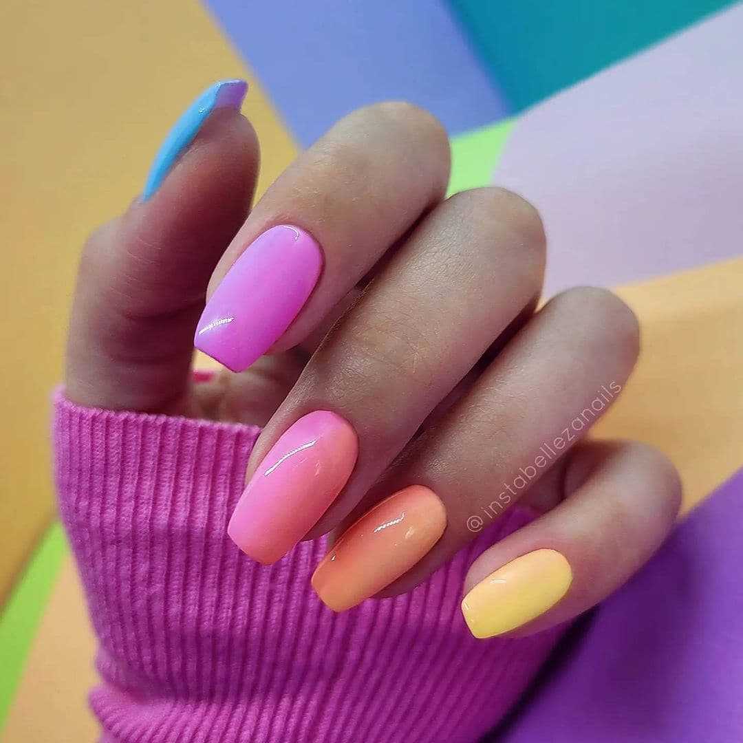 Если вы не определились с оттенком лака для ногтей? Тогда вам подойдет многоцветный маникюр, или как его еще называю градиентный дизайн. Сохраняйте целостность цветовой палитры, выбирая оттенки одной цветовой гаммы и вы получите стильный и модный дизайн сезона 2021-2022.