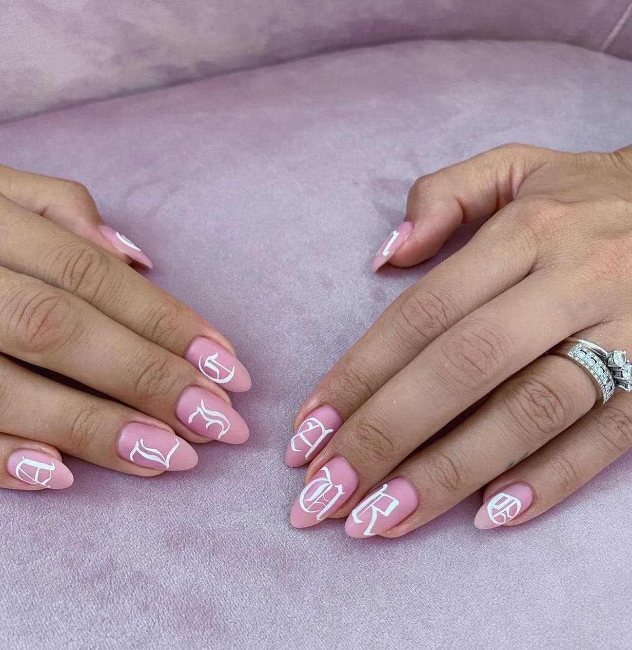 Белые рисунки в виде полос, штрихов и завитков позволяют выполнить утонченный маникюр на острые ногти 2022-2023 года, который прекрасно дополнит очень нежный и романтичный лук.