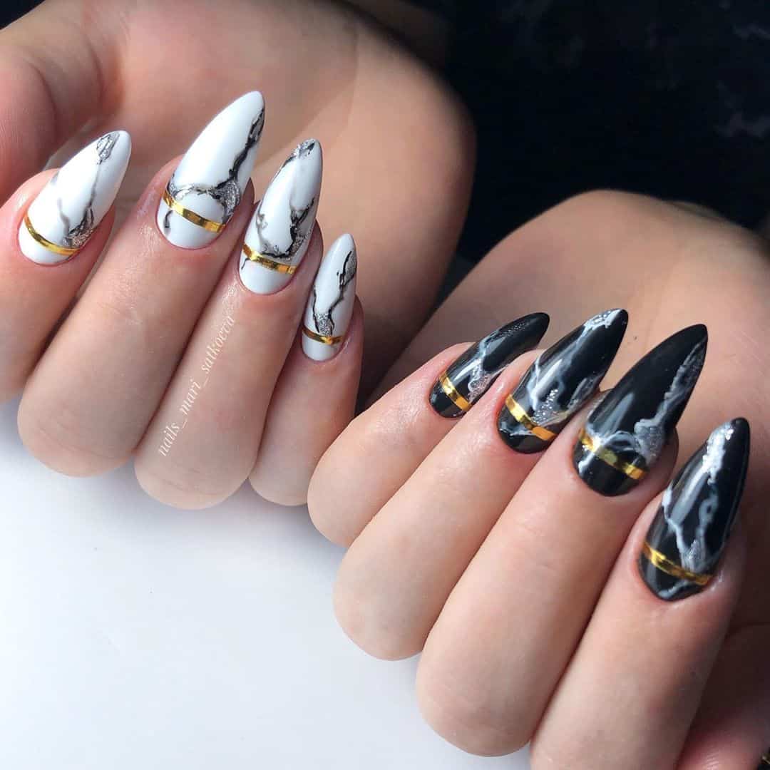 Лаконичный и модный маникюр на острые ногти можно получить, если использовать бежевый или белый гель лак в сочетании с черным, выполнив с их помощью рисунки в геометрическом стиле и различные ажурные узоры, примеры которых вы найдете в нашей подборке фото.
