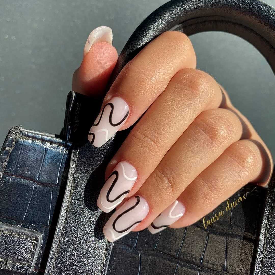 Геометрический рисунок — один из лучших способов продемонстрировать длинные нарощенные ногти. У вас будет достаточно места, чтобы использовать контрастные формы, цвета и узоры. Обязательно используйте два контрастных цвета — например, черный и телесный, чтобы резкие узоры выделялись.
