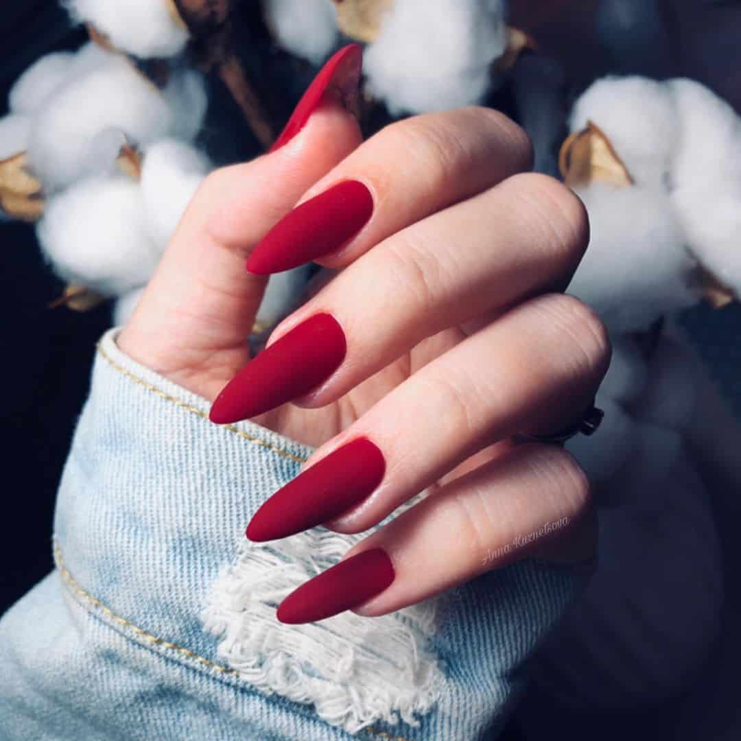 Матовые покрытия на остром маникюре смотрятся нежно, тепло и загадочно. Его можно оставить совсем без украшений, выбрав однотонный вариант.