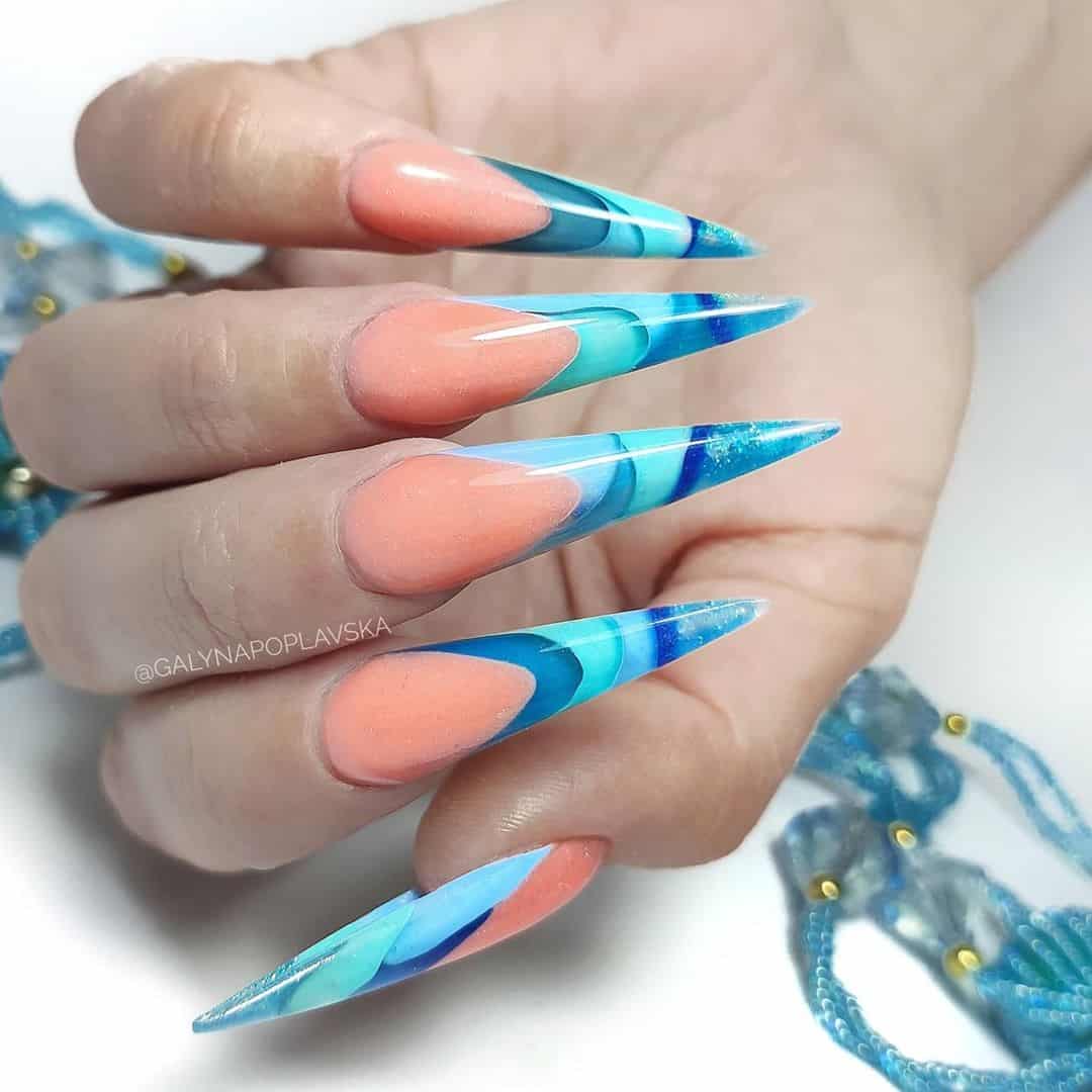 С длинными острыми коготками забудьте об обычном френче, ведь здесь выбор дизайна улыбки поистине безграничен. Например, можно сделать аквариумный дизайн с самыми разными элементами, сделать френч из неровных полосок разных или похожих оттенков, а также – украсить всё это дело блёстками или стразами.