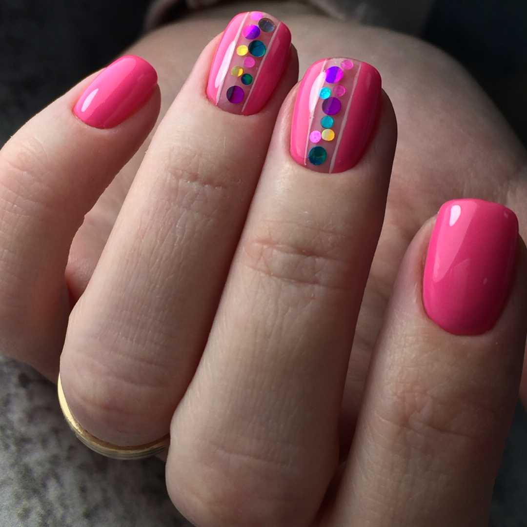 - Расположить равномерно на ногтях в разном порядке, разных цветов и размеров. Получится равномерный и симпатичный дизайн, который просто перекрывается плотным топом или конструирующим гелем.