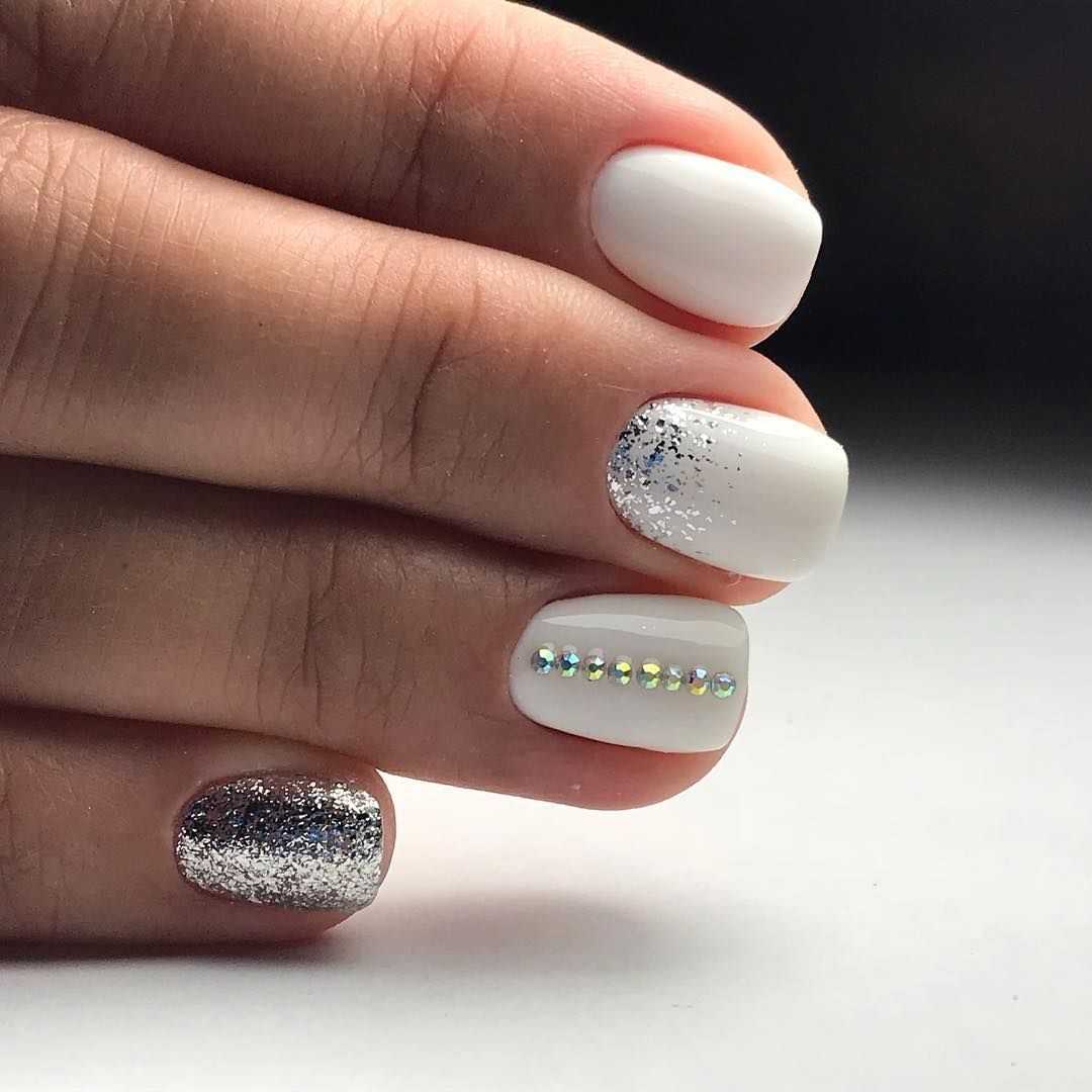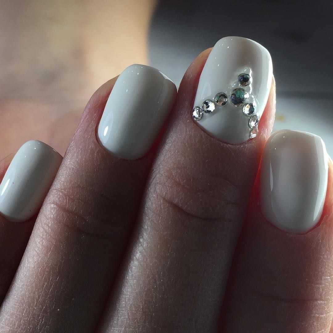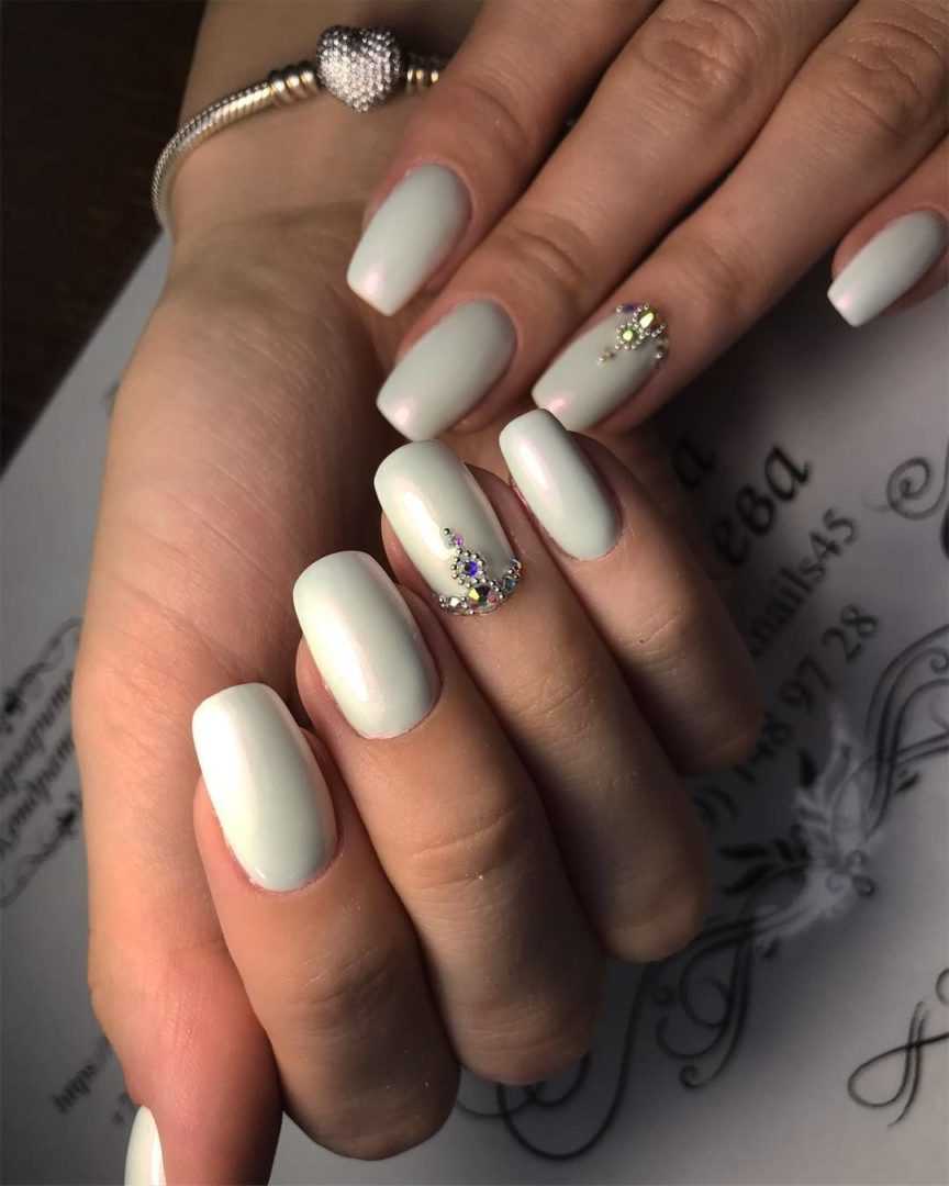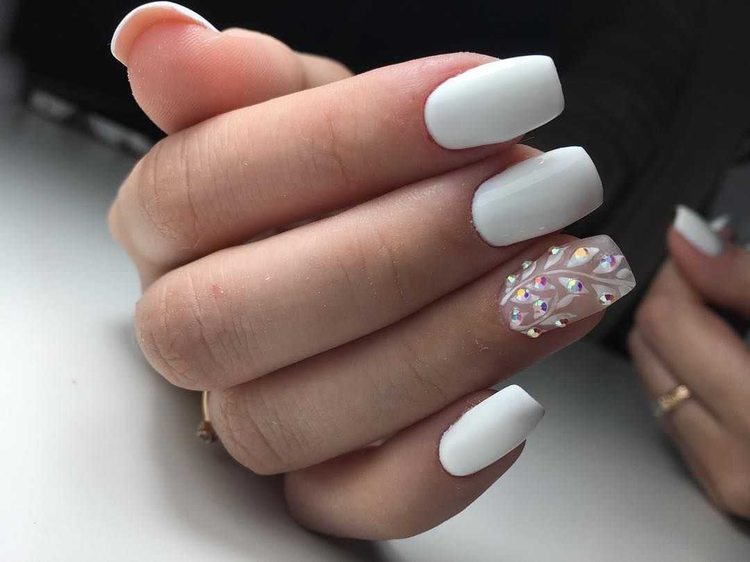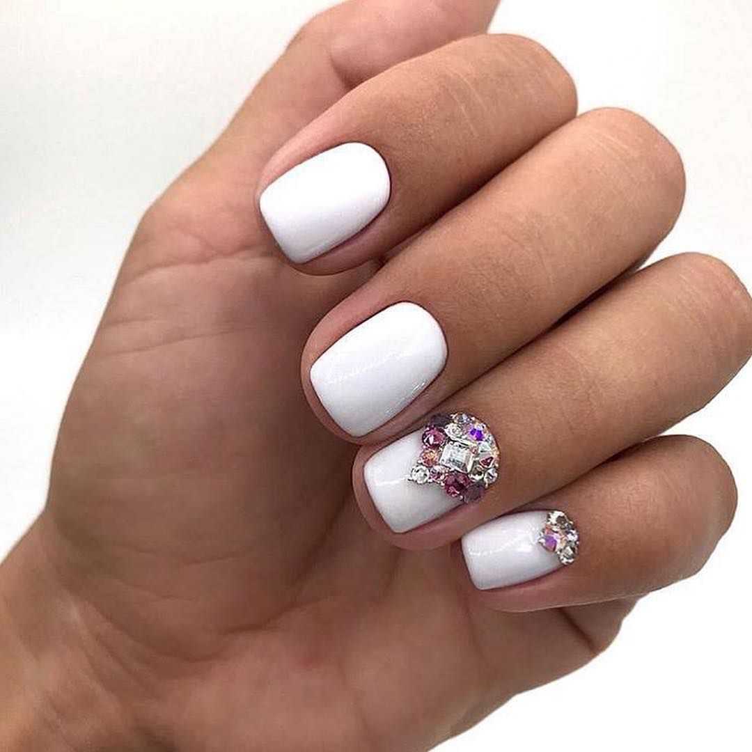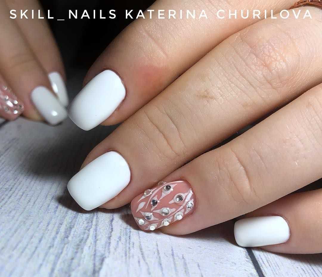 Основным трендом белого маникюра на короткие ногти по-прежнему остается матовое покрытие с легким декором серебряными стразами. Можно прикрыть их небольшим разбросом или сосредоточиться на области отверстия на нескольких пальцах.
