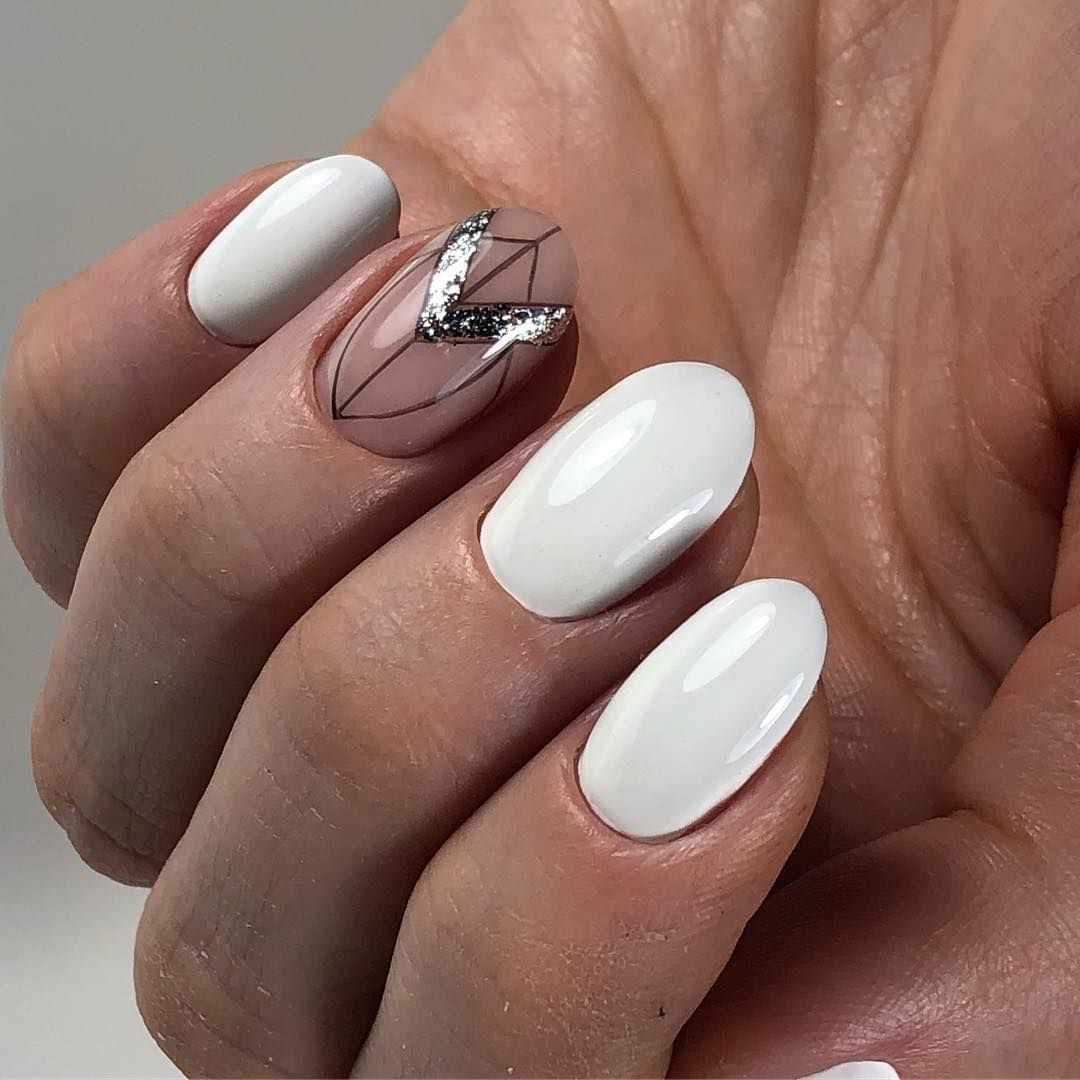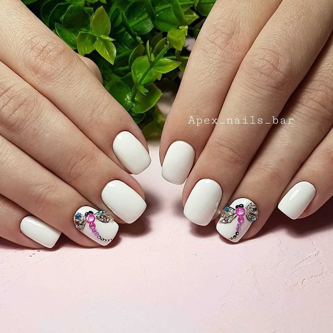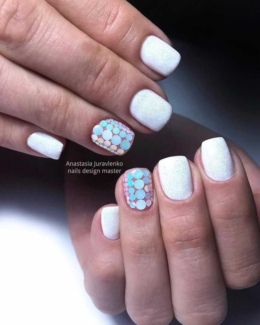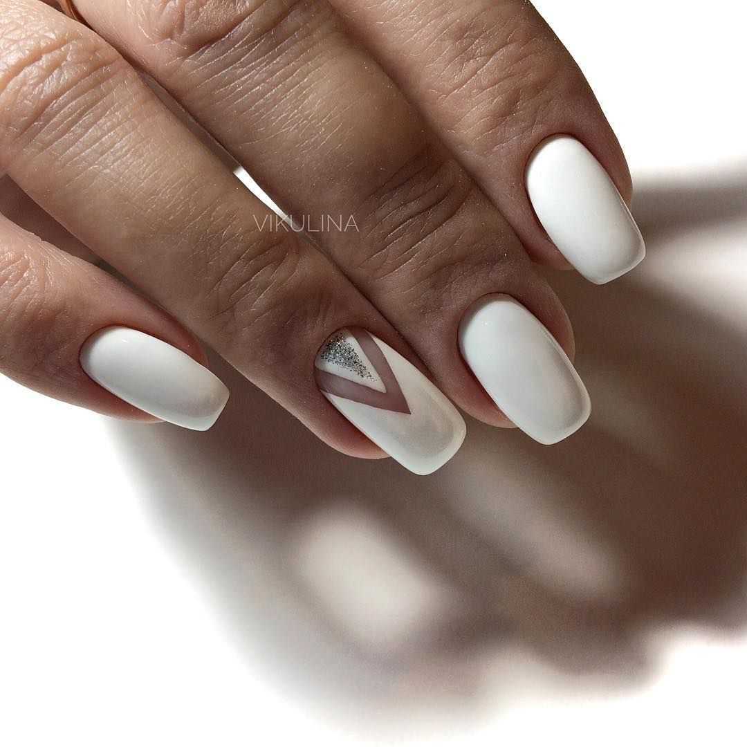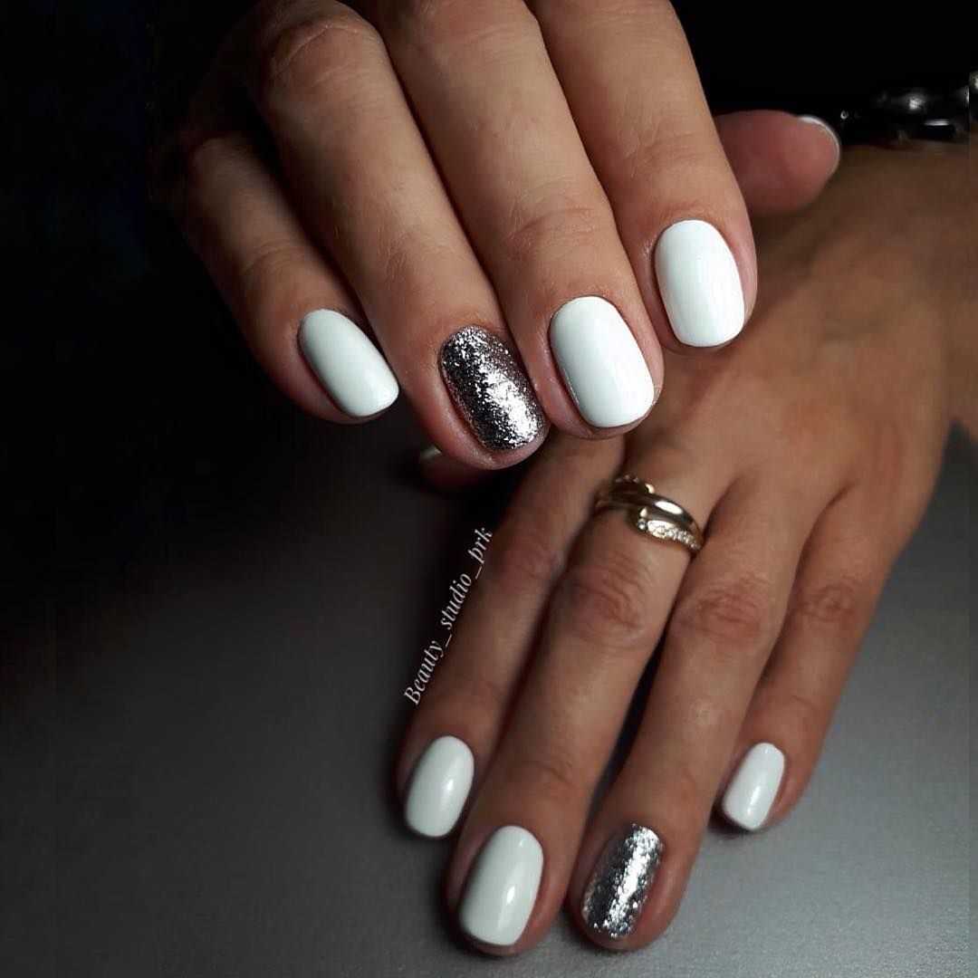 Основным трендом белого маникюра на короткие ногти по-прежнему остается матовое покрытие с легким декором серебряными стразами. Можно прикрыть их небольшим разбросом или сосредоточиться на области отверстия на нескольких пальцах.
