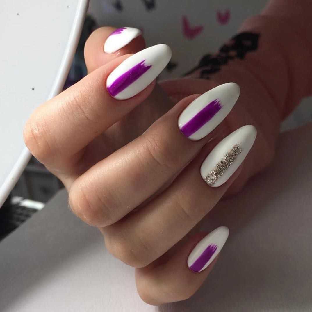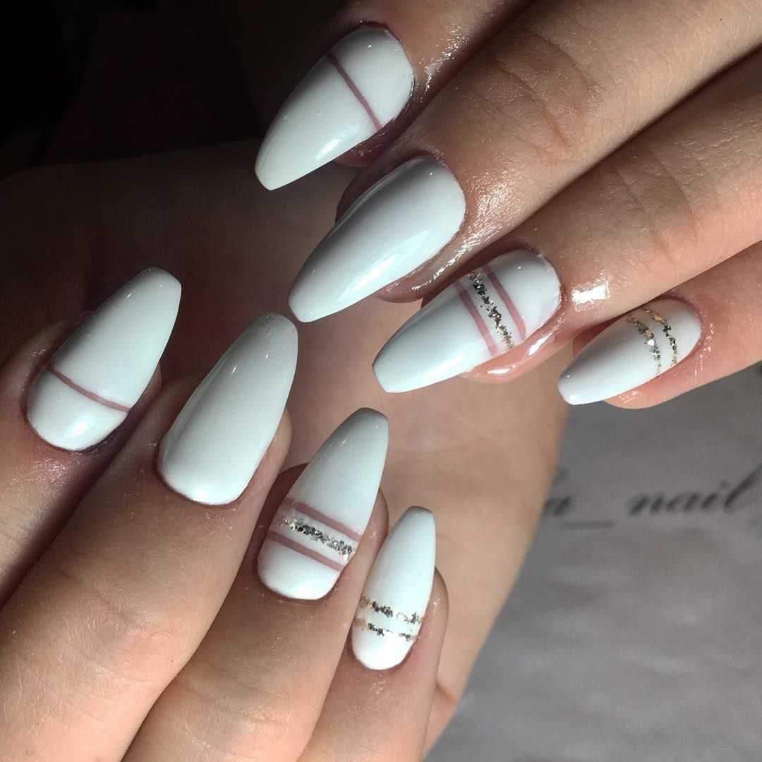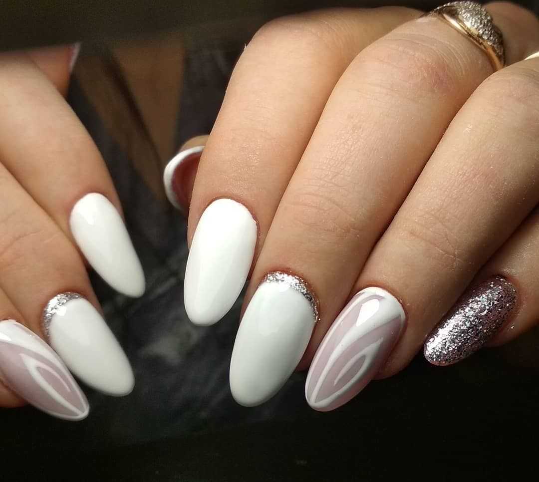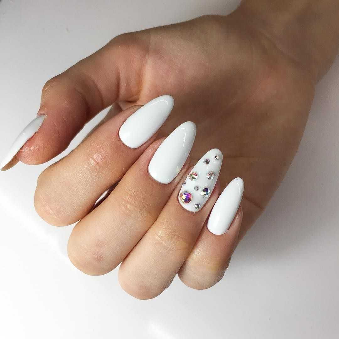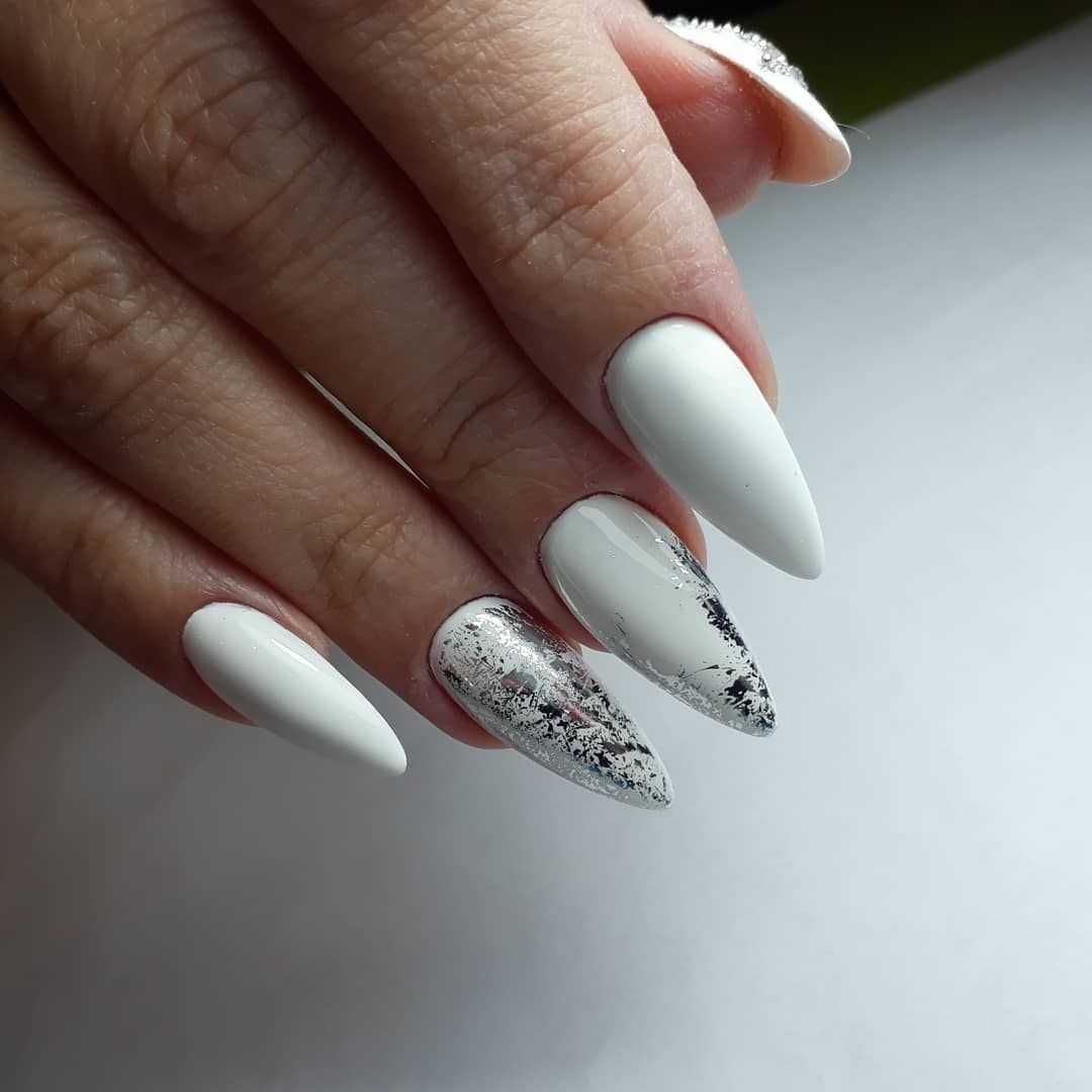 Чтобы белый маникюр не смотрелся на длинных ногтях слишком скучным или, наоборот, слишком праздничным, многие специалисты рекомендуют наносить его на миндалевидные ноготки и использовать такие очень популярные приемы, как битое стекло или камифубуки.