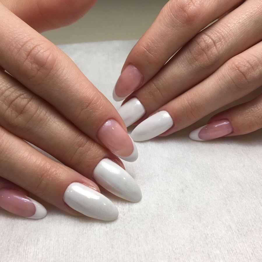 Для создания такого маникюра потребуется пудра для втирки — белого и нежно-розового цветов. Опытный нейл-мастер сможет соединить их так, что получится эффект французского маникюра с плавным переходом одного оттенка в другой. Такой маникюр визуально удлиняет ногти, делая пальцы более тонкими и изящными.