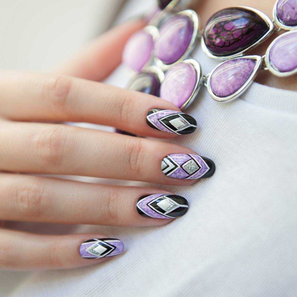 Разбавить ассиметричный маникюр можно геометрическими узорами, тематическими узорами и даже украшениями. Если говорить о последних, то с представленной техникой более гармонично работают фольга, стразы, бульоны и даже наклейки.
