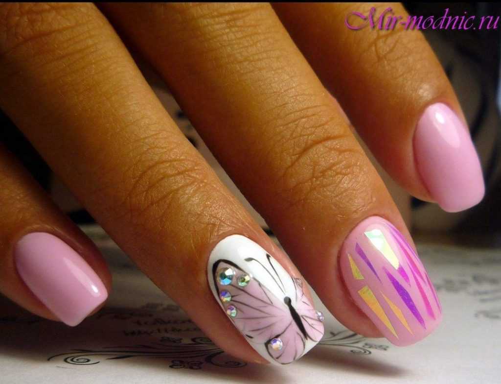 В летнее время, кроме цветов на ногтях можно нарисовать бабочек или любых насекомых. Крылья у бабочки можно украсить стразами или «битым стеклом». Не менее привлекательно на розовых ноготках будут выглядеть сочные фрукты или ягоды.