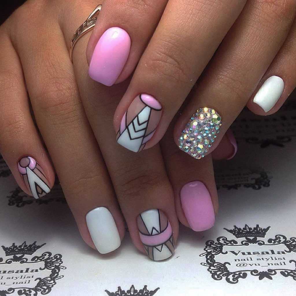 Асимметричный жакет вы вольны разбавить практически любым цветом при условии, что они будут сочетаться с основным розовым. Также не забывайте, что качественно выполнить эту технику сможет только специалист с большим опытом, иначе можно получить несколько неаккуратный маникюр с неточными линиями и углами.