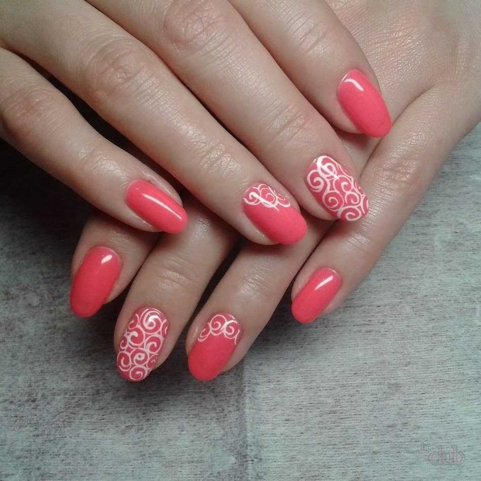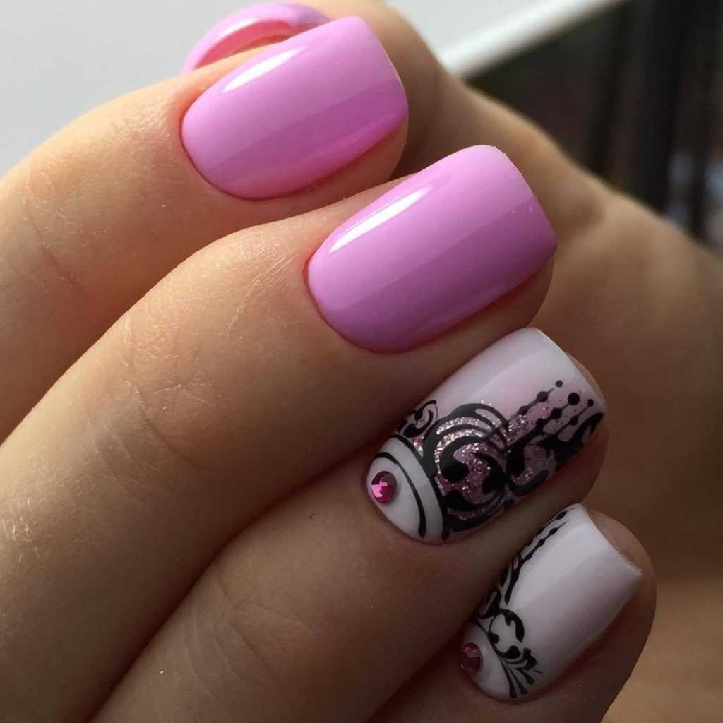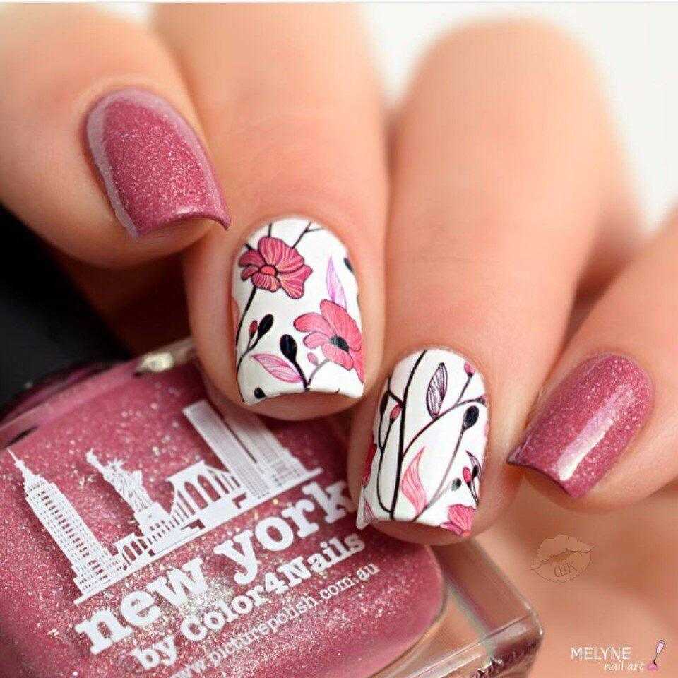 Розовая основа считается самой подходящей для нанесения нежных цветочков или веточек. Такие рисунки лаконичны уже сами по себе и не нуждаются в дополнительном украшении. Однако, при желании, можно дополнить маникюр небольшими стразами. Добавить яркости поможет контрастный лак на соседних ноготках. Розовый неплохо смотрится вместе с мятным или оранжевым.