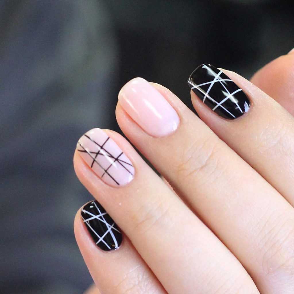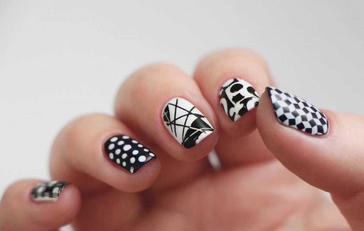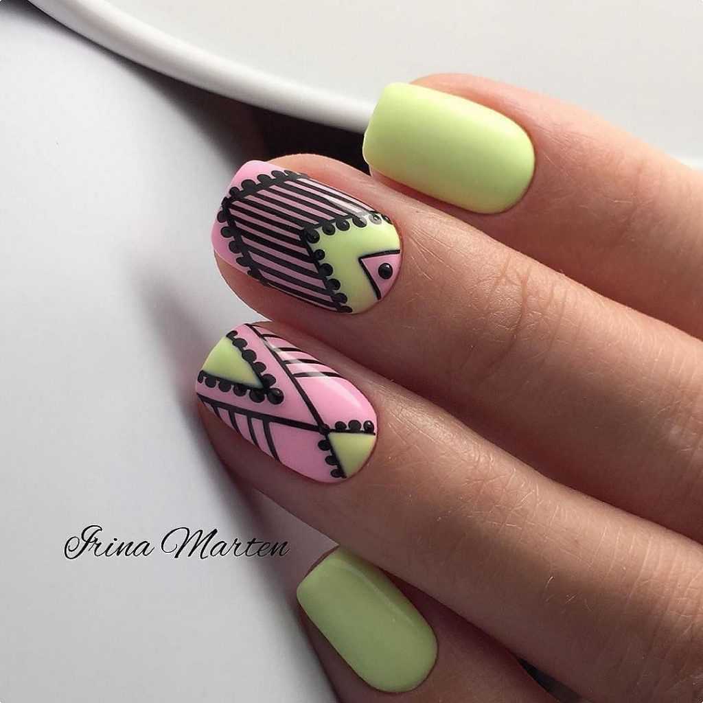 Настоящим хитом стал геометрический маникюр в черно-белом исполнении. Смотрится он потрясающе красиво, стильно и современно. Также его часто дополняют изображением крупных зеленых листьев и другими рисунками. Это отличная идея, чтобы сделать маникюр не таким строгим и придать ему нотку свежести.