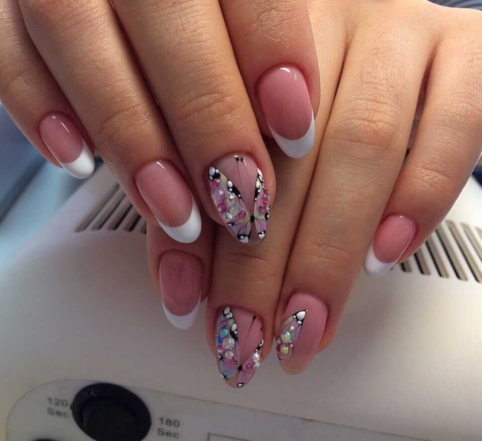 Все чаще можно увидеть изображение крыльев бабочки вместе с френчем. Такое сочетание подчеркивает элегантность рук и в целом смотрится очень красиво. Но многое зависит от техники нанесения рисунка. Схематичный, еле заметный дизайн по праву можно назвать универсальным. Более объемный рисунок с декором подойдет для отпуска или повседневной жизни.