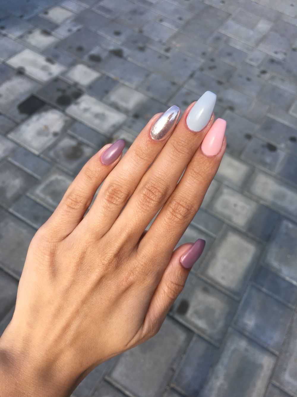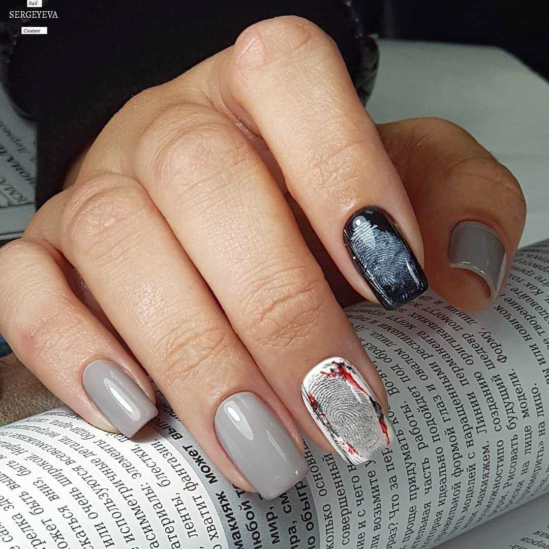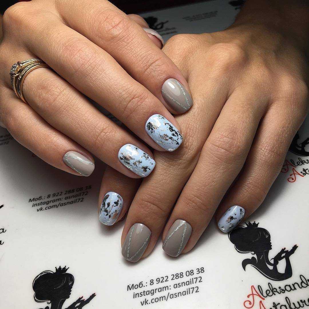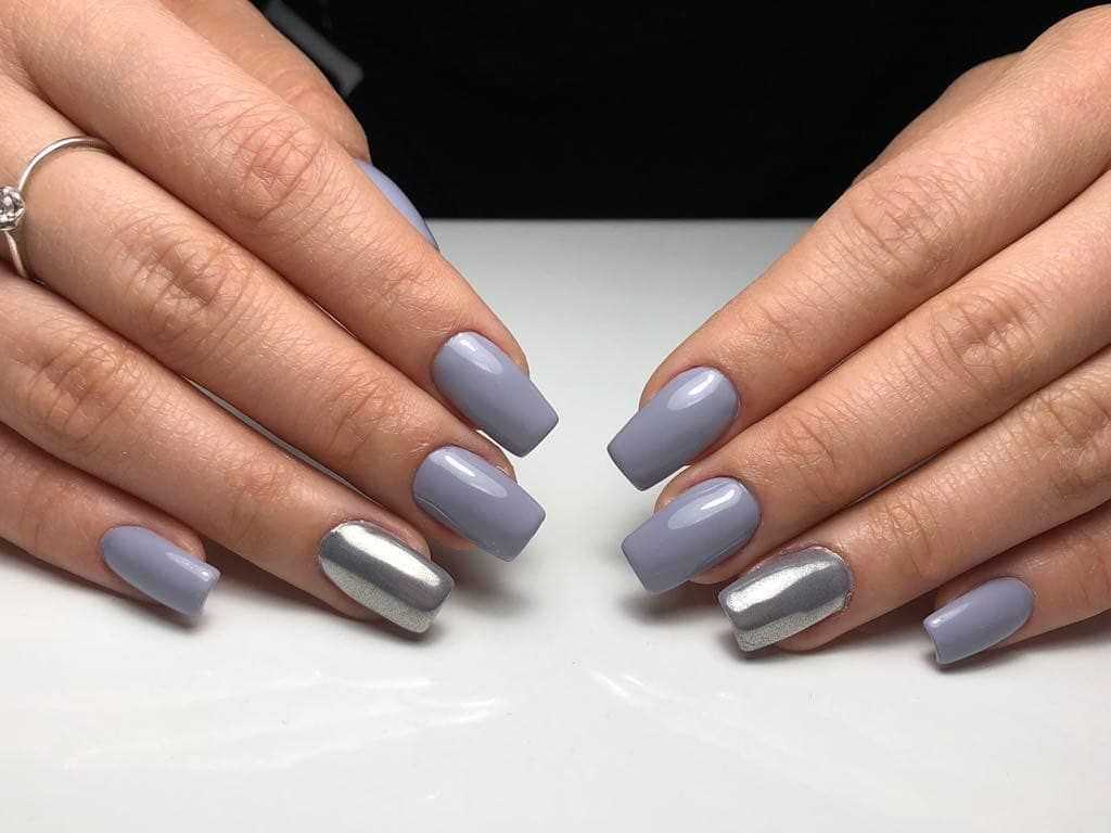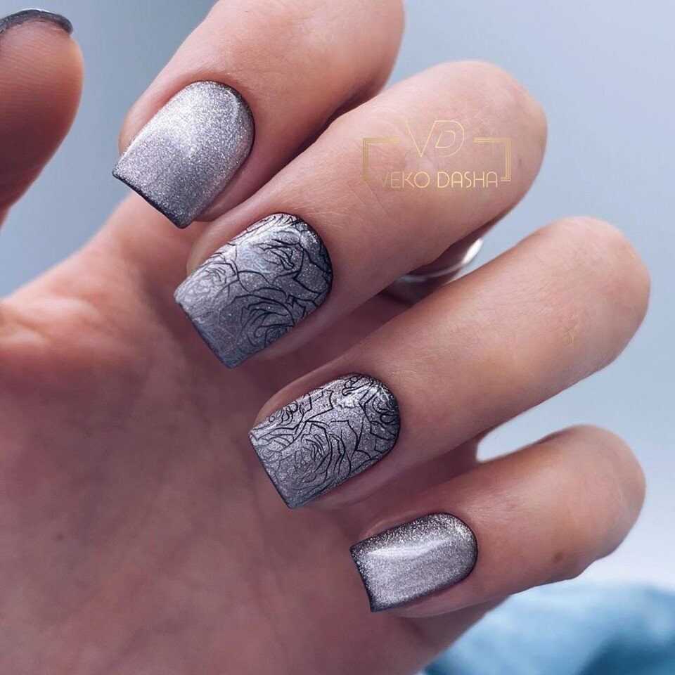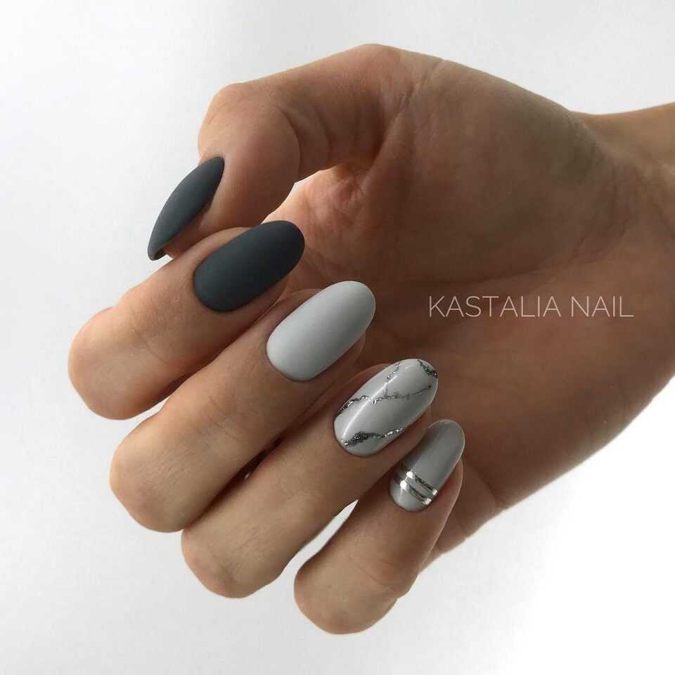 В первую очередь, на что мы хотели бы обратить внимание, это тот факт, что в качестве основы в таком маникюре может использоваться любой оттенок палитры, начиная от тёмного, и заканчивая самым светлым. Это может быть графитовый или гранитный серый, цвет мокрого асфальта, стальной, муссон, французский серый, пепельный, дымчатый, светло-серый и многие другие тона с не менее оригинальными названиями