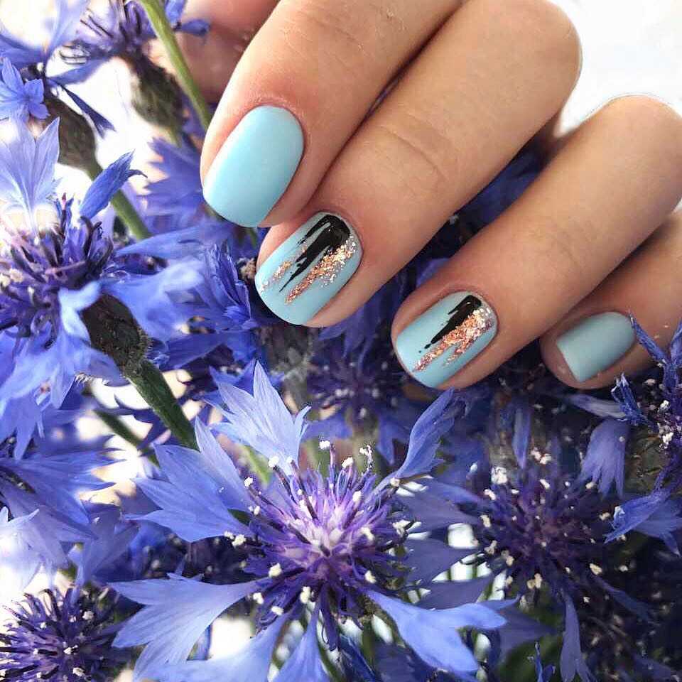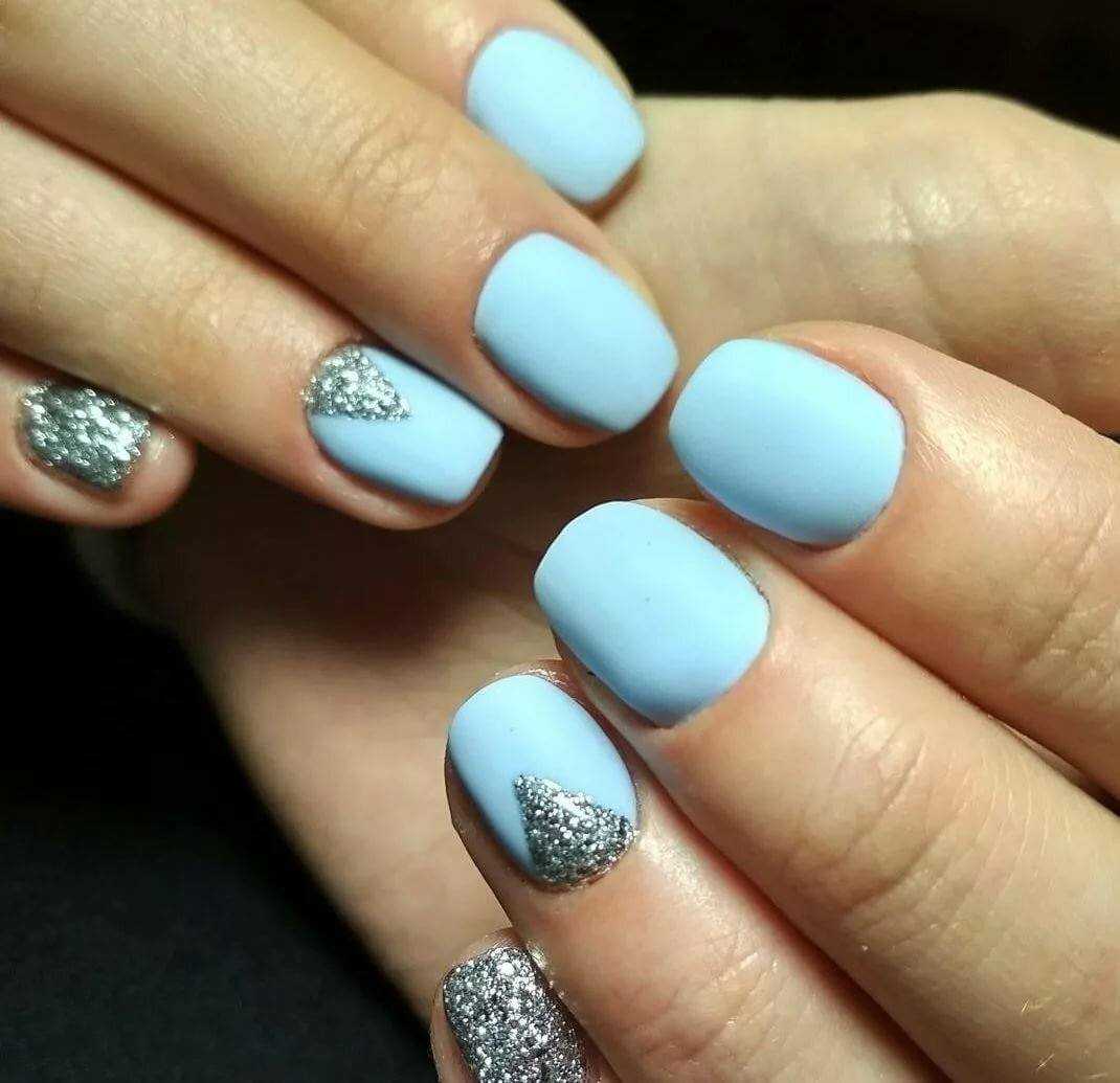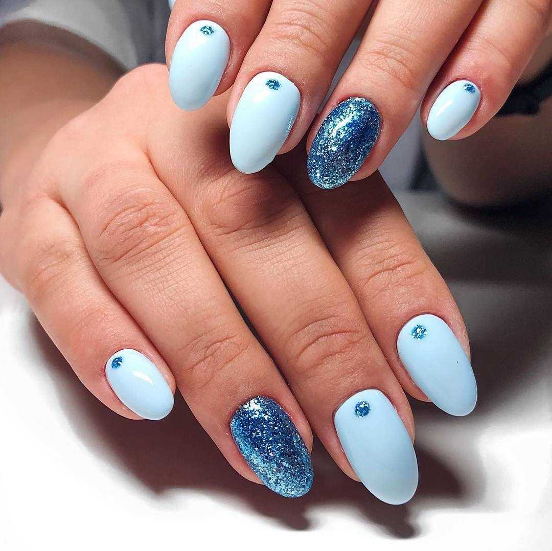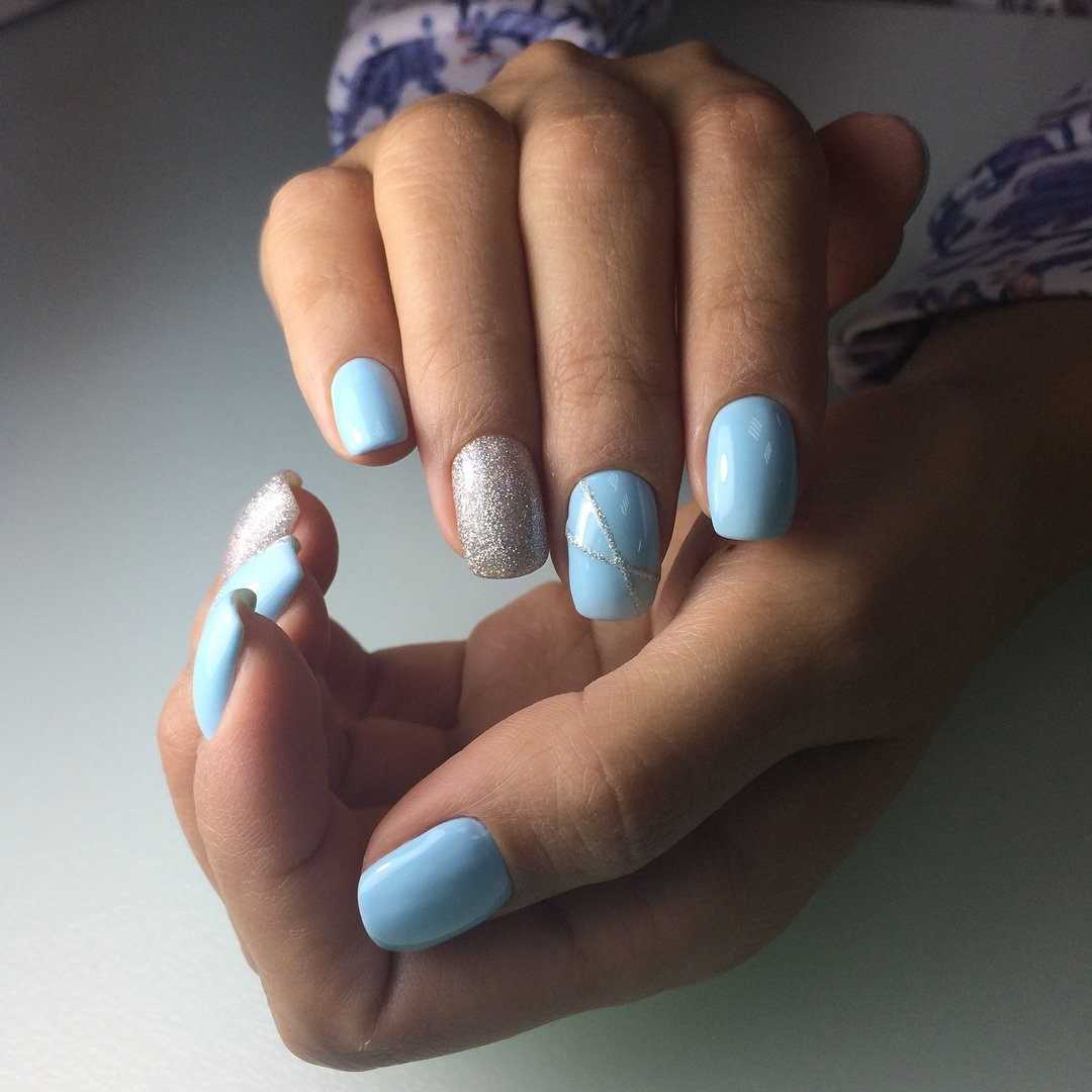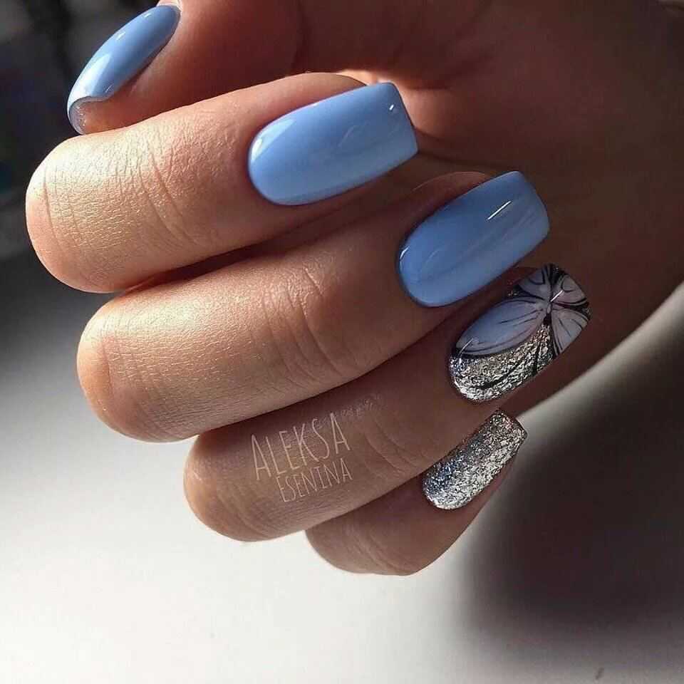 Модный голубой маникюр с дизайном и блестками