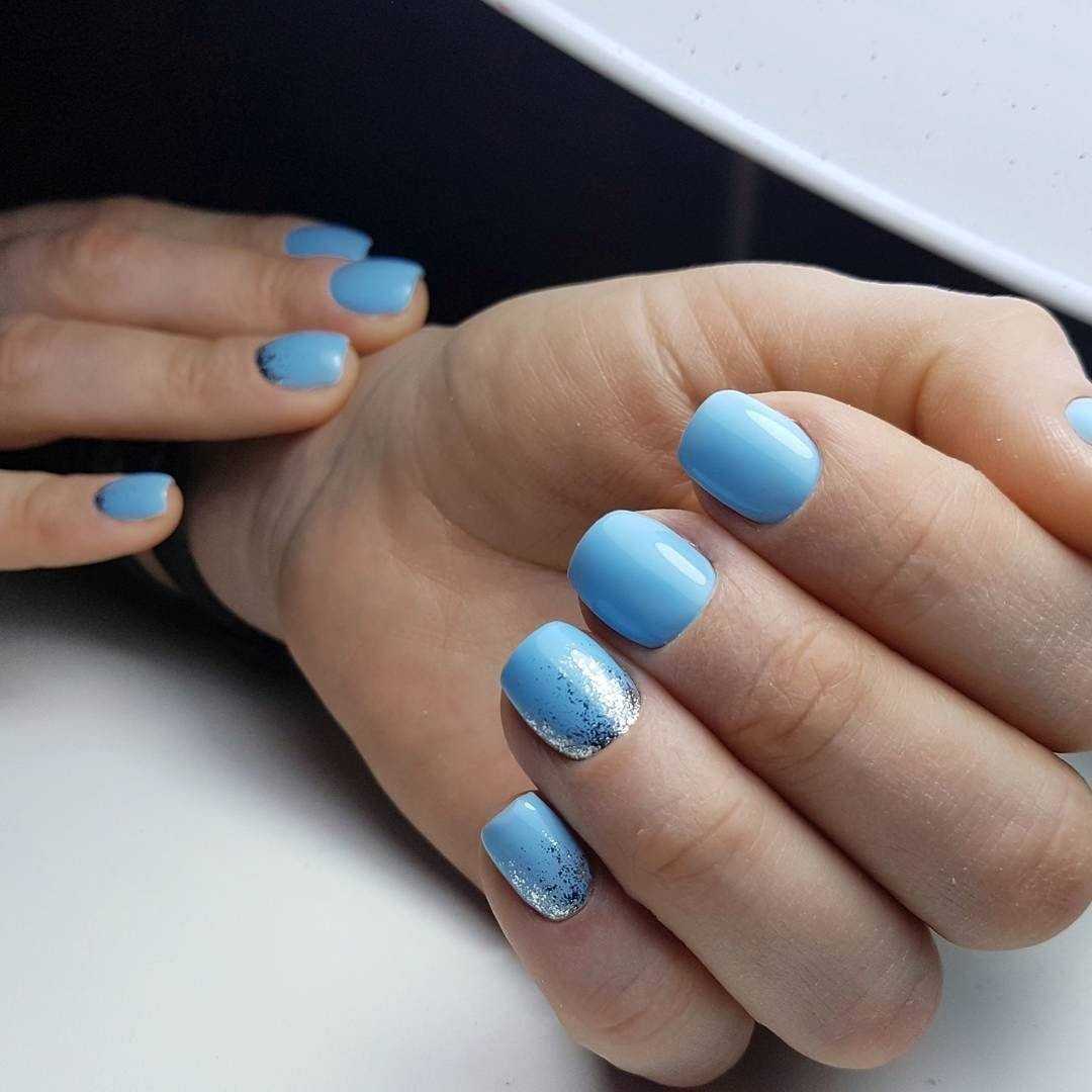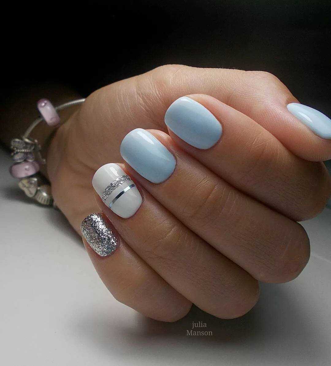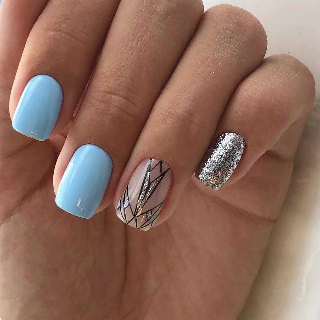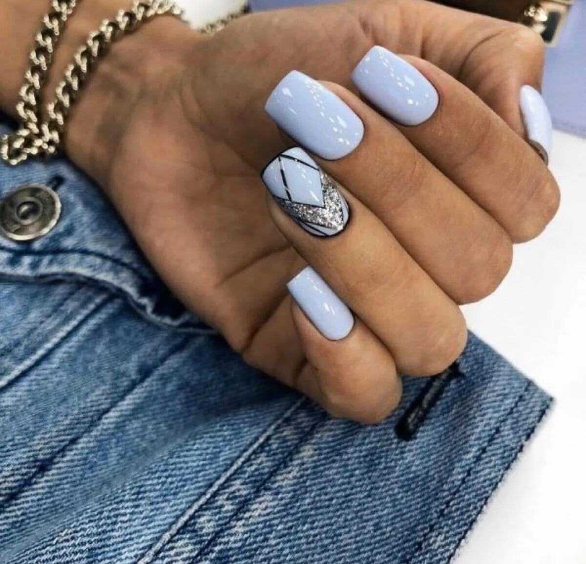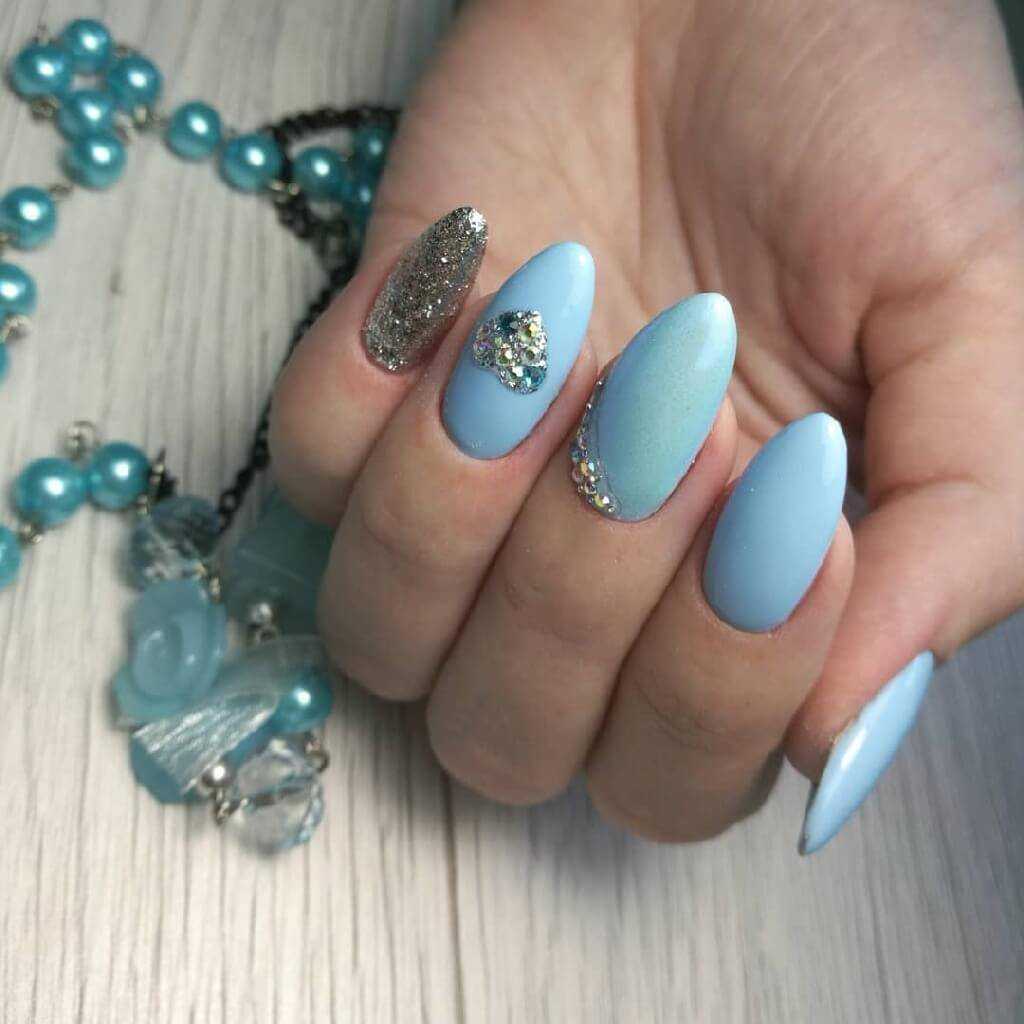 Модный голубой маникюр с дизайном и блестками