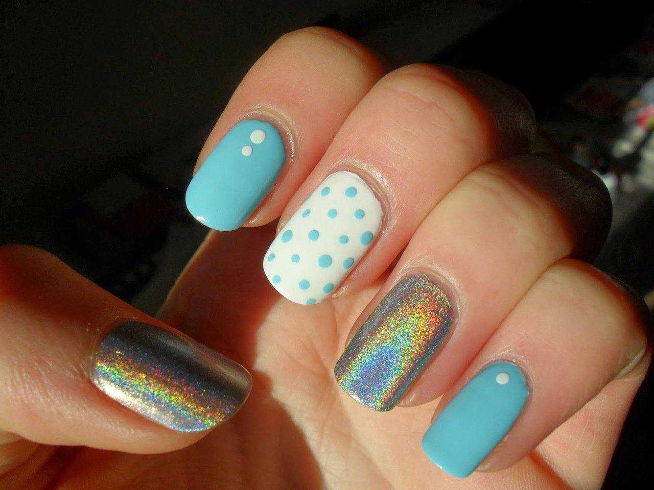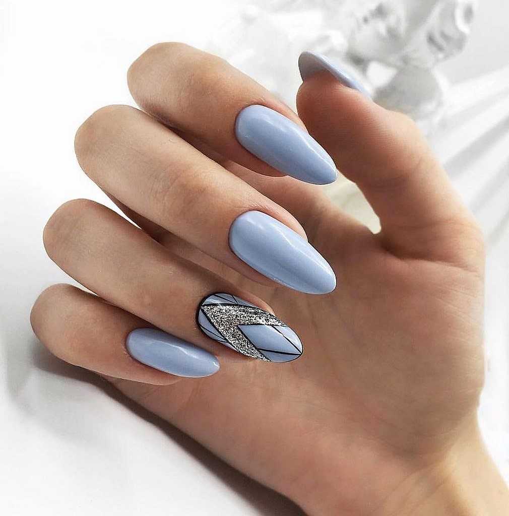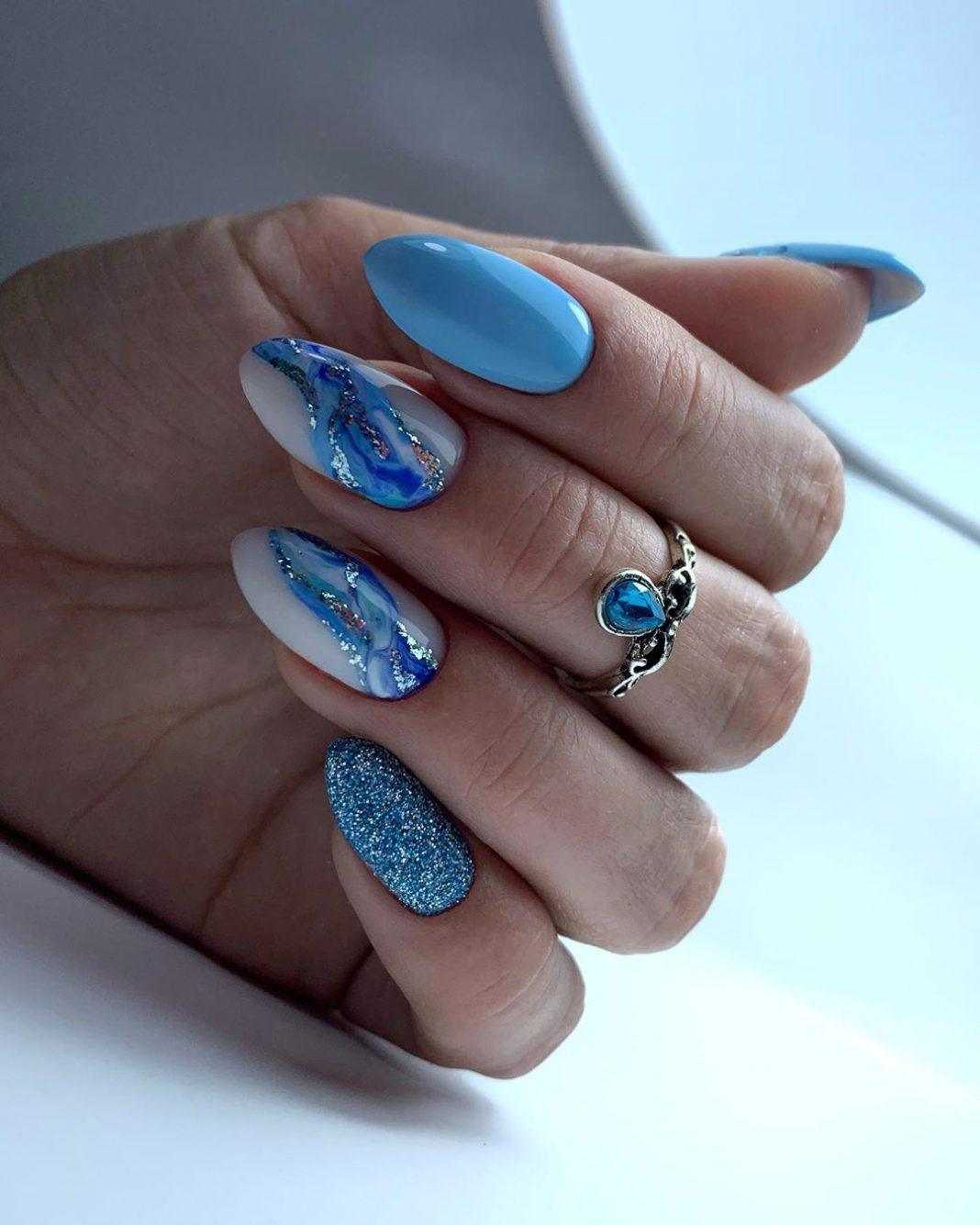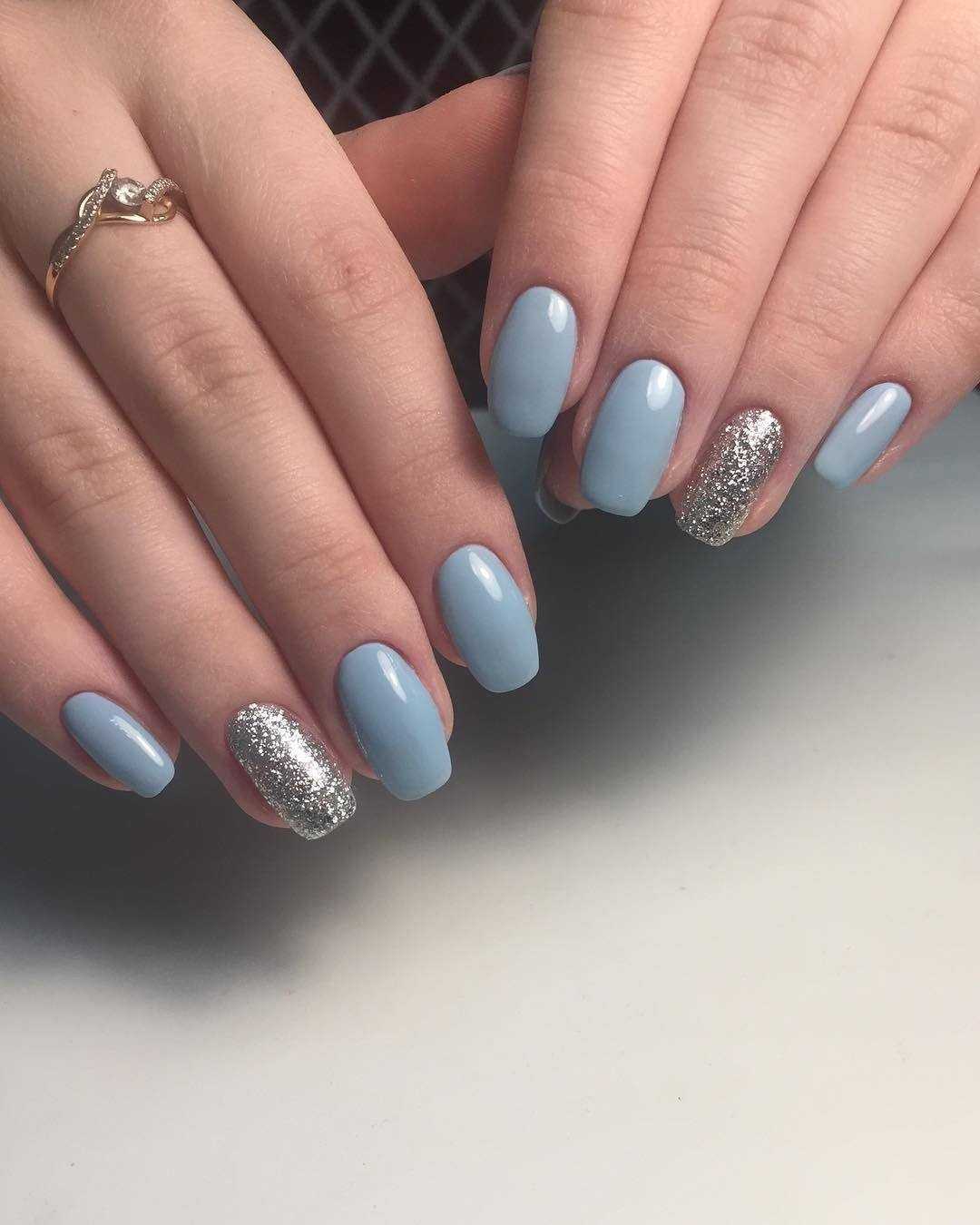Модный голубой маникюр с дизайном и блестками