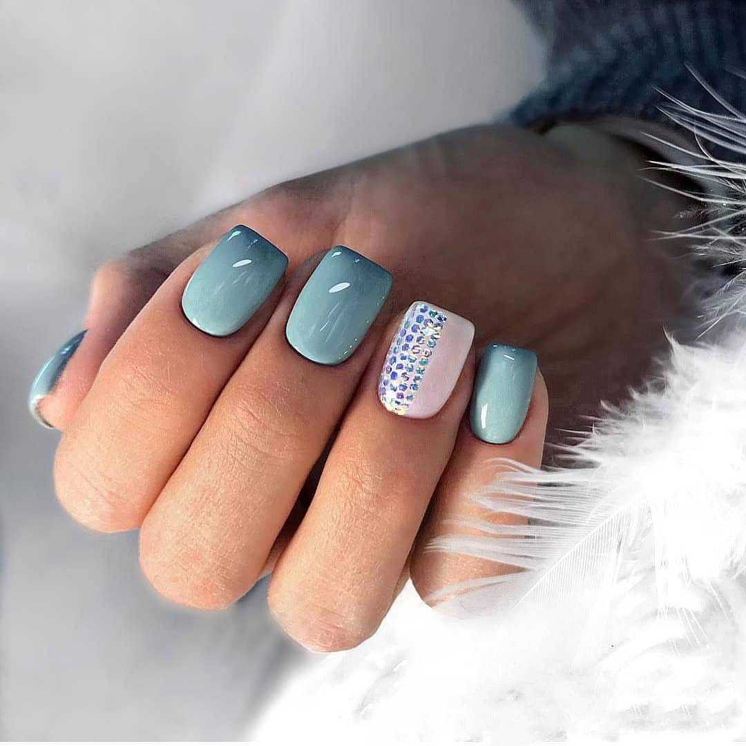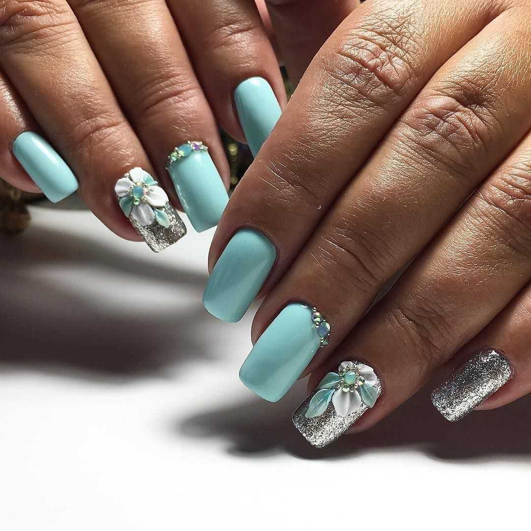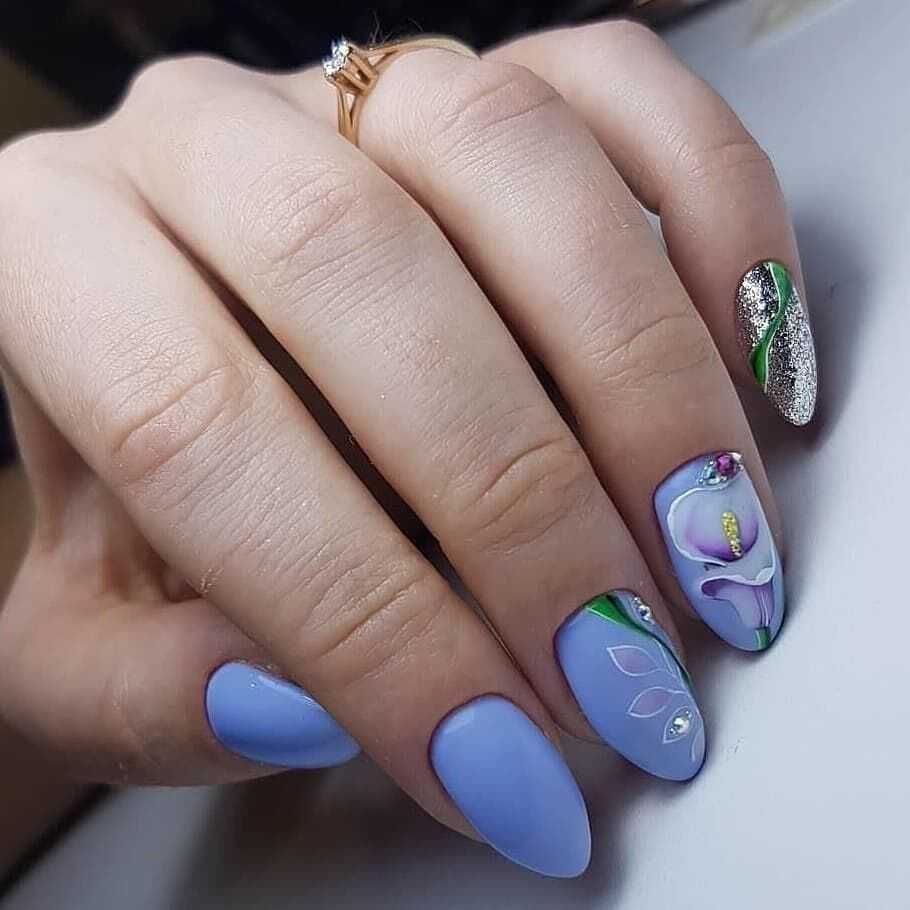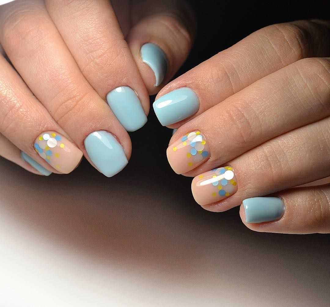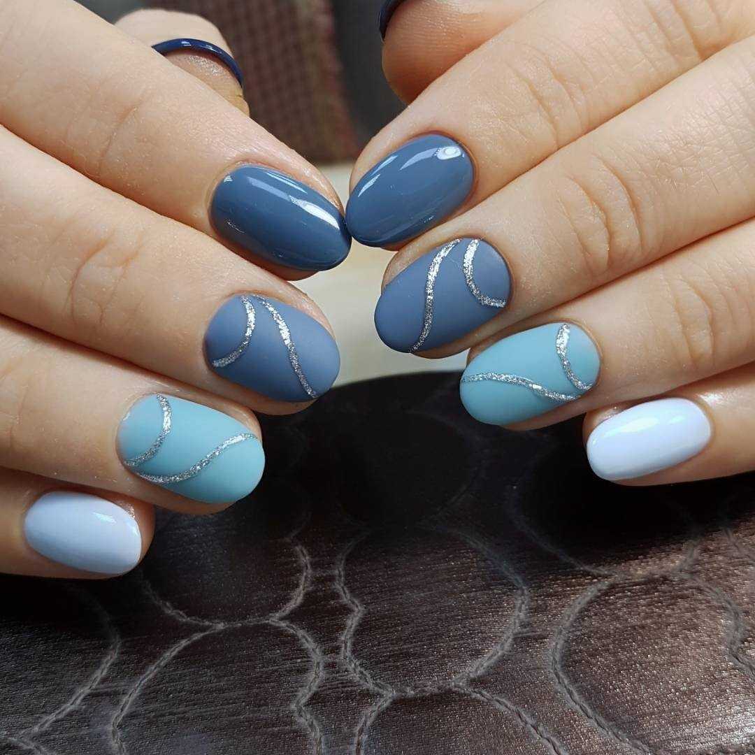 Модный голубой маникюр с дизайном и блестками