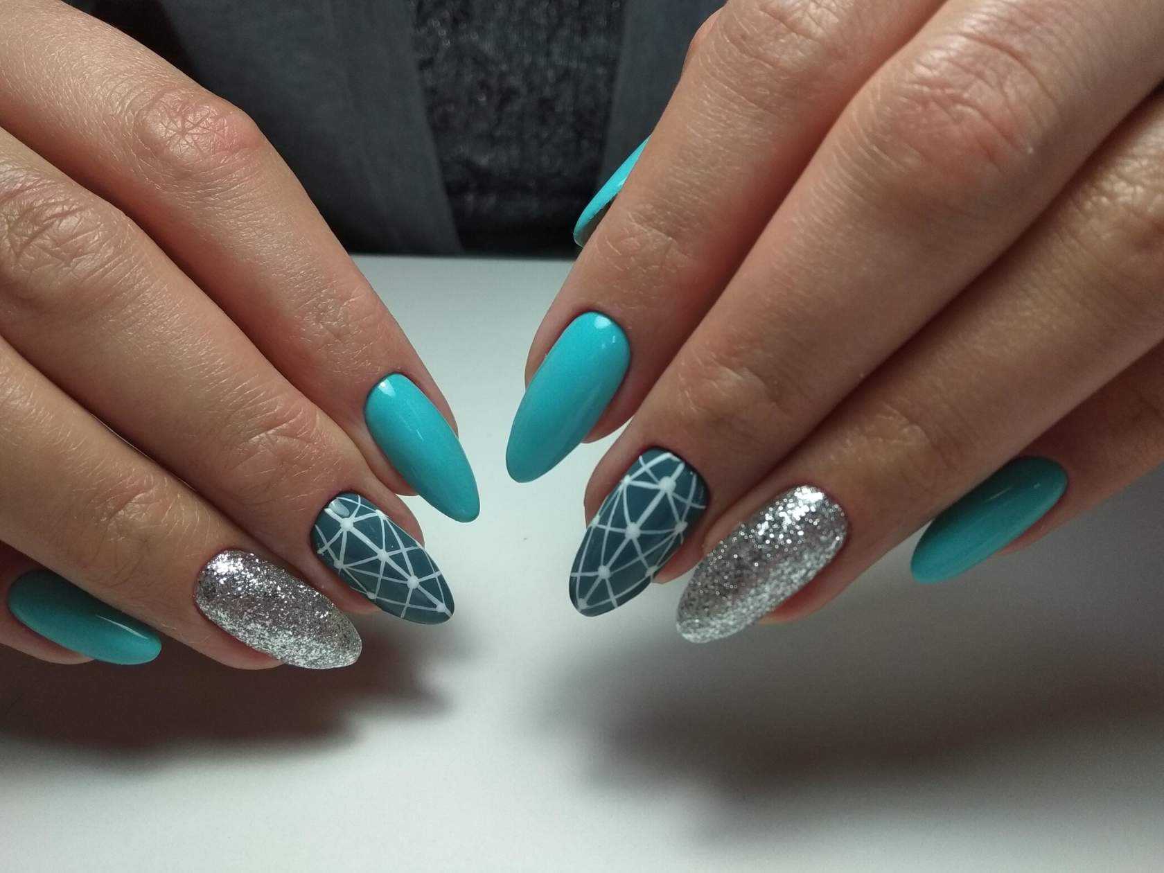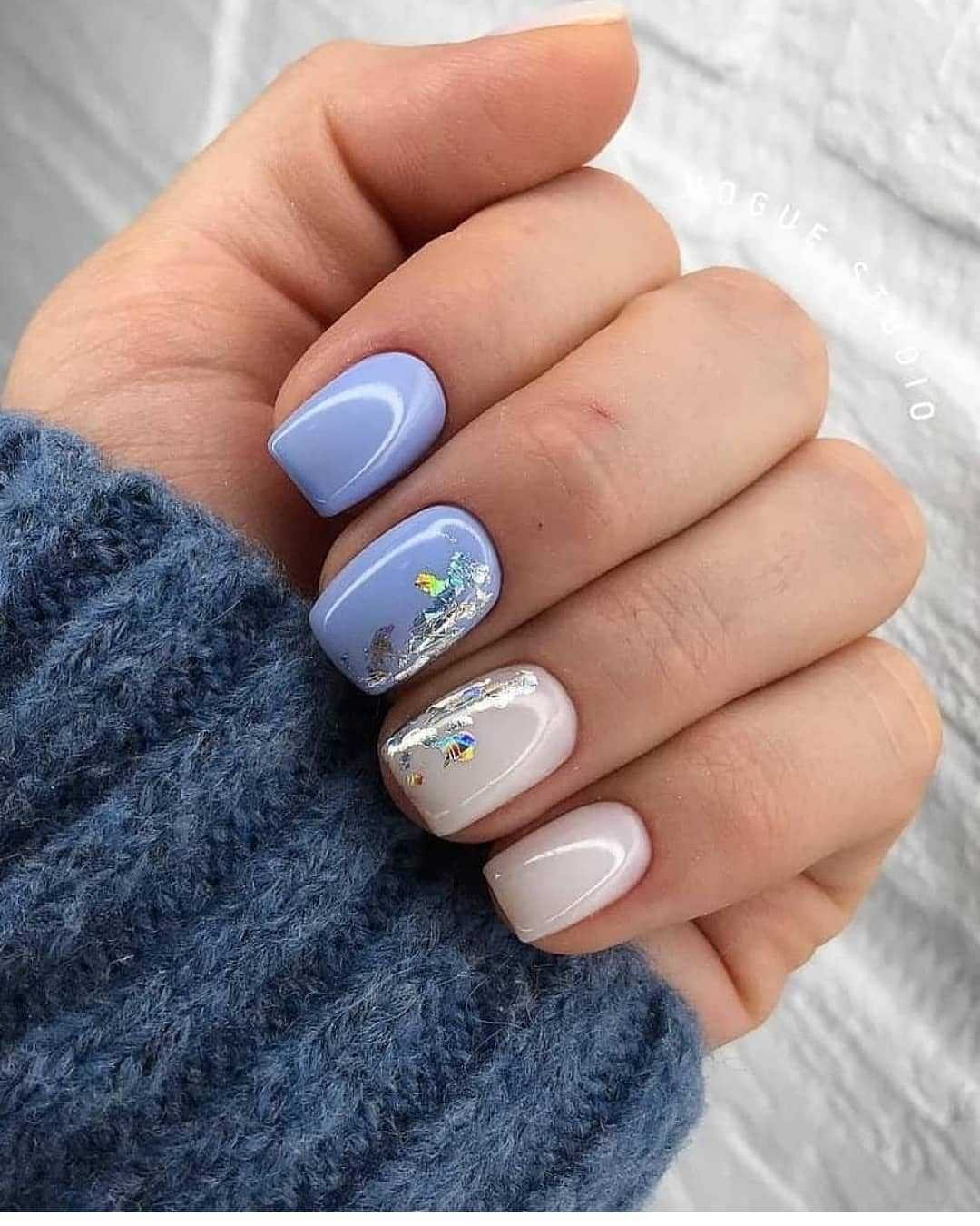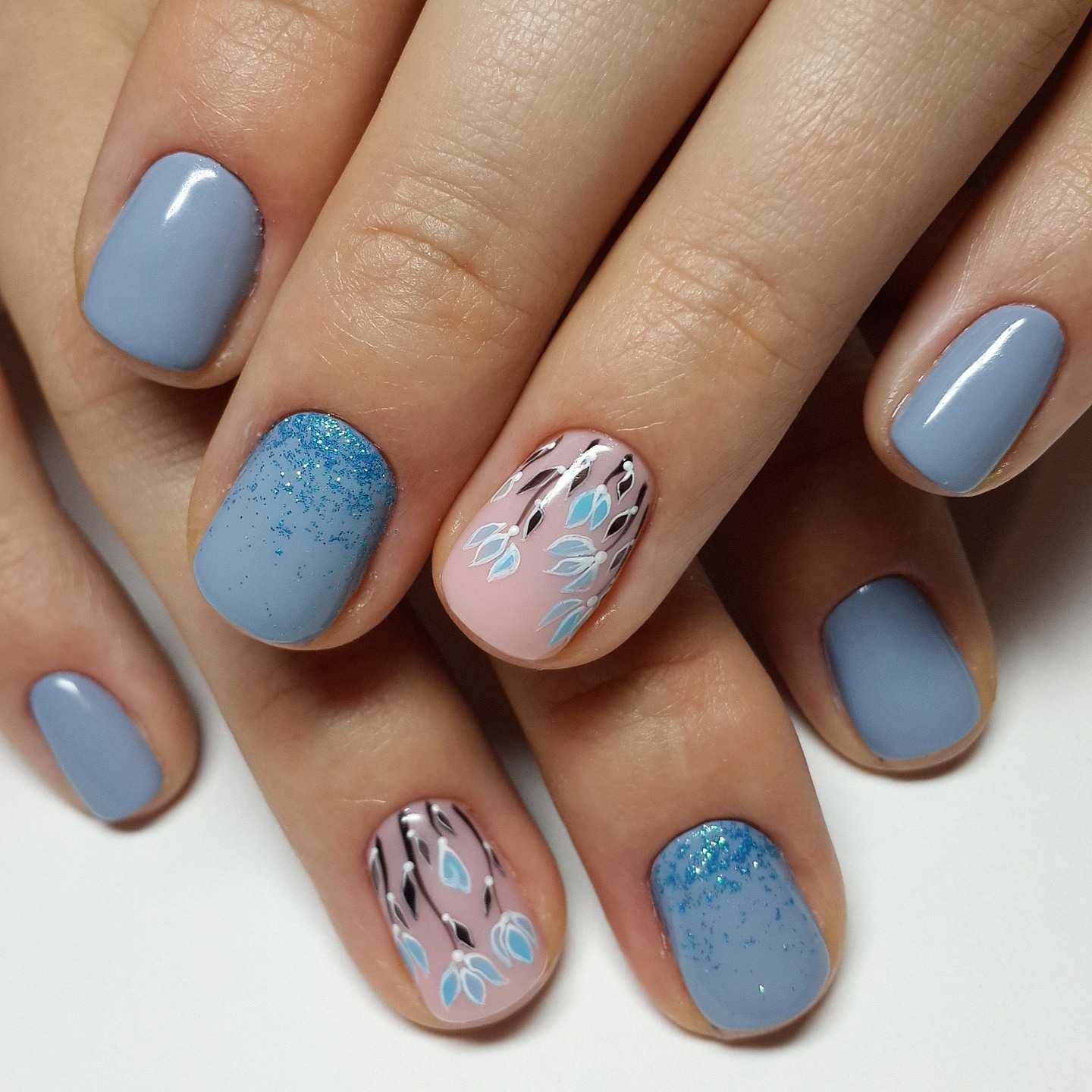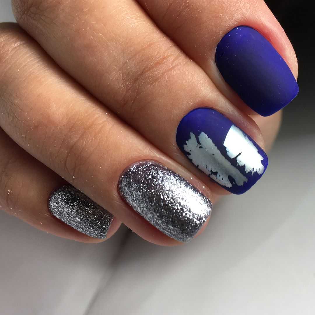 Модный голубой маникюр с дизайном и блестками