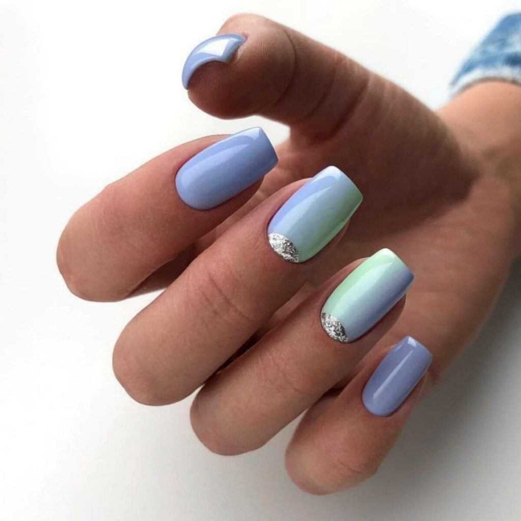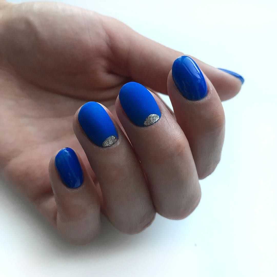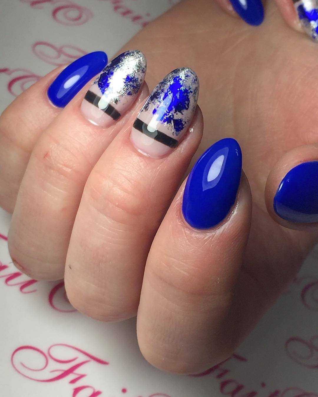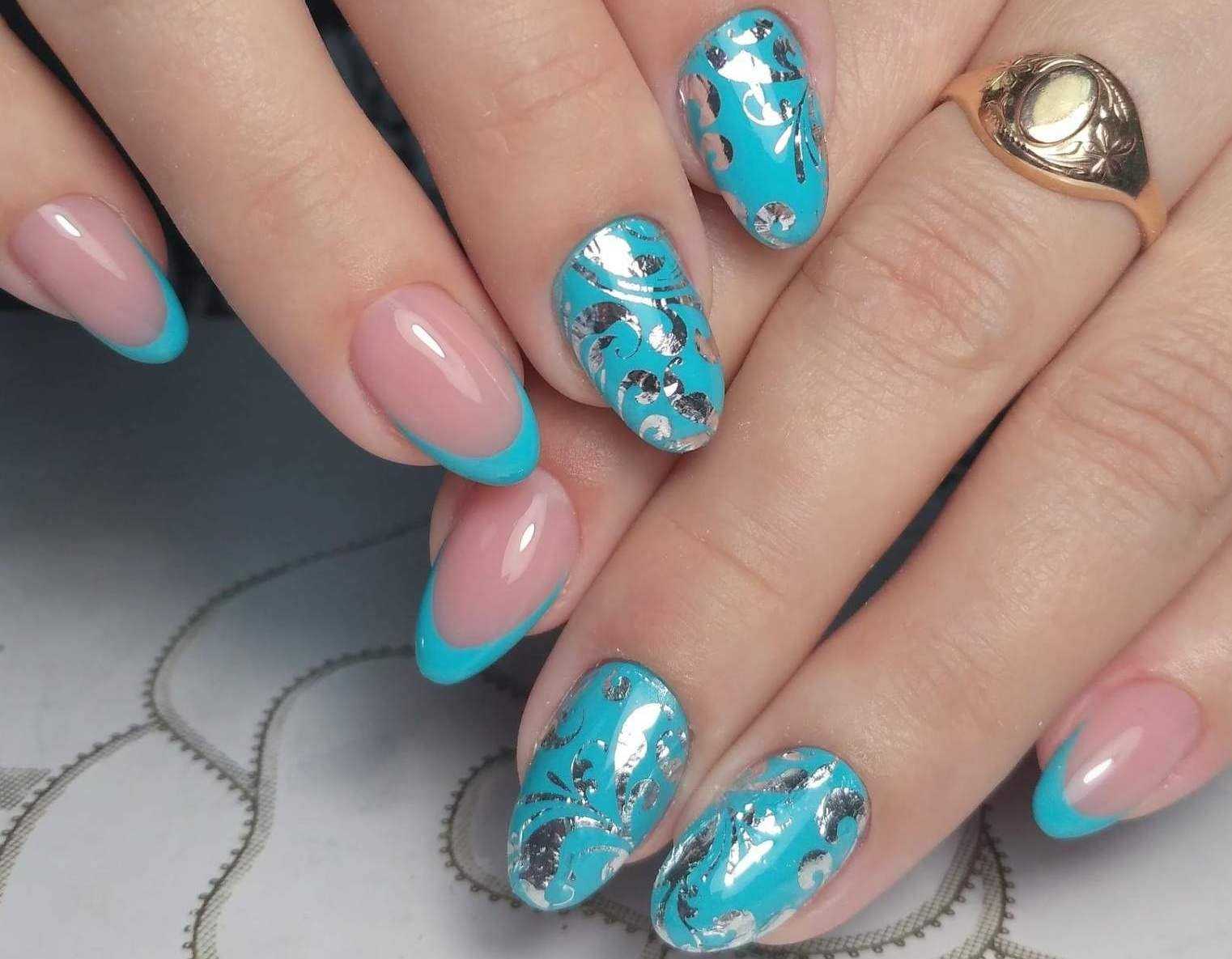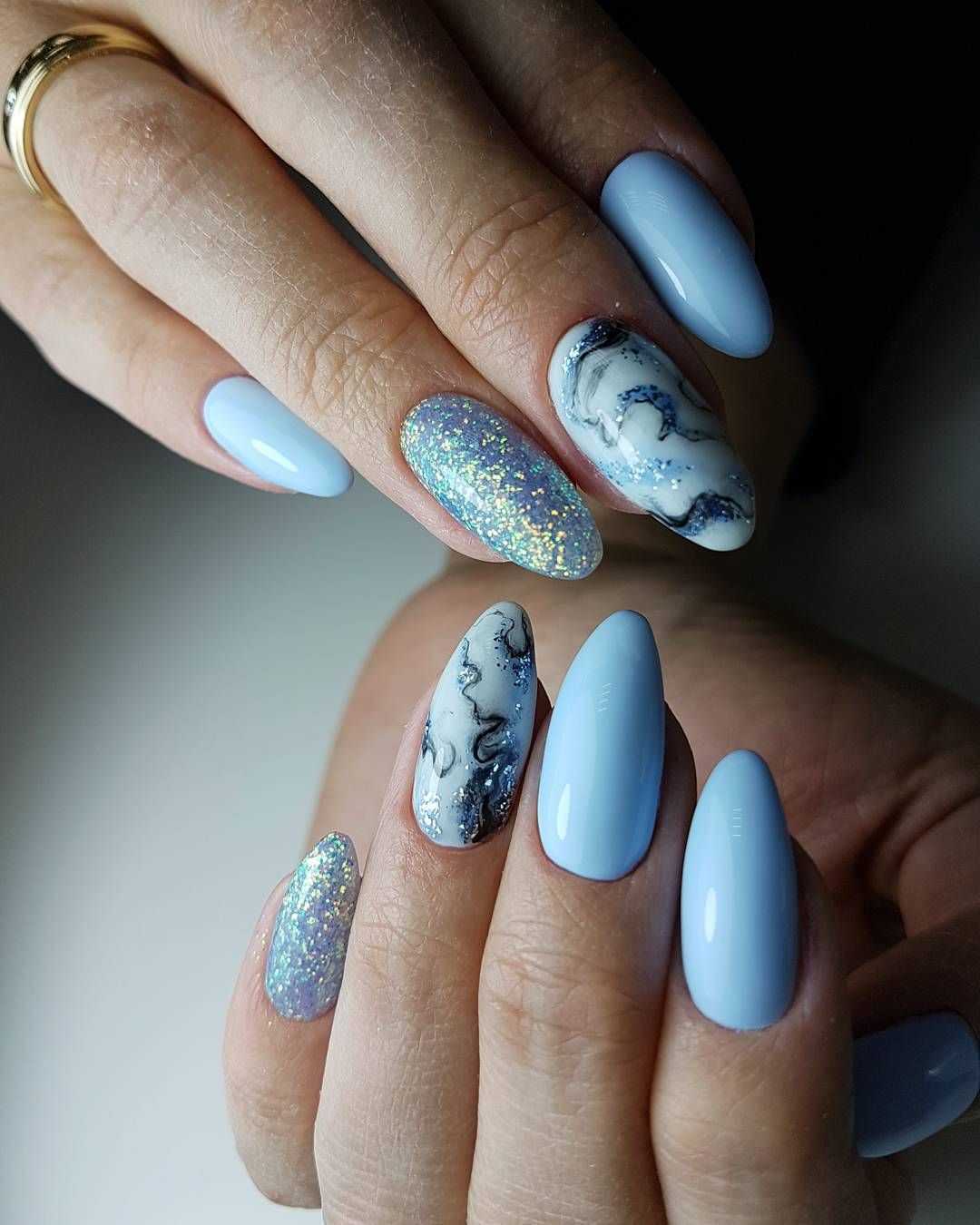 Модный голубой маникюр с дизайном и блестками