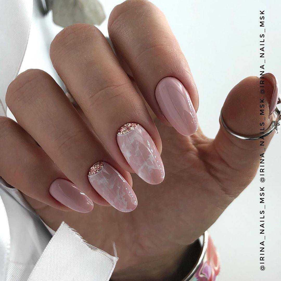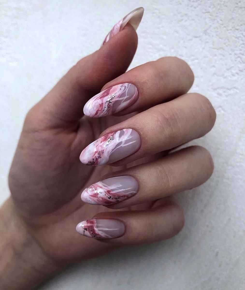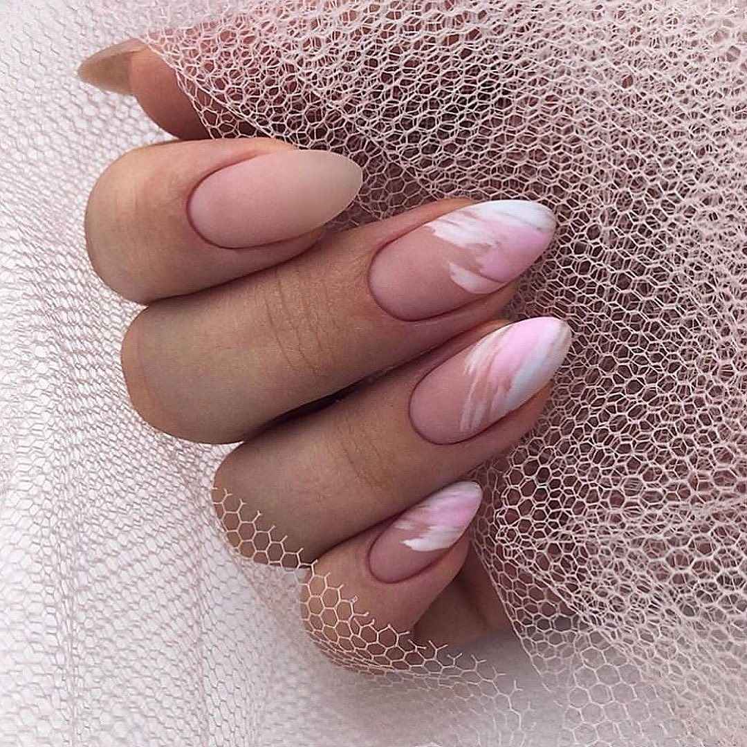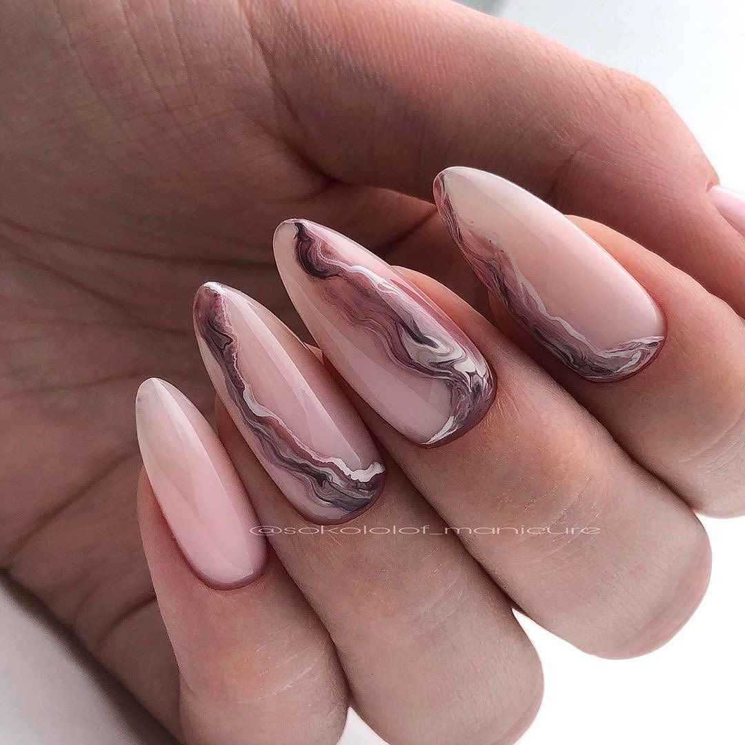 В классическом варианте это белые разводы на розовом фоне. Еще эффектнее и глубже мраморный дизайн смотрится на нюдовых оттенках.