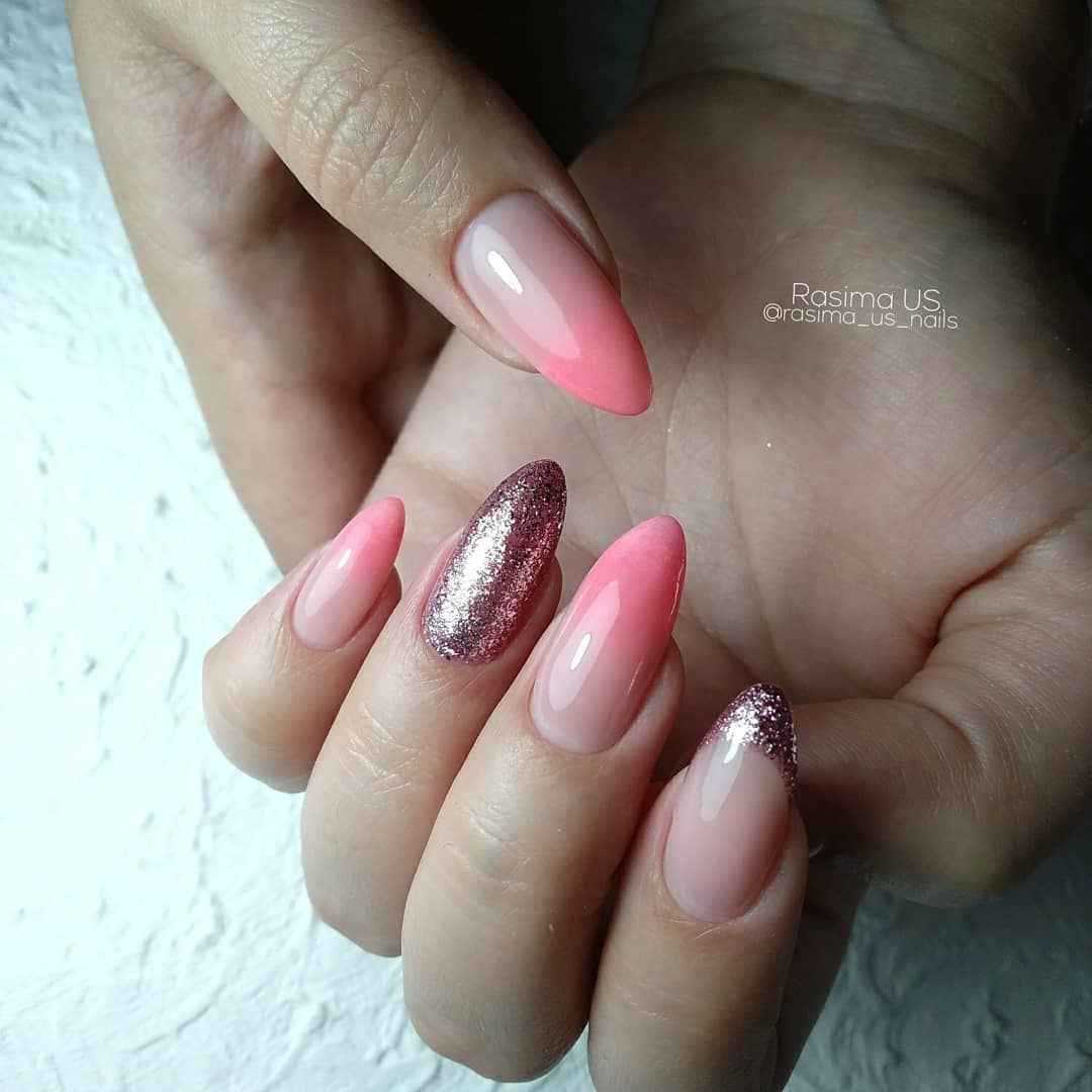 Все эти разновидности блесток великолепно сочетаются с розовым оттенком. В тренде серебряные и золотые блестки, растяжка блестками, сплошное покрытие 1-2 ноготков глиттером, дизайн с втиркой и многое другое. Предлагаем подробнее познакомиться с каждым из этих трендов и выбрать для себя наиболее стильный вариант.