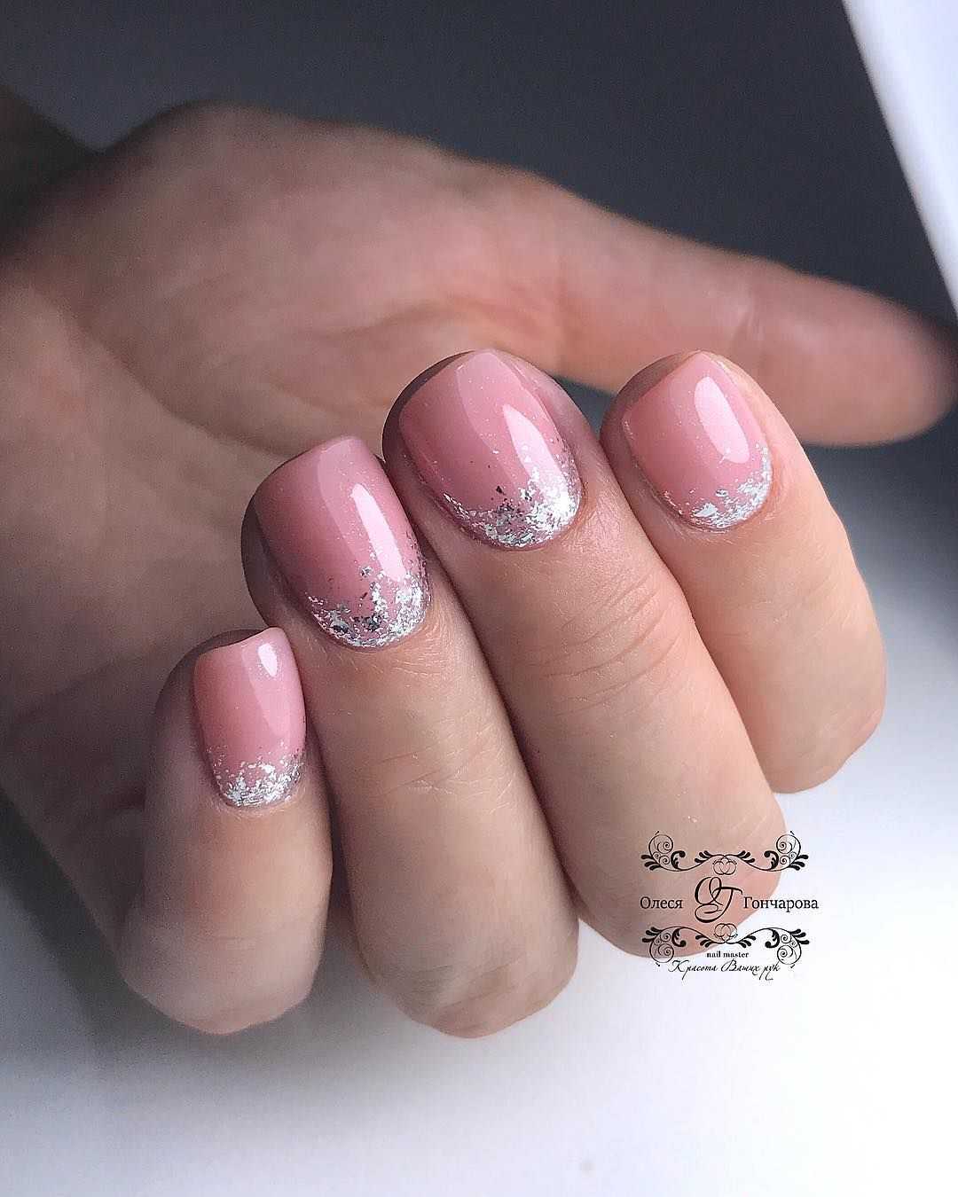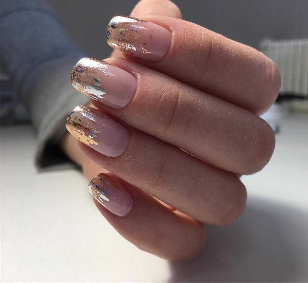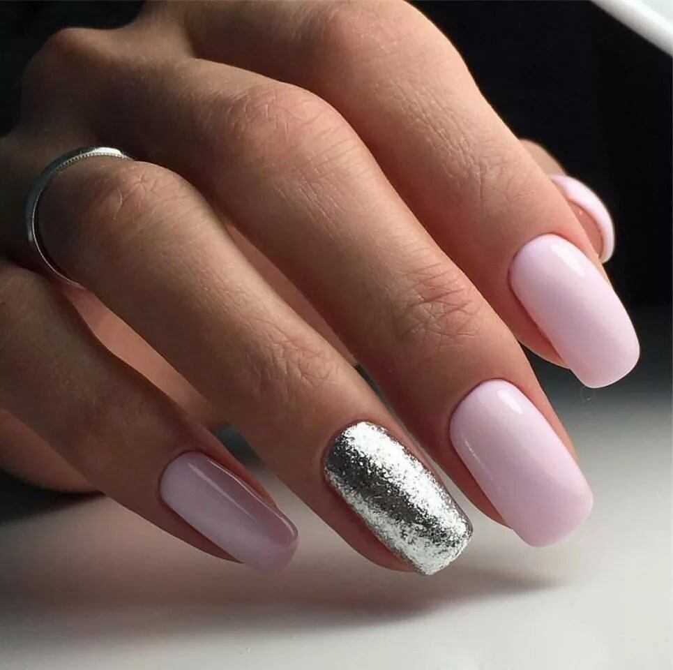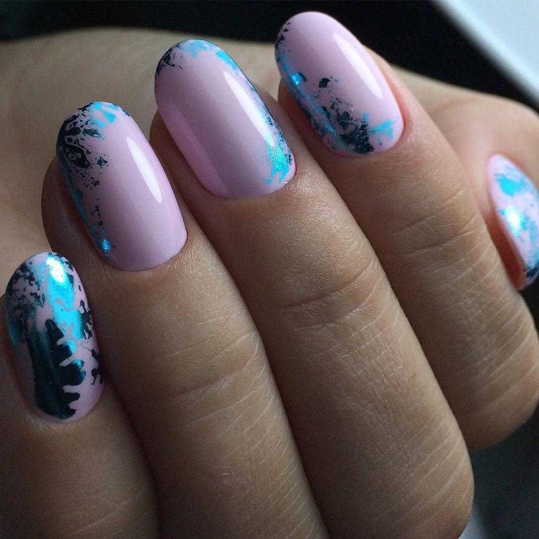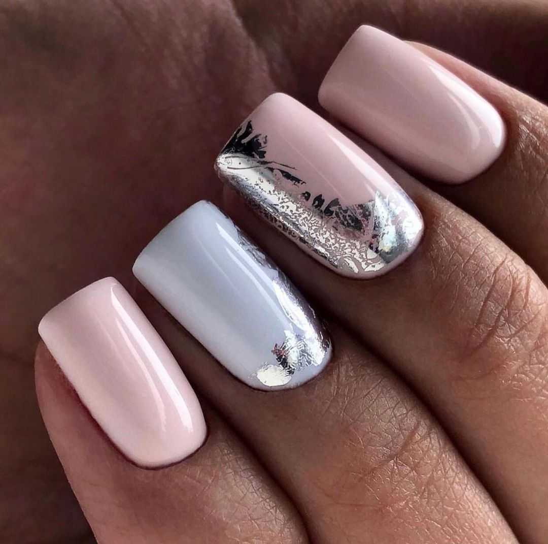 Не менее популярны ногти с золотой и серебряной фольгой. На бледно-розовой основе такой дизайн выглядит особенно привлекательно и очень женственно.