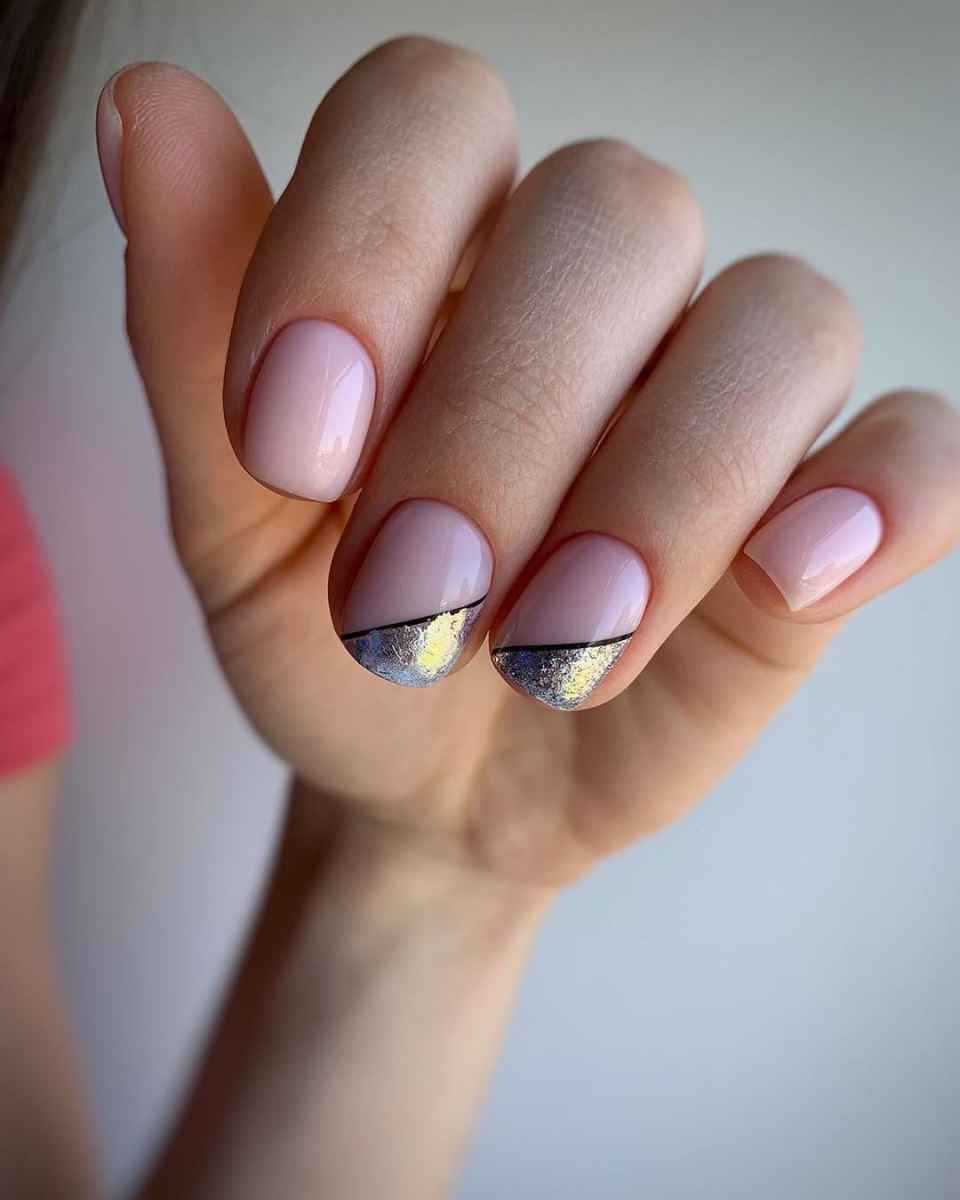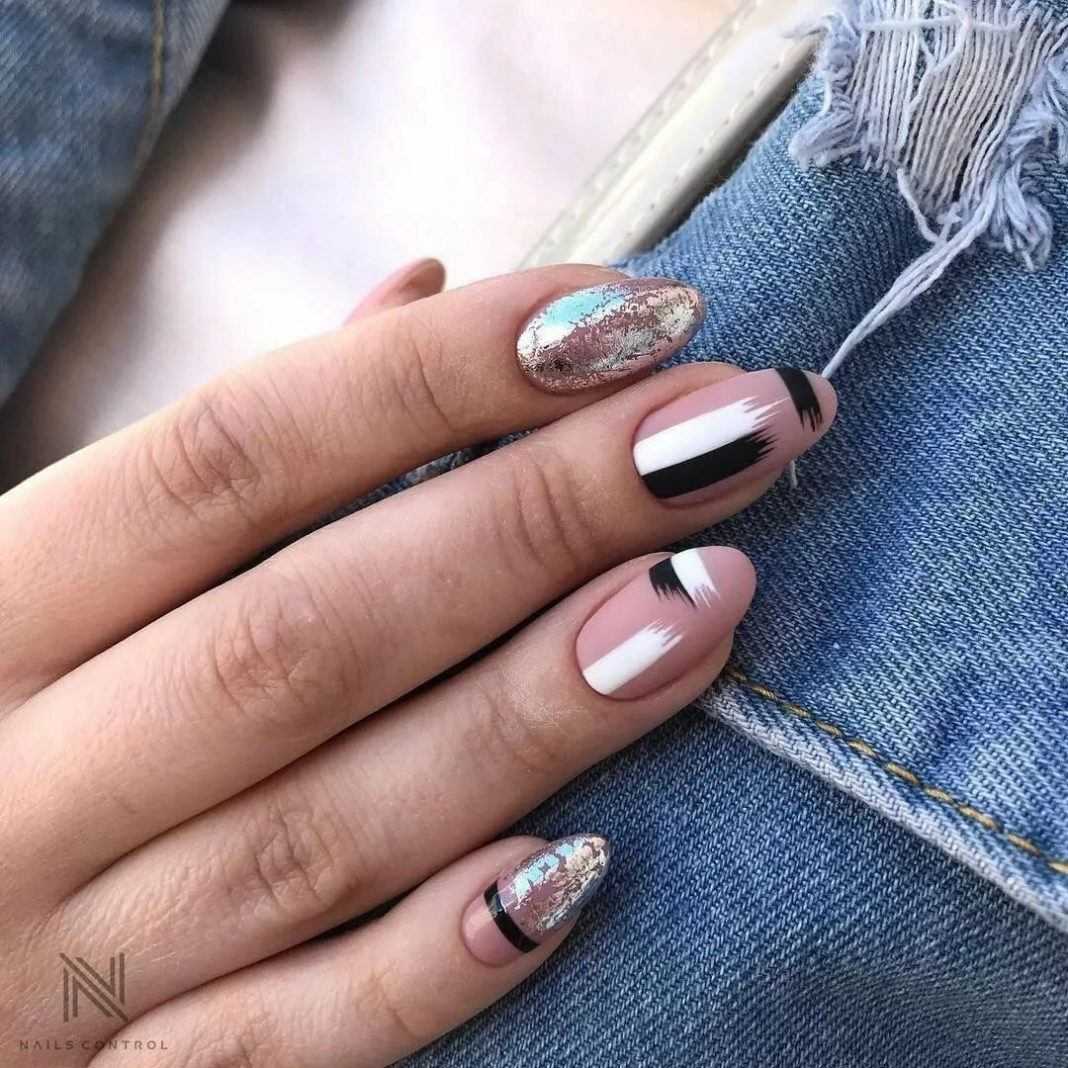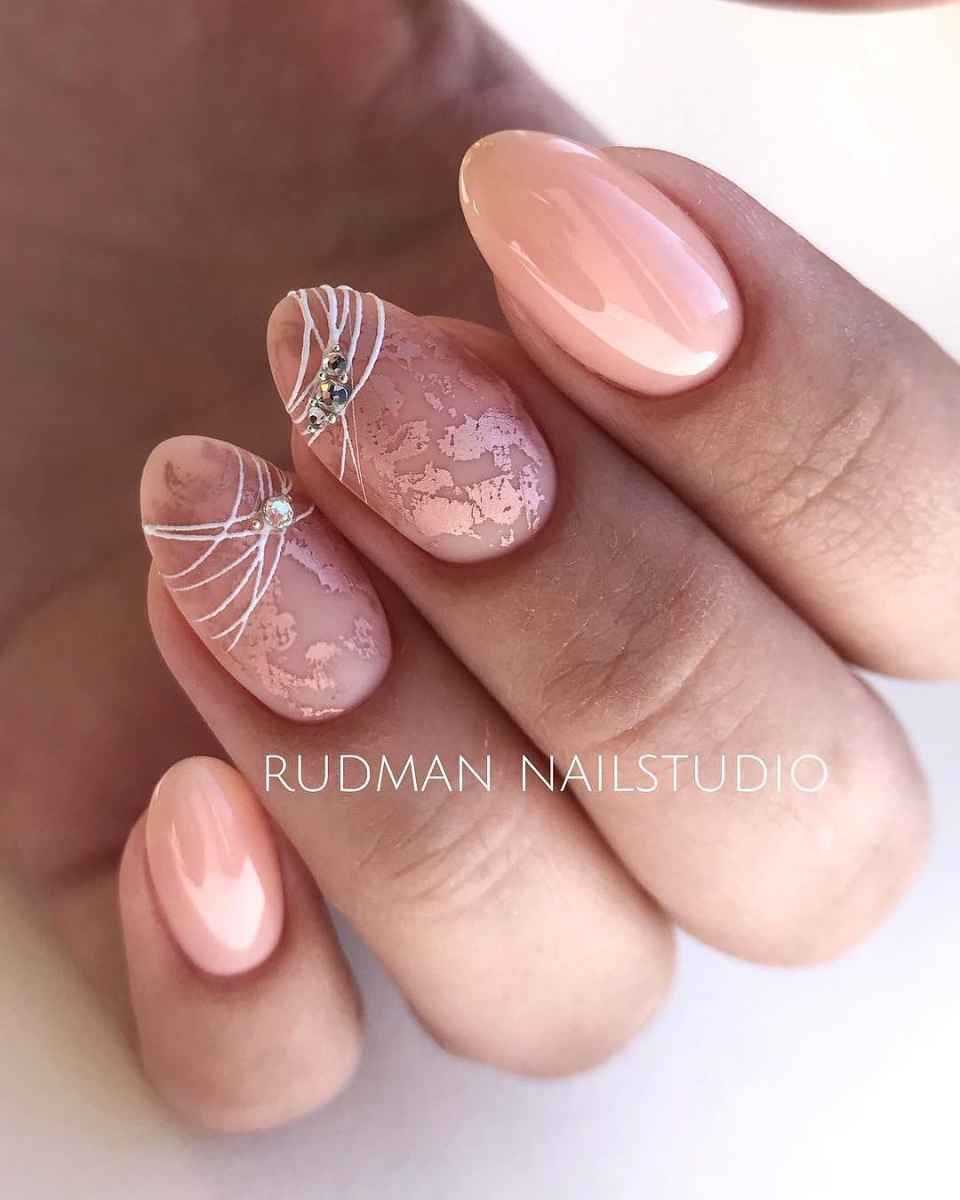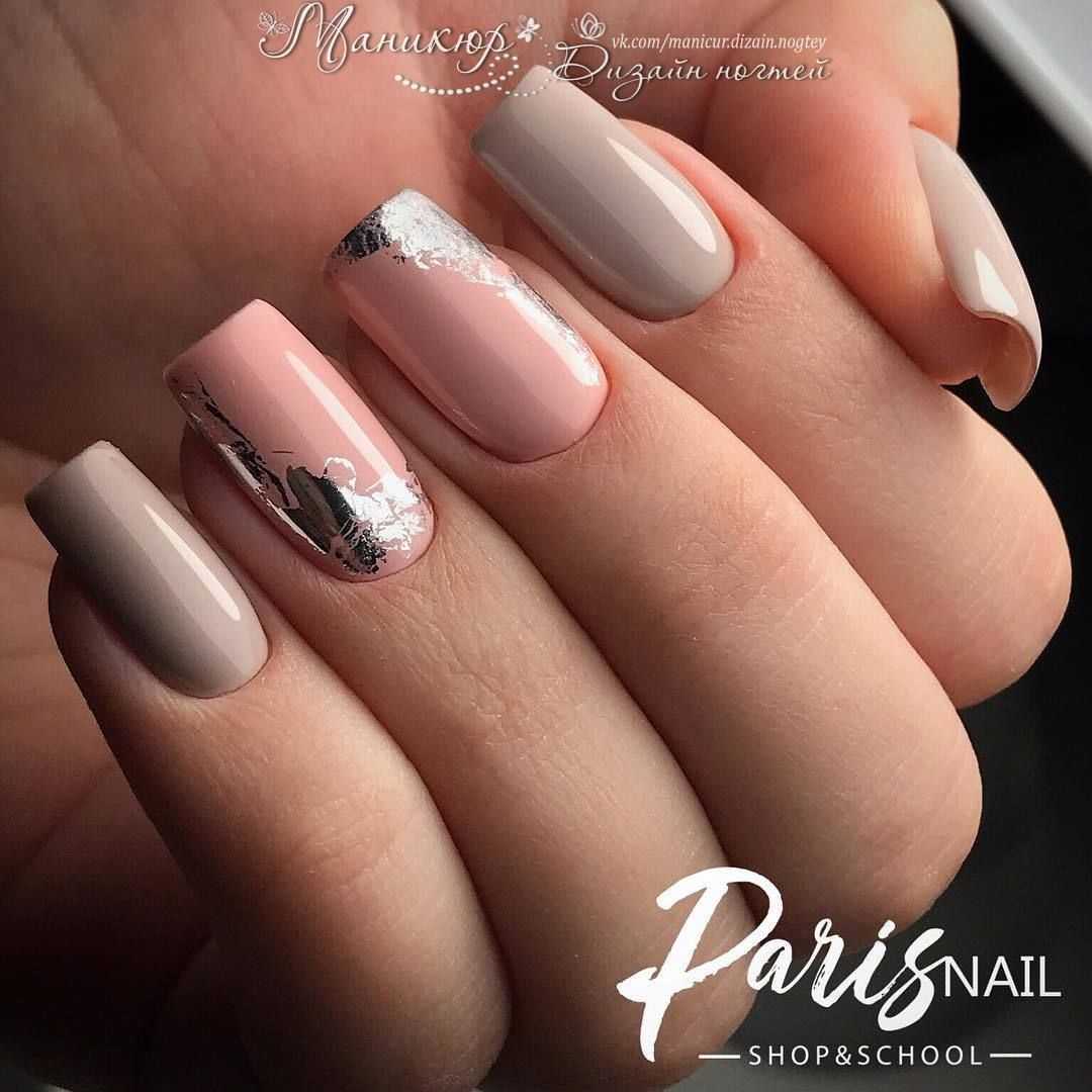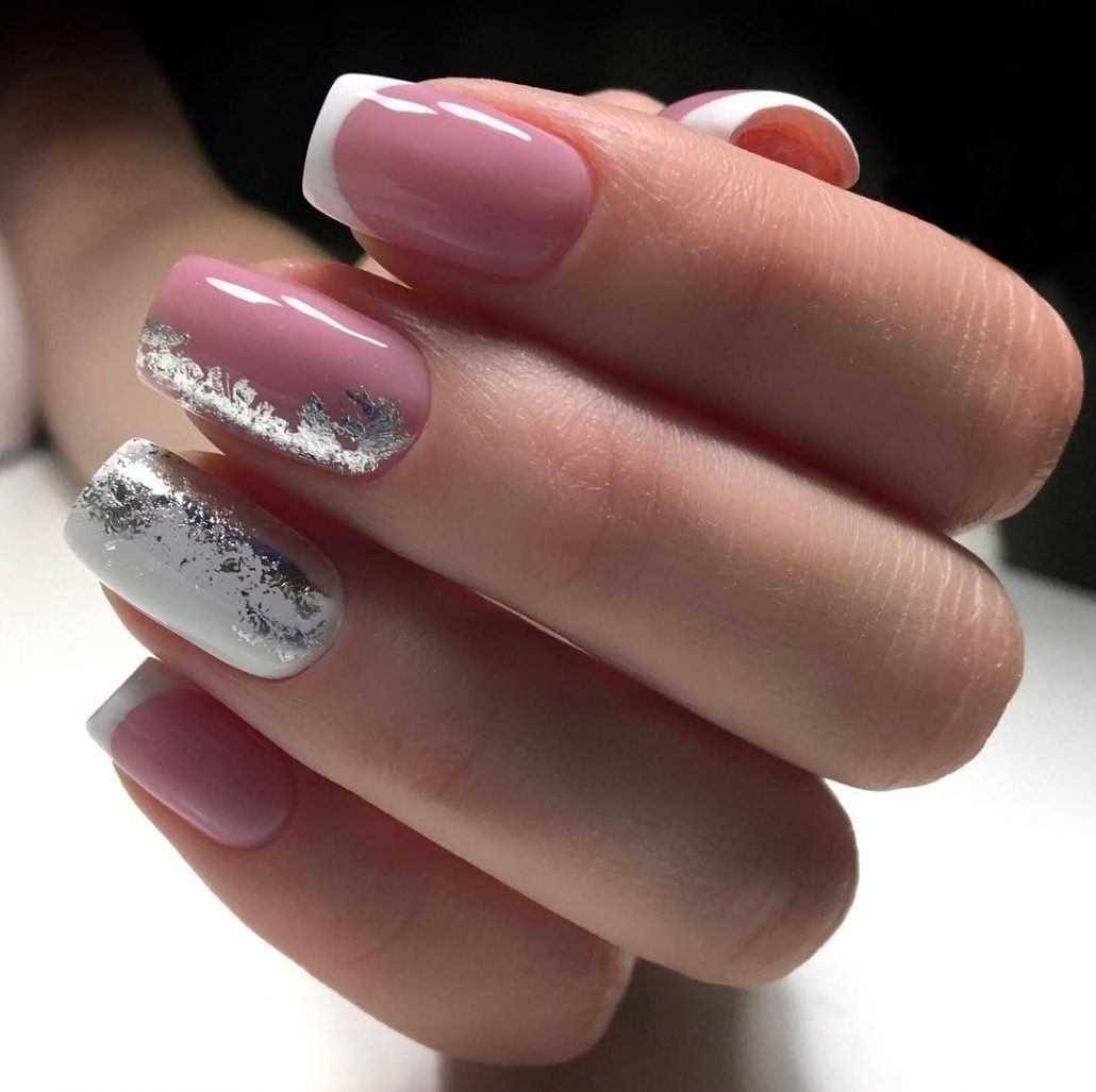 Не менее популярны ногти с золотой и серебряной фольгой. На бледно-розовой основе такой дизайн выглядит особенно привлекательно и очень женственно.
