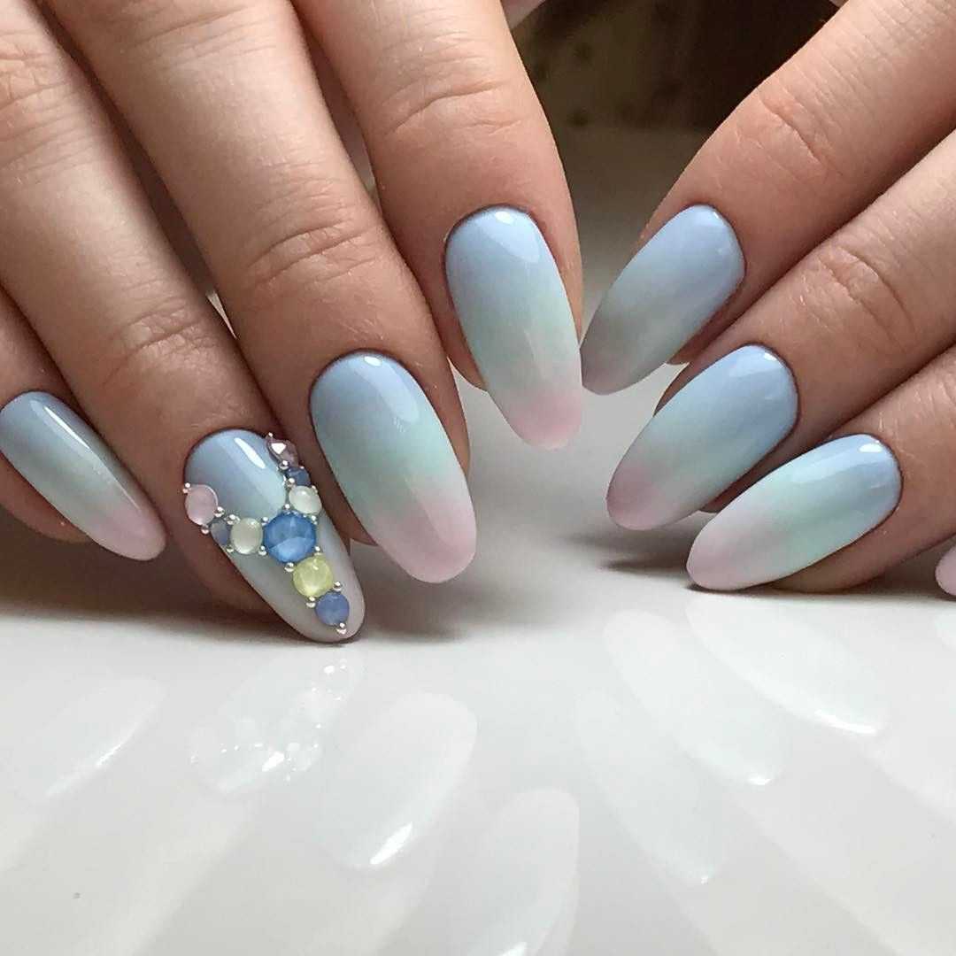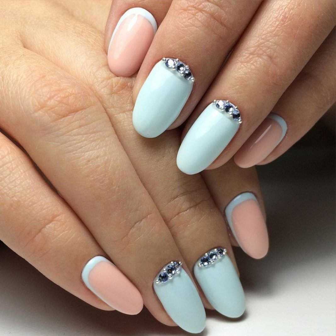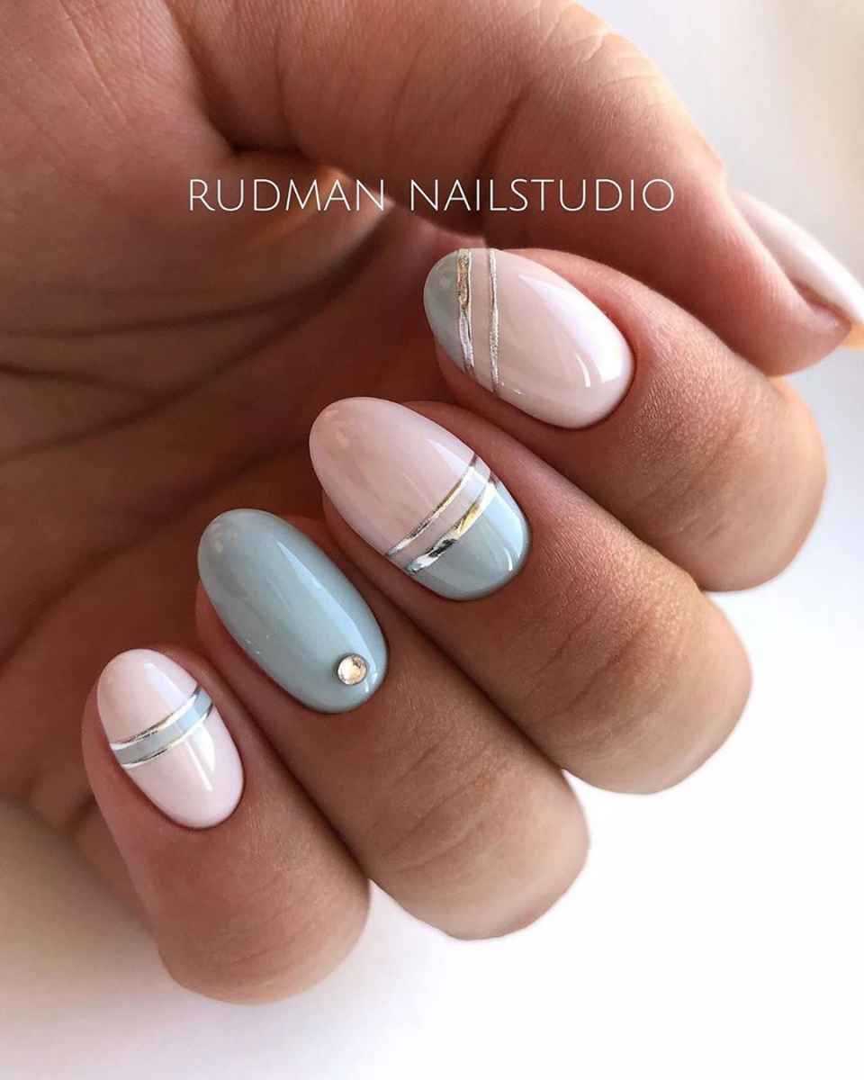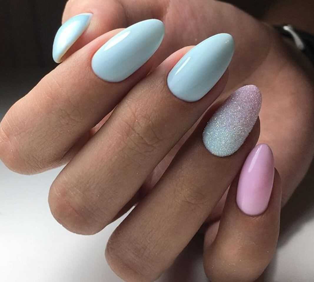 Что касается нежного маникюра на миндальных ногтях, то можно использовать цвета поярче. Например, красиво выглядят нейл-арты в сером, бежевом, бирюзовом, голубом, ярком розовом цветах. Если вы все же хотите получить нежный дизайн ногтей, то выбирайте молочный цвет, полупрозрачные и прозрачные текстуры.