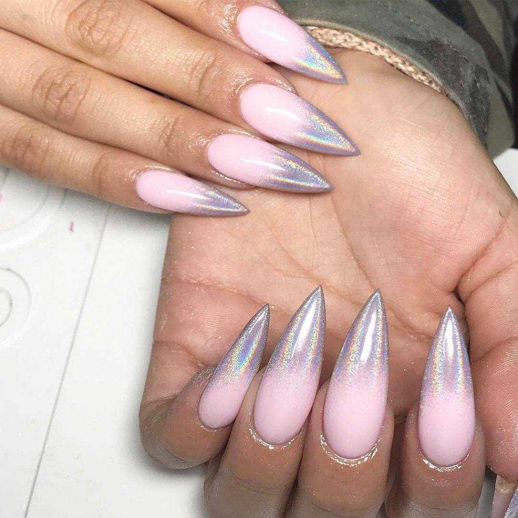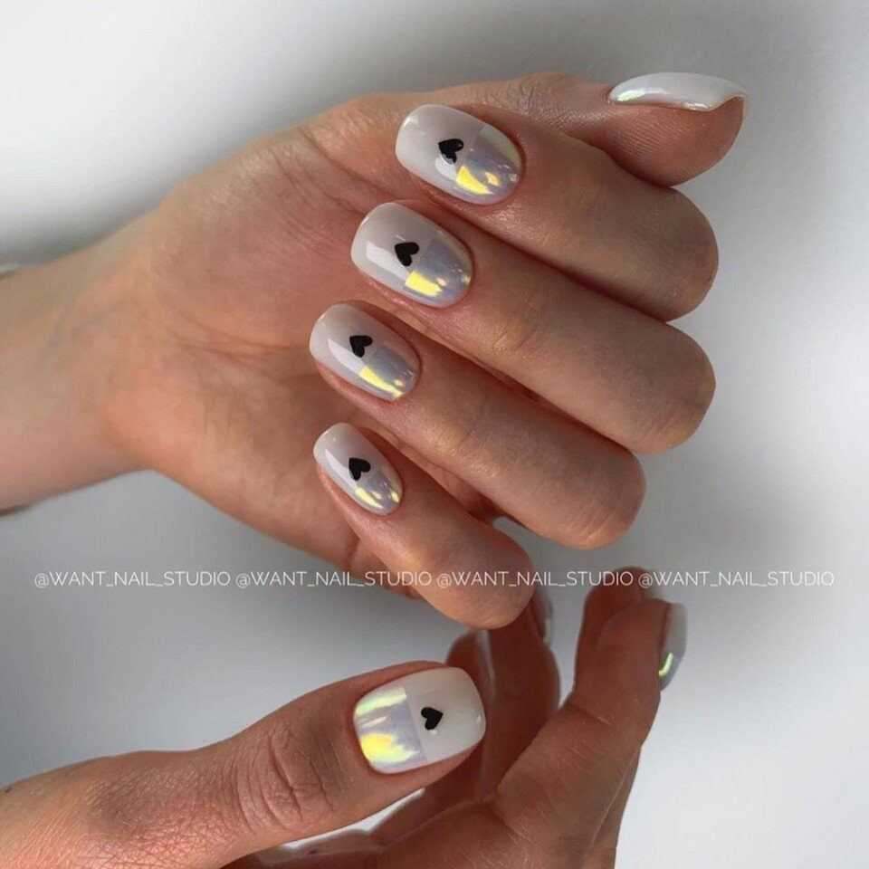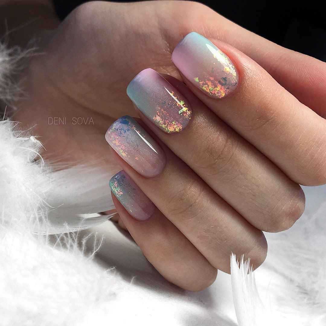 Этот дизайн вопреки устоявшемуся мнению хорош не только на черном фоне. Используйте битое стекло с эффектом “единорог” либо “хамелеон”. Переливаясь разными цветами и играя, они делают ноготки не только нежными, но и необычайно красивыми.