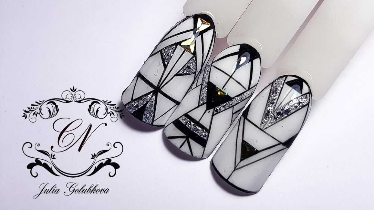 Для завершения этого дизайна необходимо предварительно нанести геометрический узор. Для этого можно использовать длинную щетку для волос, металлическую ленту, тиснение или трафарет. После нанесения дизайна на ногти пространство между линиями заполняется гель-лаком с блестками. Для этого используйте щетку с короткими тонкими волосами. Если у вас нет гель-лака с блестками, вы можете сделать это самостоятельно. Для этого смешайте на палитре рассыпчатые блестки и топ.