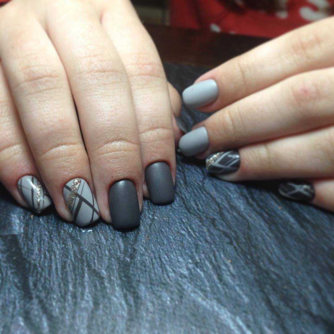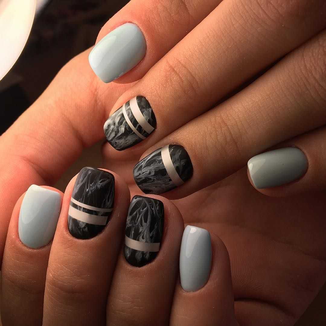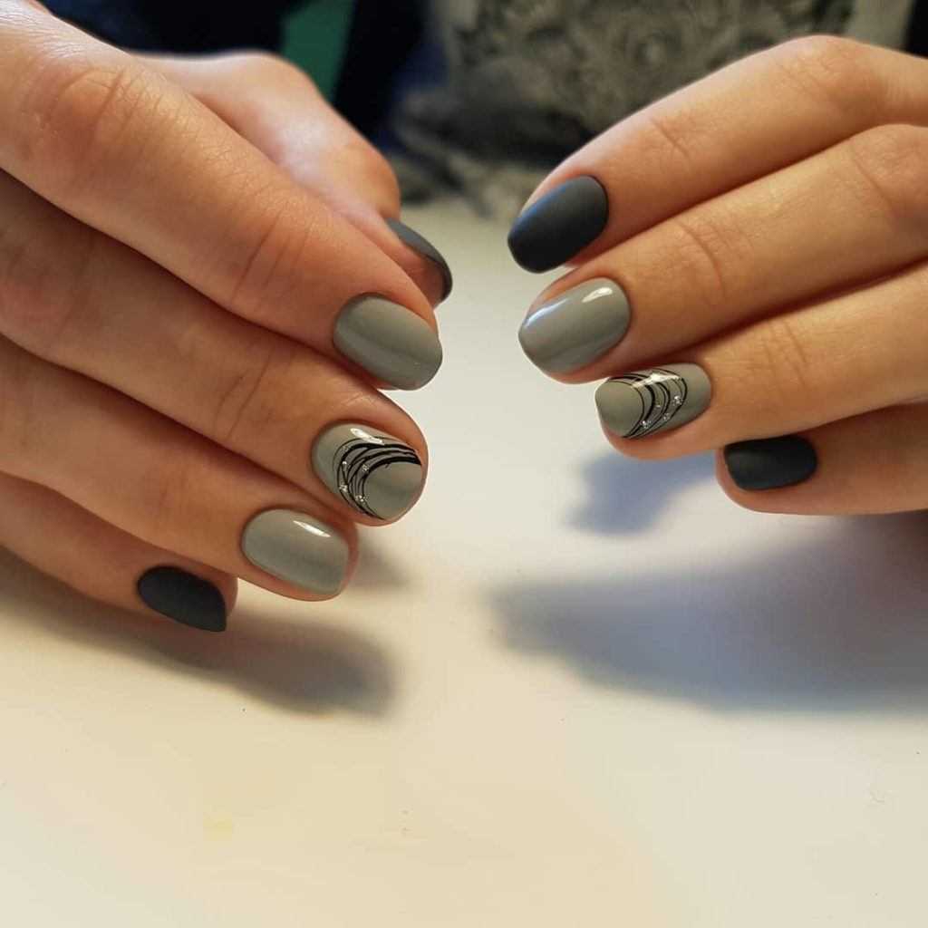 Маникюрный дуэт серого и чёрного лака смотрится не менее привлекательно, чем композиции с другими оттенками. Чёрный при этом может использоваться как для полного покрытия ногтевых пластин, так и для прорисовки деталей и выделения некоторых областей ноготка. В качестве примера, мы предлагаем покрыть два-три ноготка чёрным цветом, а на остальные нанести выбранный серый тон и украсить лунки при помощи блёсток. Не менее интересно смотрятся на светло-сером фоне чёрные вуалевые рисунки и всевозможные завитки с блестящей прорисовкой, геометрические изображения и флористические фрагменты в стиле минимализм. Модный чёрно-серый тандем лаков – это анималистика, мрамор, маникюр с рамкой, абстрактные потёки и «острова» на прозрачной основе. Какой из дизайнов украсит ваши ноготки, зависит только от вашего предпочтения.