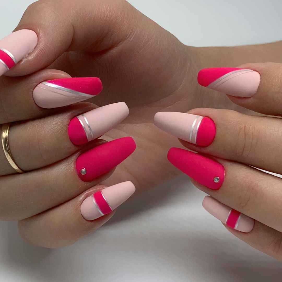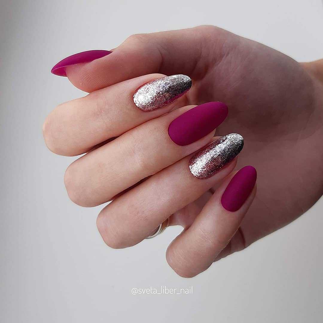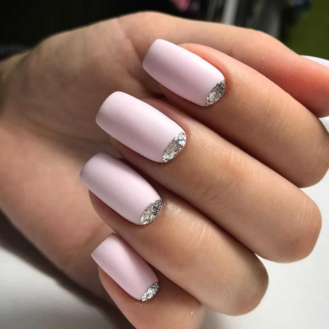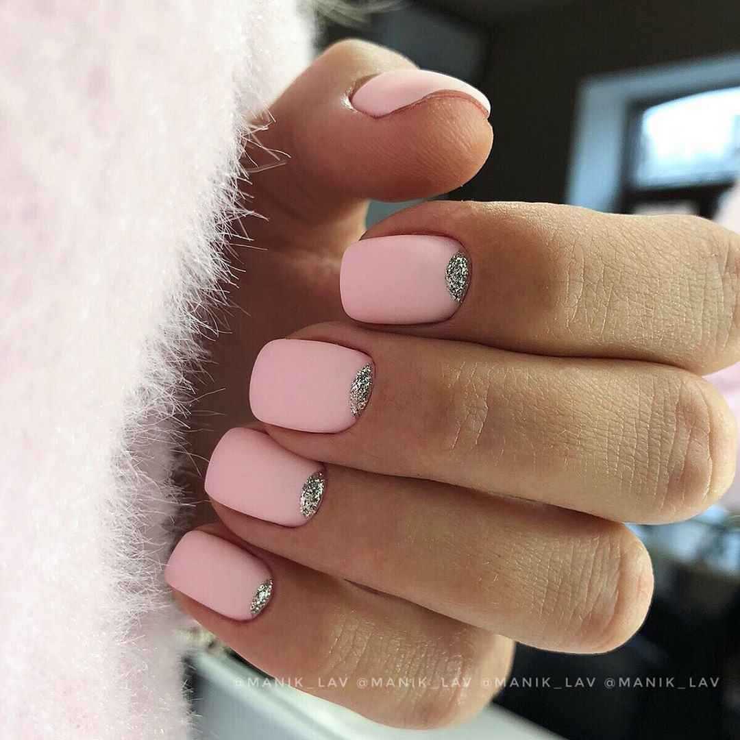 Розовые оттенки всегда ассоциировались с нежностью и романтикой, поэтому подобные идеи обязательно придутся по душе тонким и чувствительным натурам. Матовый маникюр в розовых тонах с использованием блёсток может выполняться в различных вариациях, поскольку любая его интерпретация способна дополнить образ нотками женственности и лёгкости. Даже если речь идёт о покрытии ногтевых пластин оттенком фуксии или малиновым. Блестящими частицами можно выделить безымянный палец или оформить дизайн в стиле френча. Не менее красиво и изысканно будут смотреться сверкающие узоры на матовой основе, блестящая растяжка и многие другие идеи.